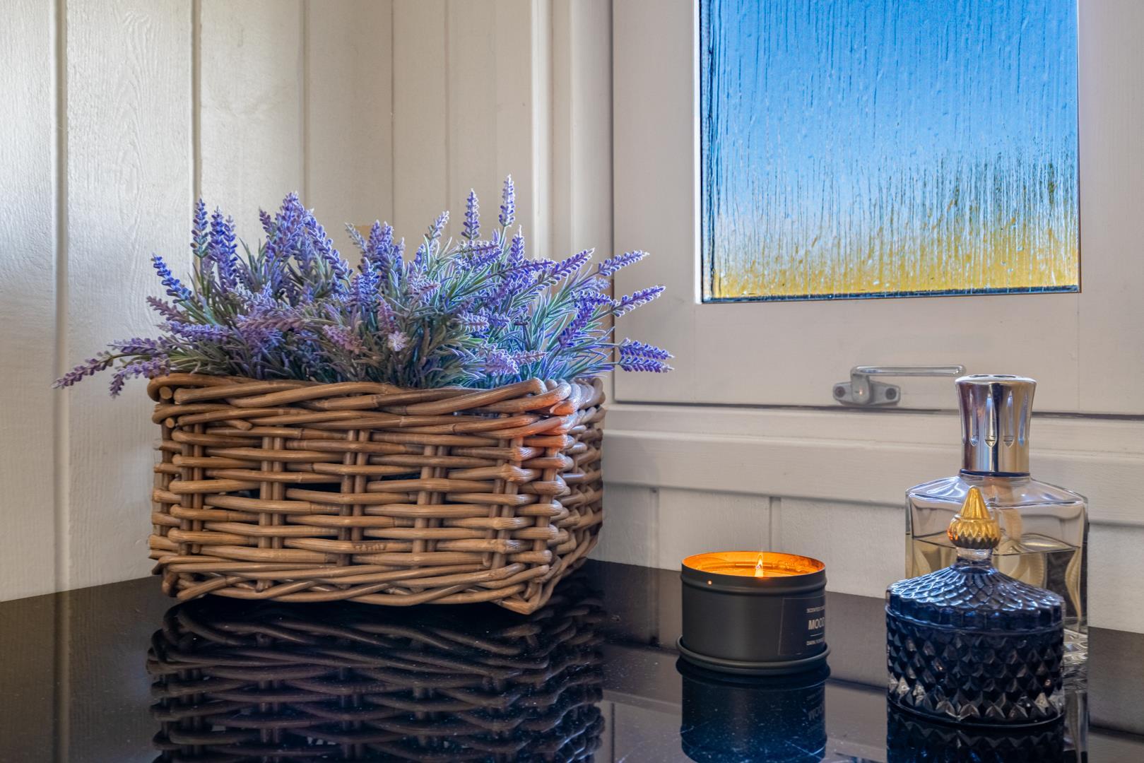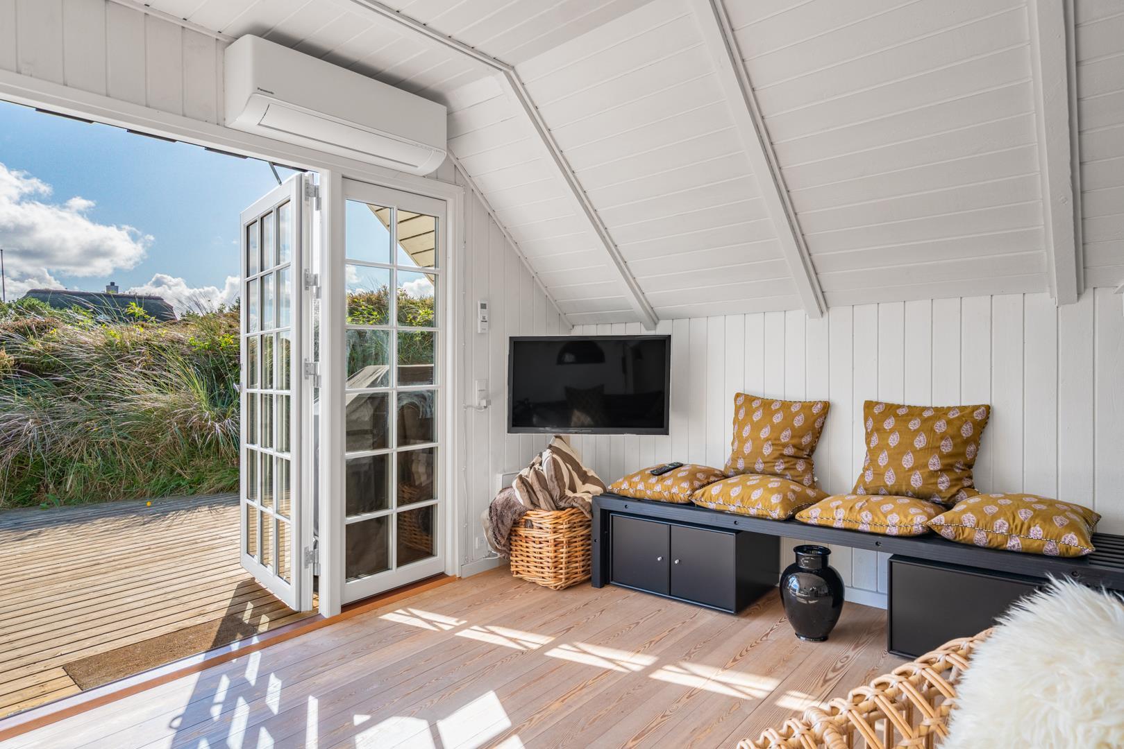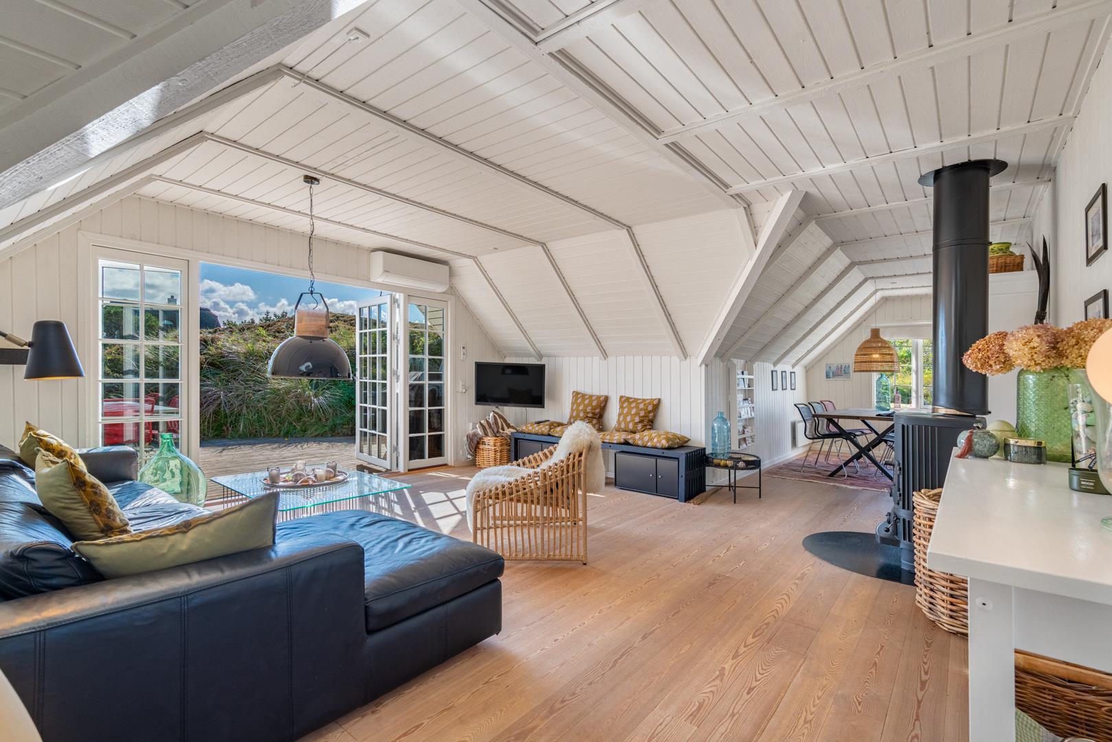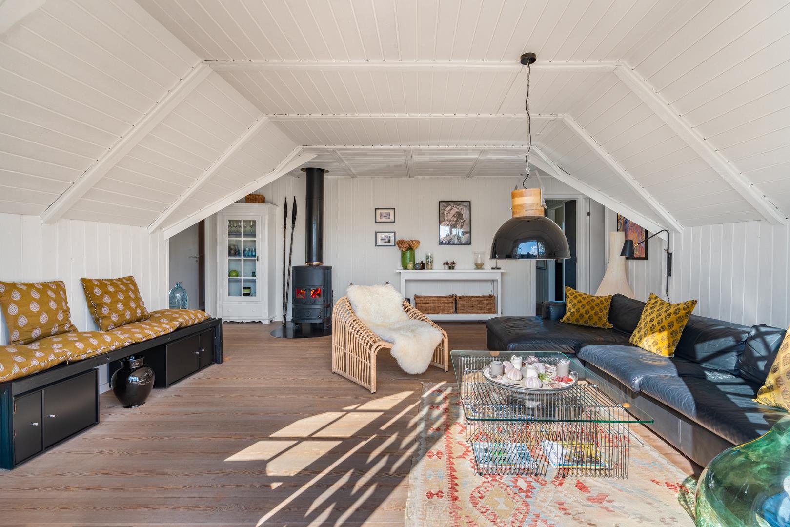 De lyse opholdsrum er indrettet med flotte møbler og fine detaljer, der understreger den autentiske sommerhusstemning.