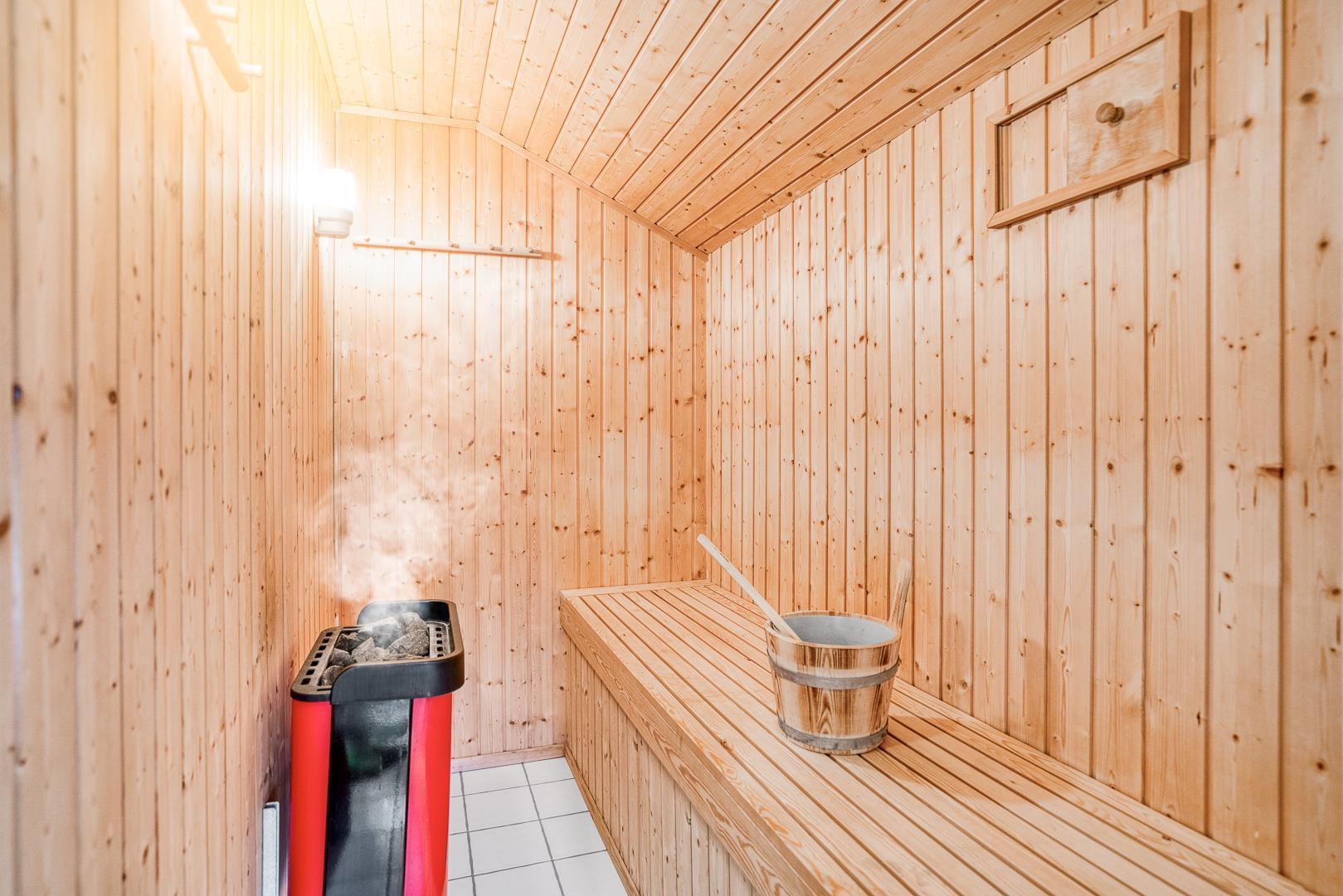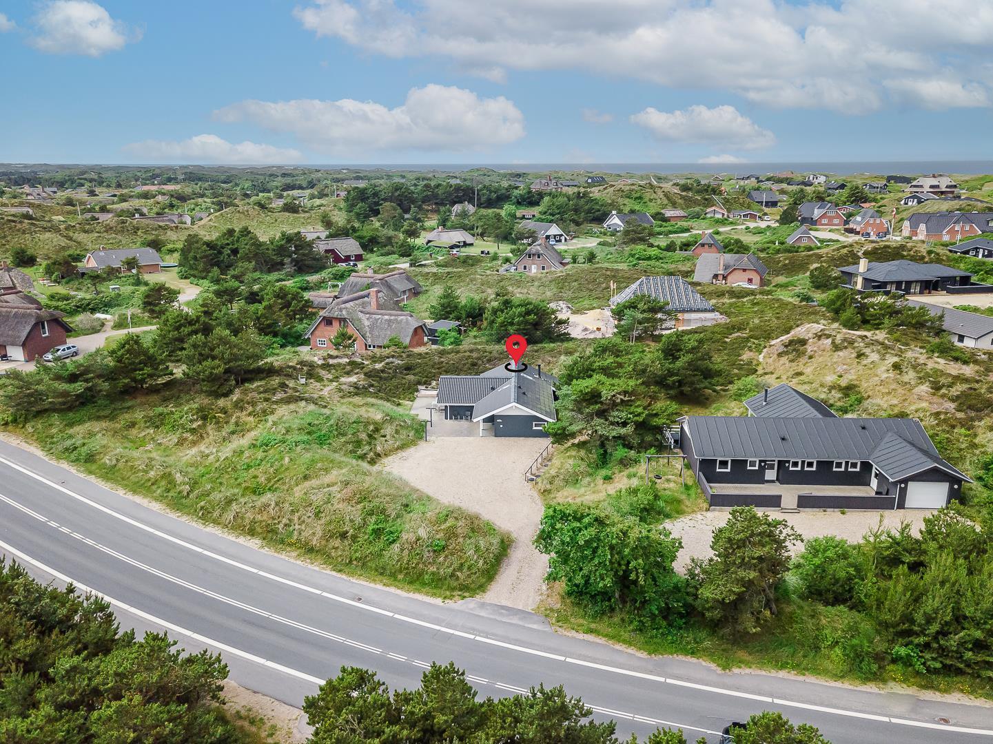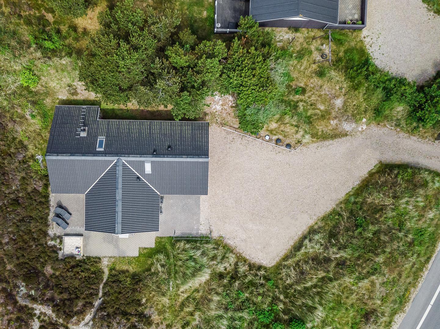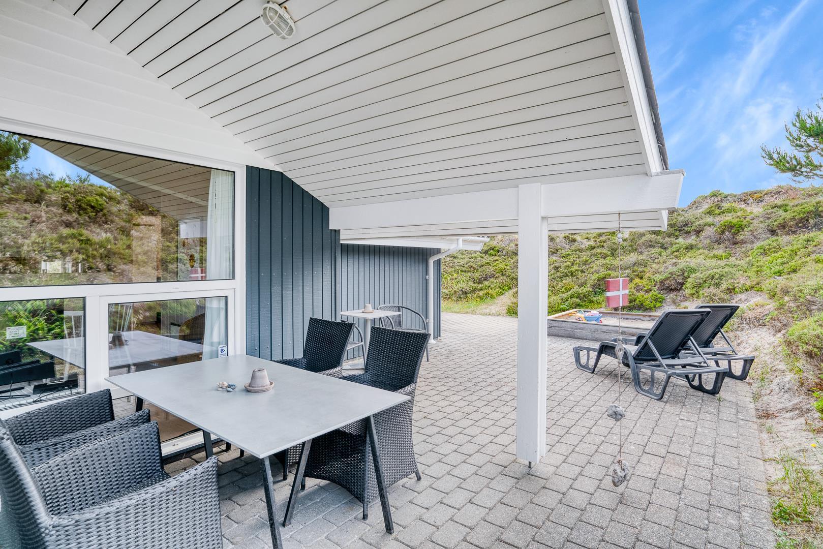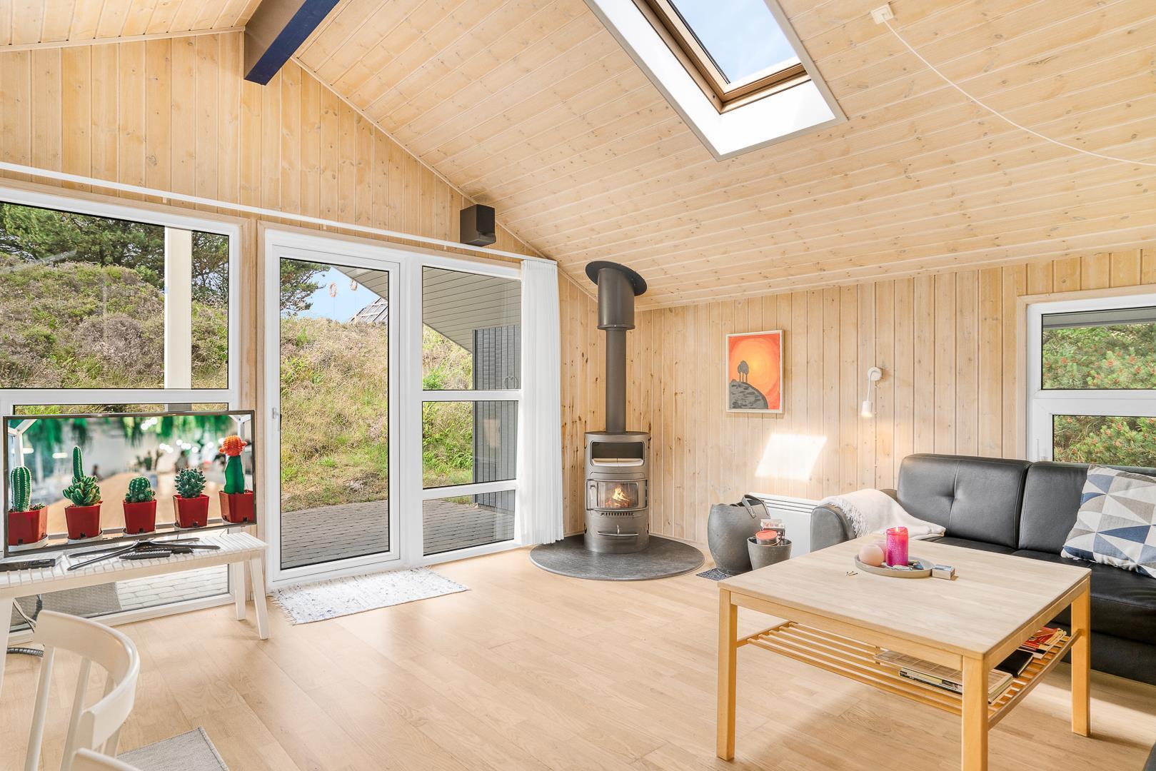 Moderne og lyst feriehus nær Henne Strand med sauna, brændeovn og flere terrasser på stor naturgrund.