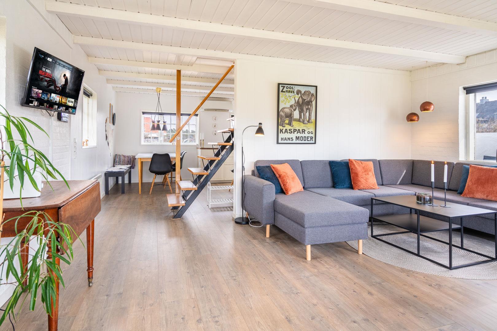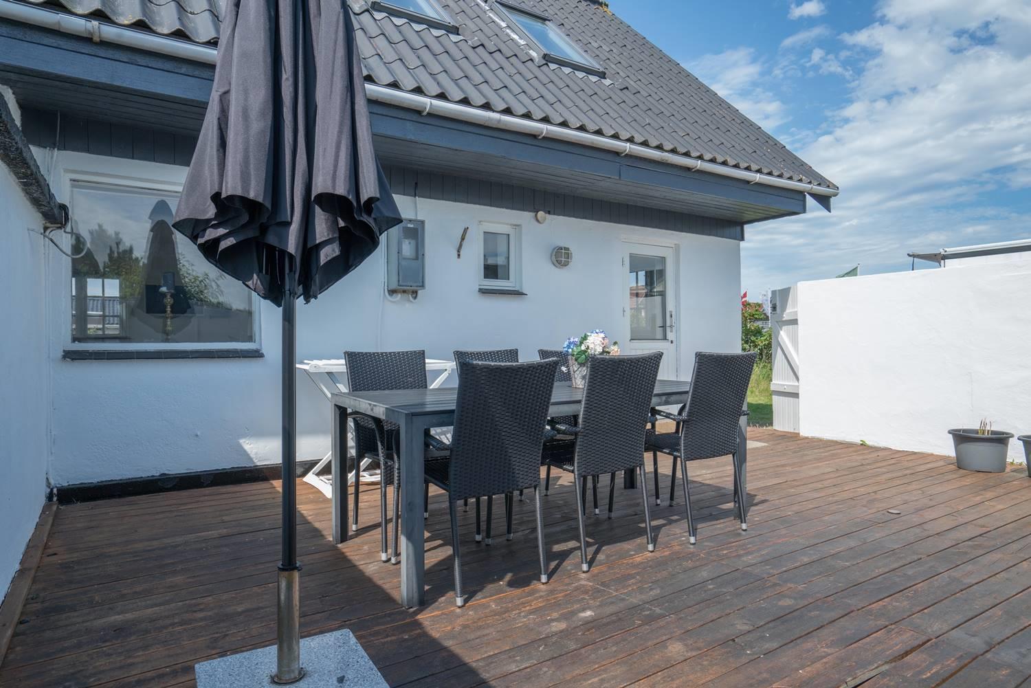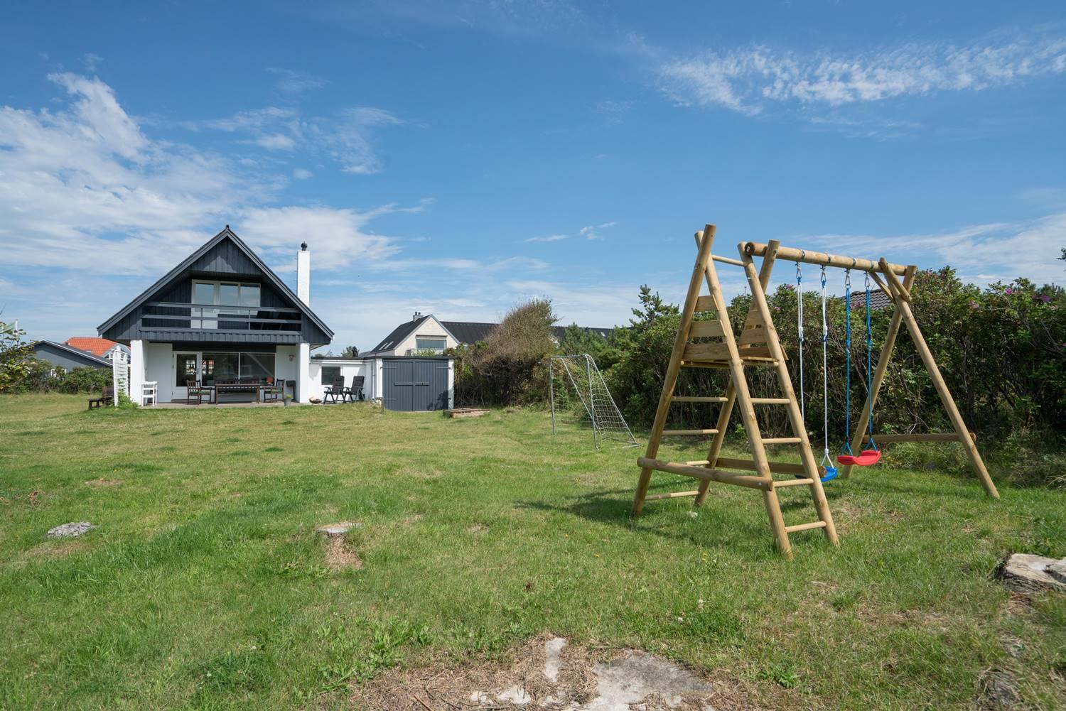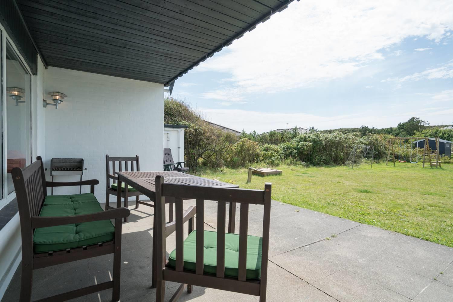 Hyggeligt feriehus nær Henne Strands centrum med lukket have, nyrenoveret badeværelse og gode faciliteter til familier.