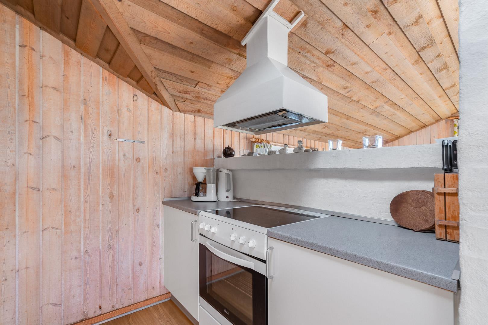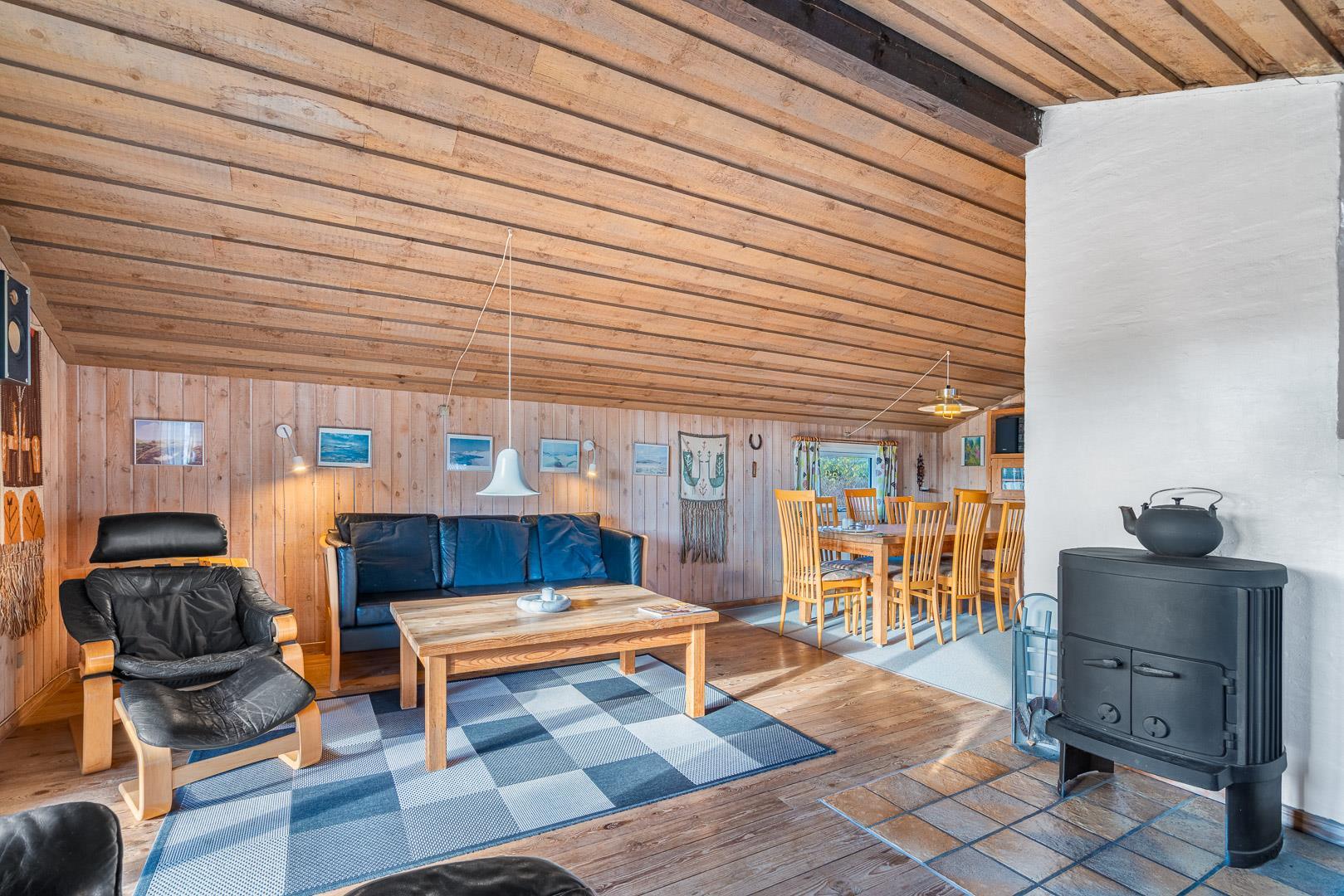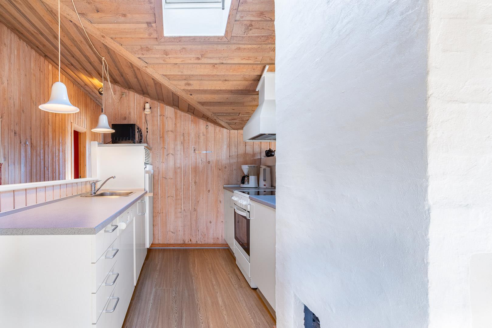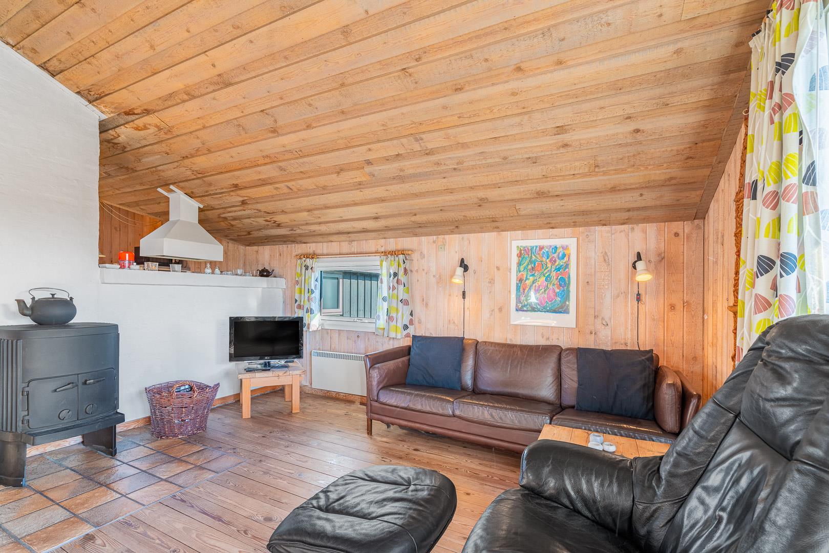 Indendørs mødes I af en hjemlig atmosfære. Køkkenet ligger i forlængelse af stuen, hvor brændeovnen sætter stemningen på kølige aftener.