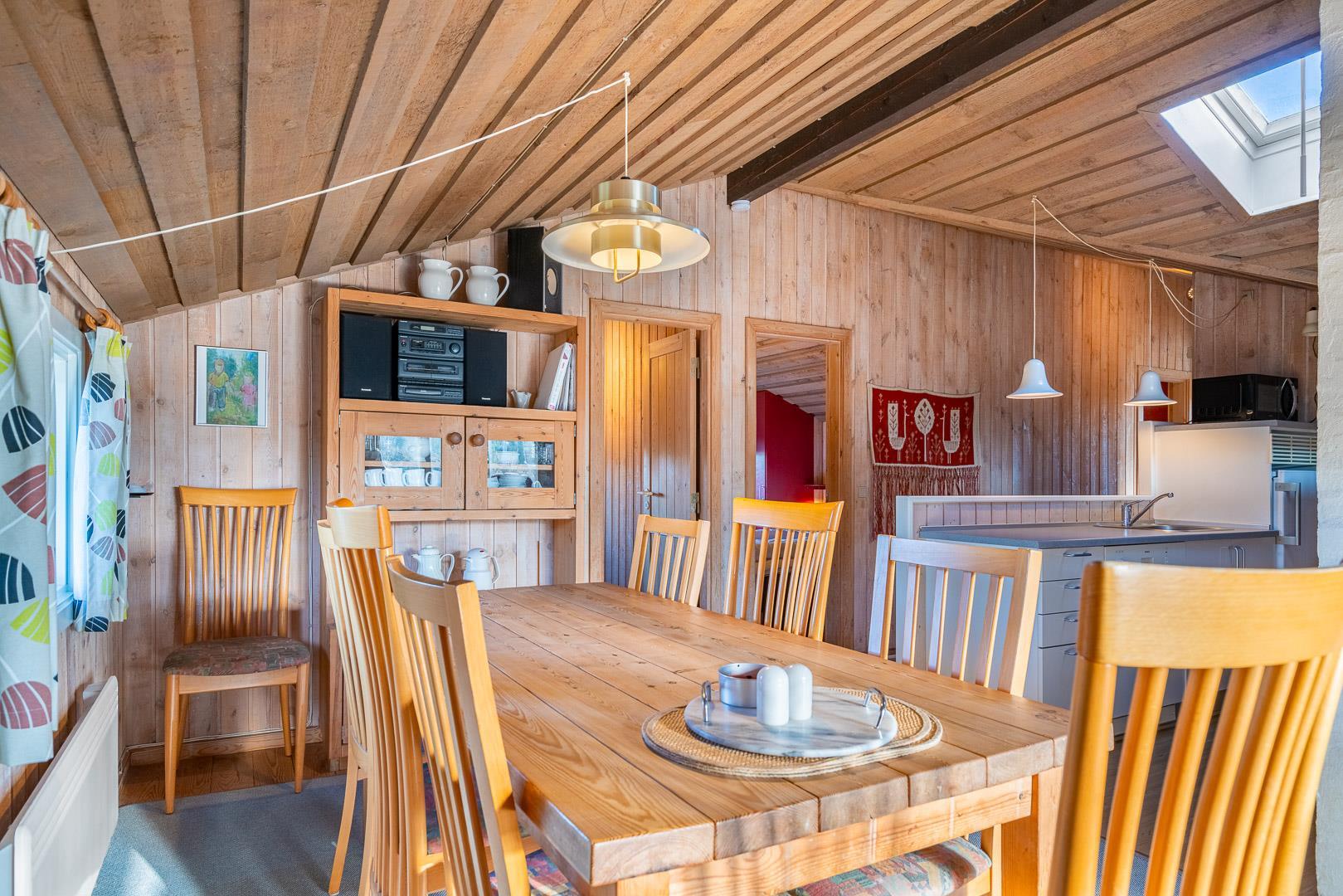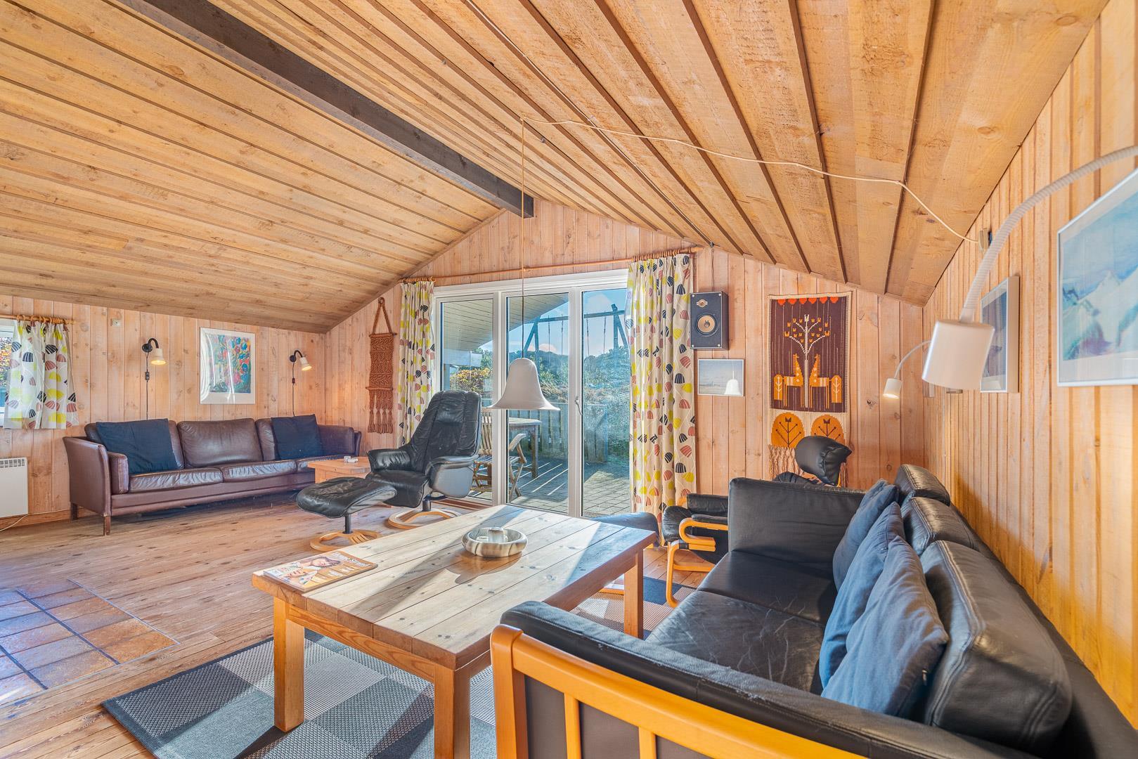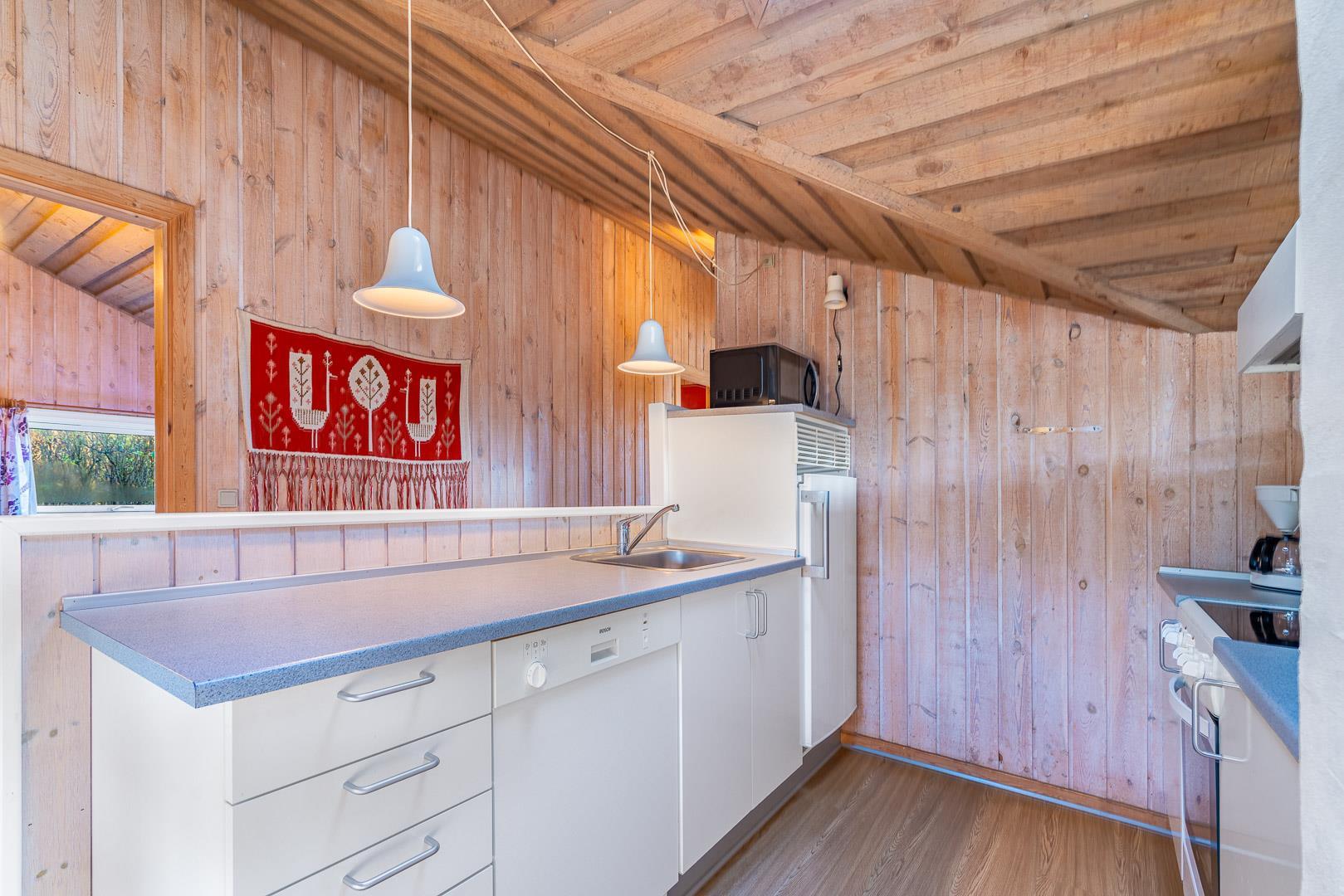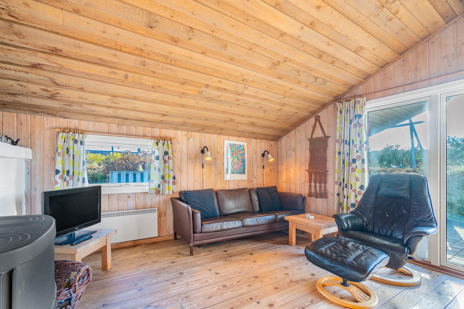 Indendørs mødes I af en hjemlig atmosfære. Køkkenet ligger i forlængelse af stuen, hvor brændeovnen sætter stemningen på kølige aftener.