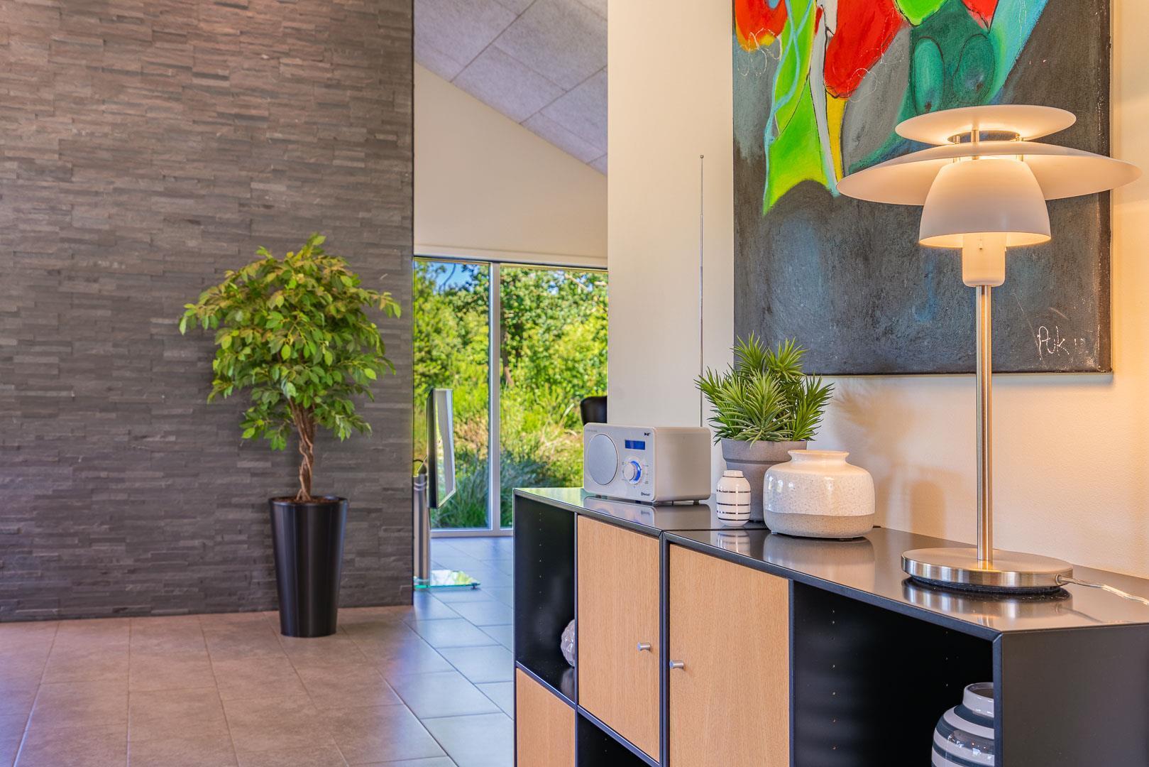 Sommerhuset byder på alt, hvad der skal til, for at feriedagene kører på skinner. Indenfor er der lagt vægt på at fremhæve følelsen af lys og luft med talrige vinduespartier og loft til kip, som er beklædt med Troldtektplader, hvilket giver en behagelig akustik. Opholdsrummene består af en stor lys stue, der ligger i åben forbindelse med et lækkert køkken, hvor I kan eksperimentere med friske sommersalater og krydrede vintersupper.