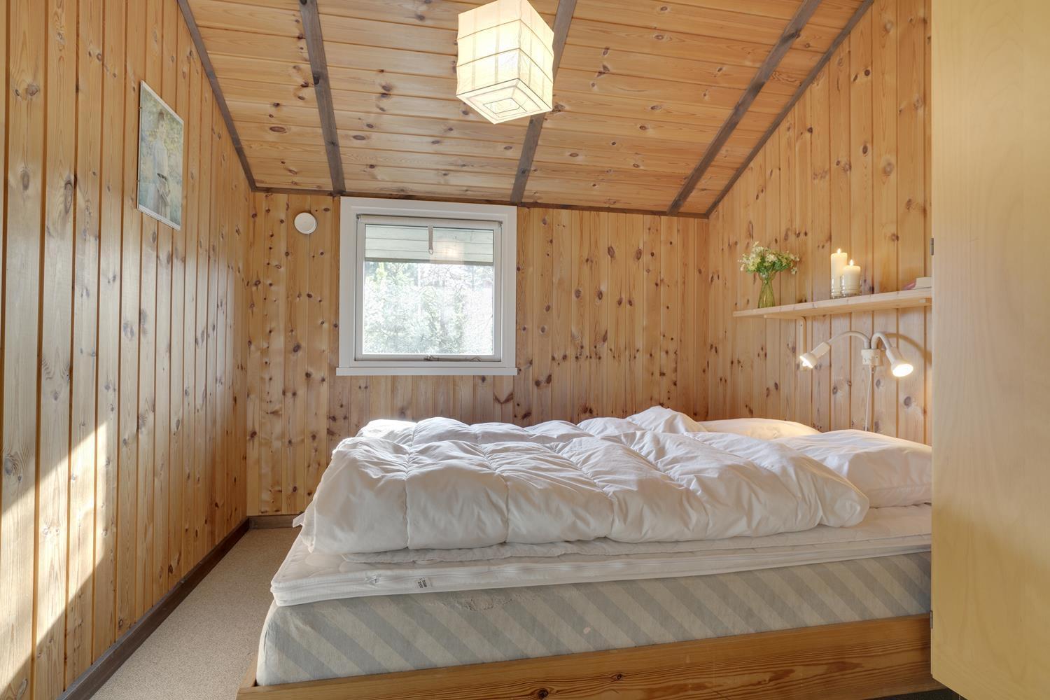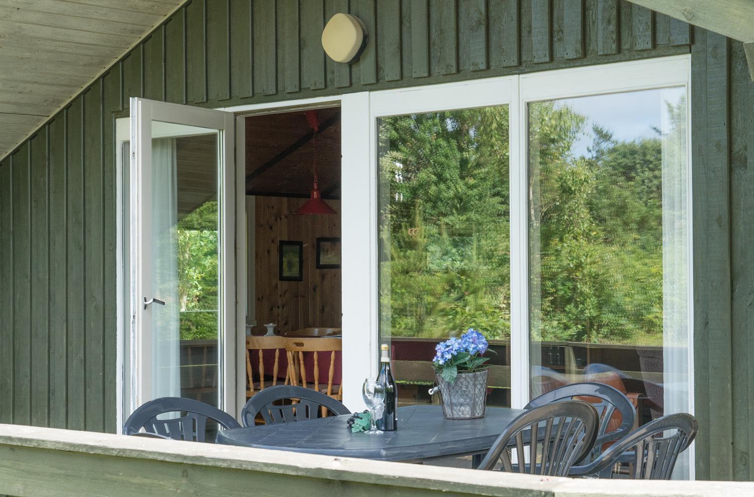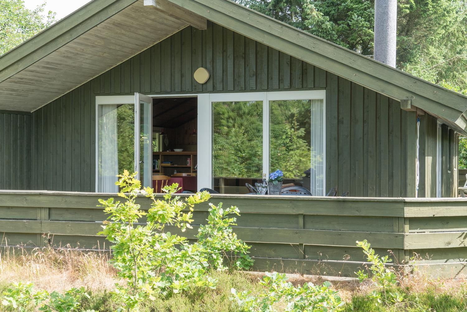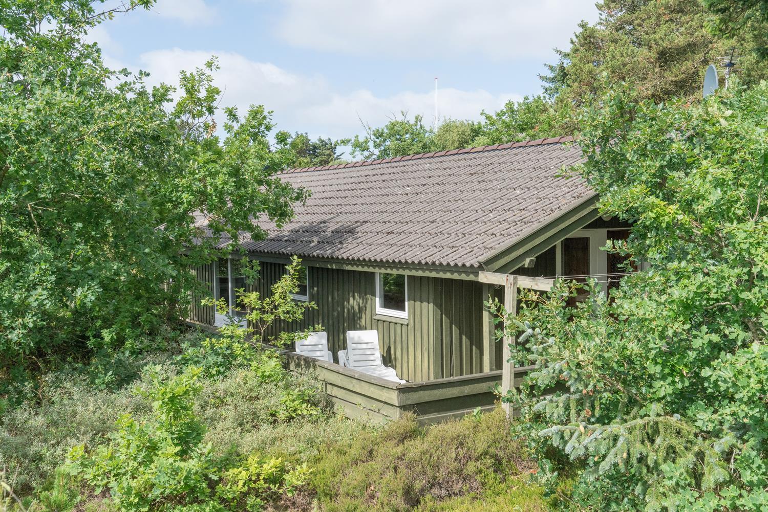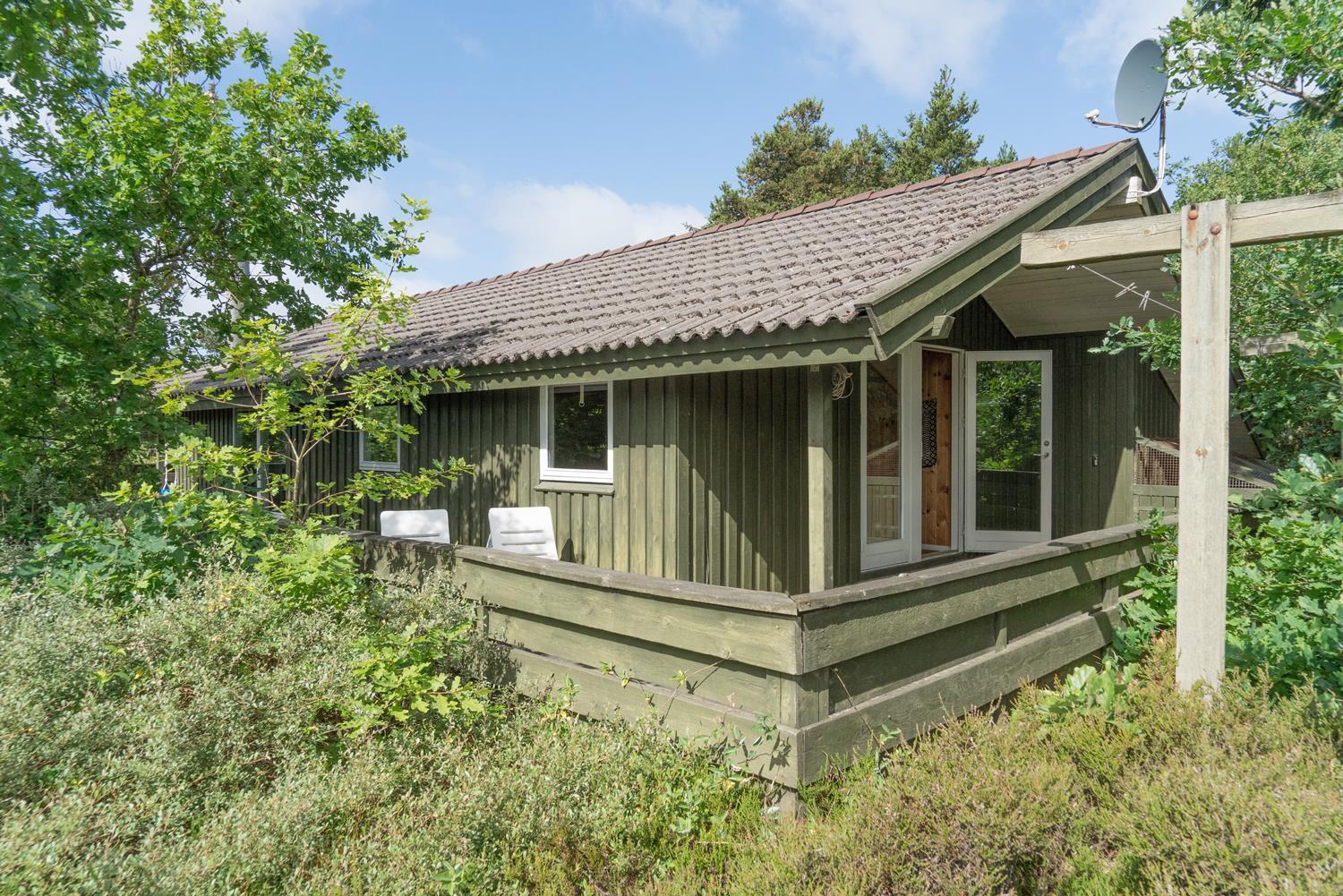 På en rolig og kuperet naturgrund omkranset af træer og buske ligger dette feriehus med delvis overdækket terrasse. Køkkenet er kombineret med stuen, som er indrettet med brændeovn og TV. Der forefindes 3 soverum, som fordeler sig på 1 værelse med dobbelt seng, 1 værelse med 2 senge og det sidste værelse med køjer. Huset har tæpper på gulvene og træ på vægge og lofter. Der er 4 tyske TV-progammer