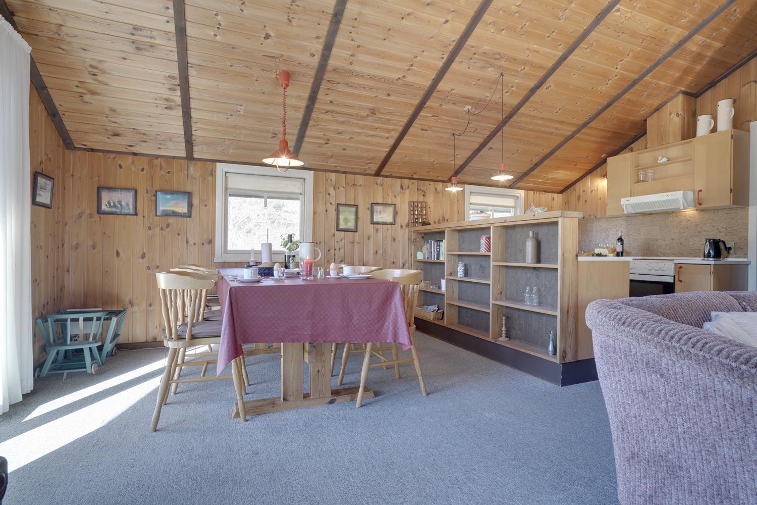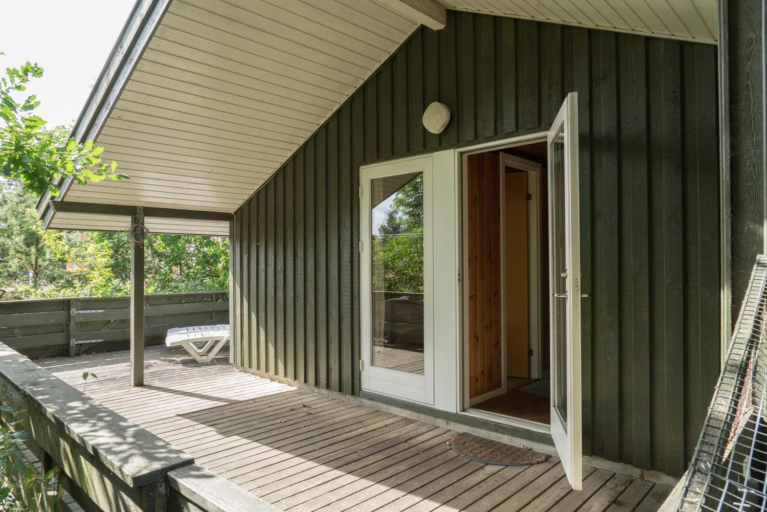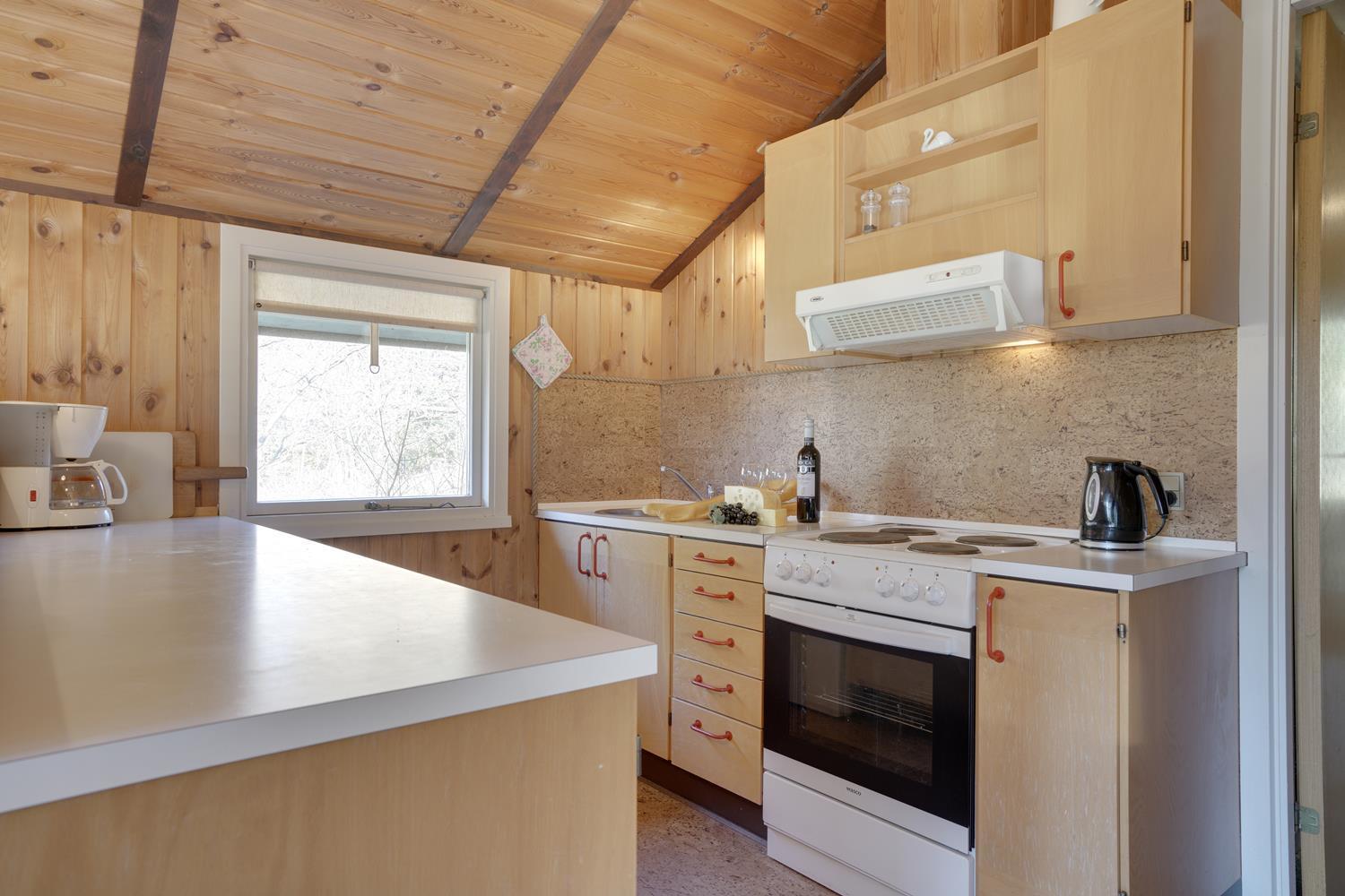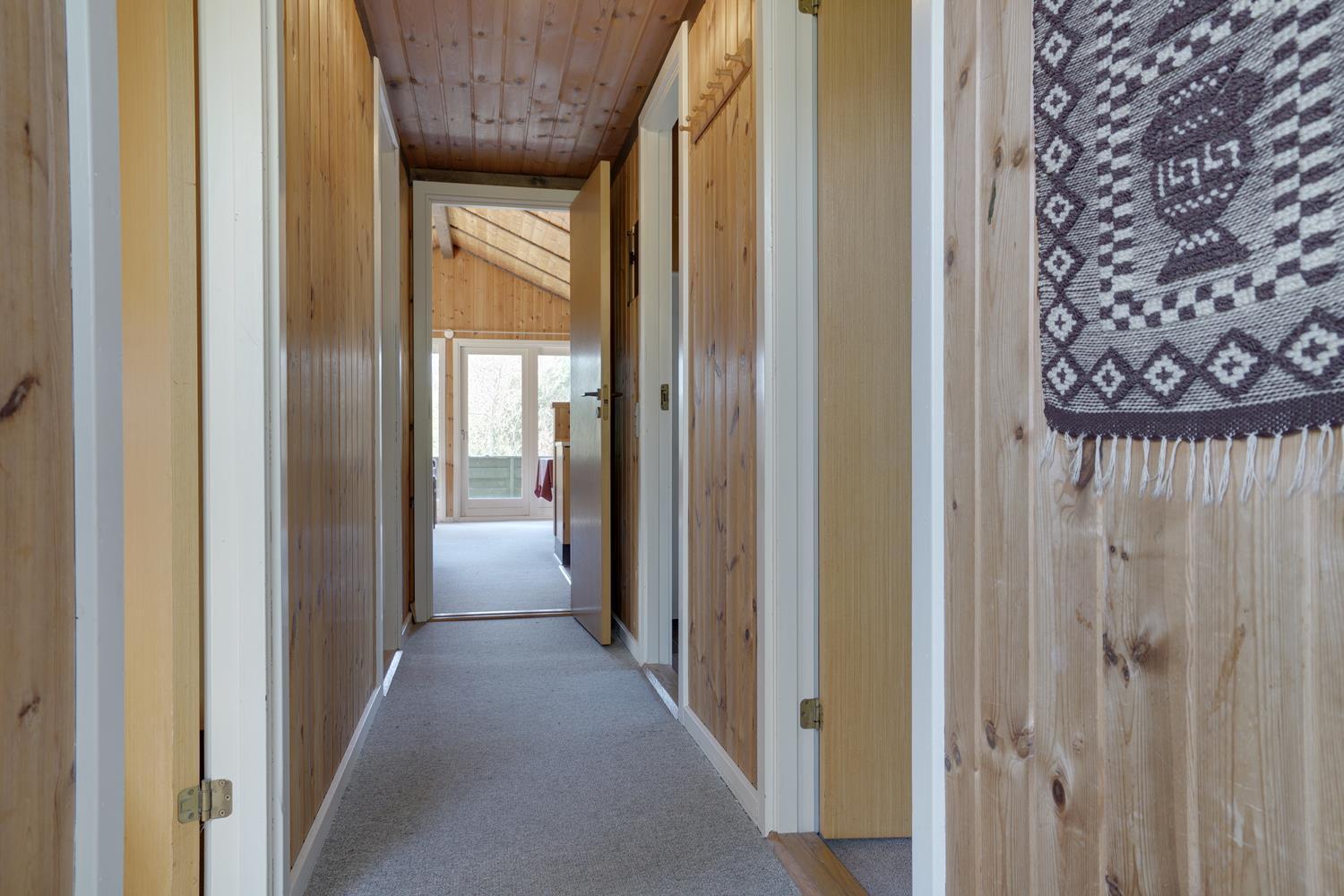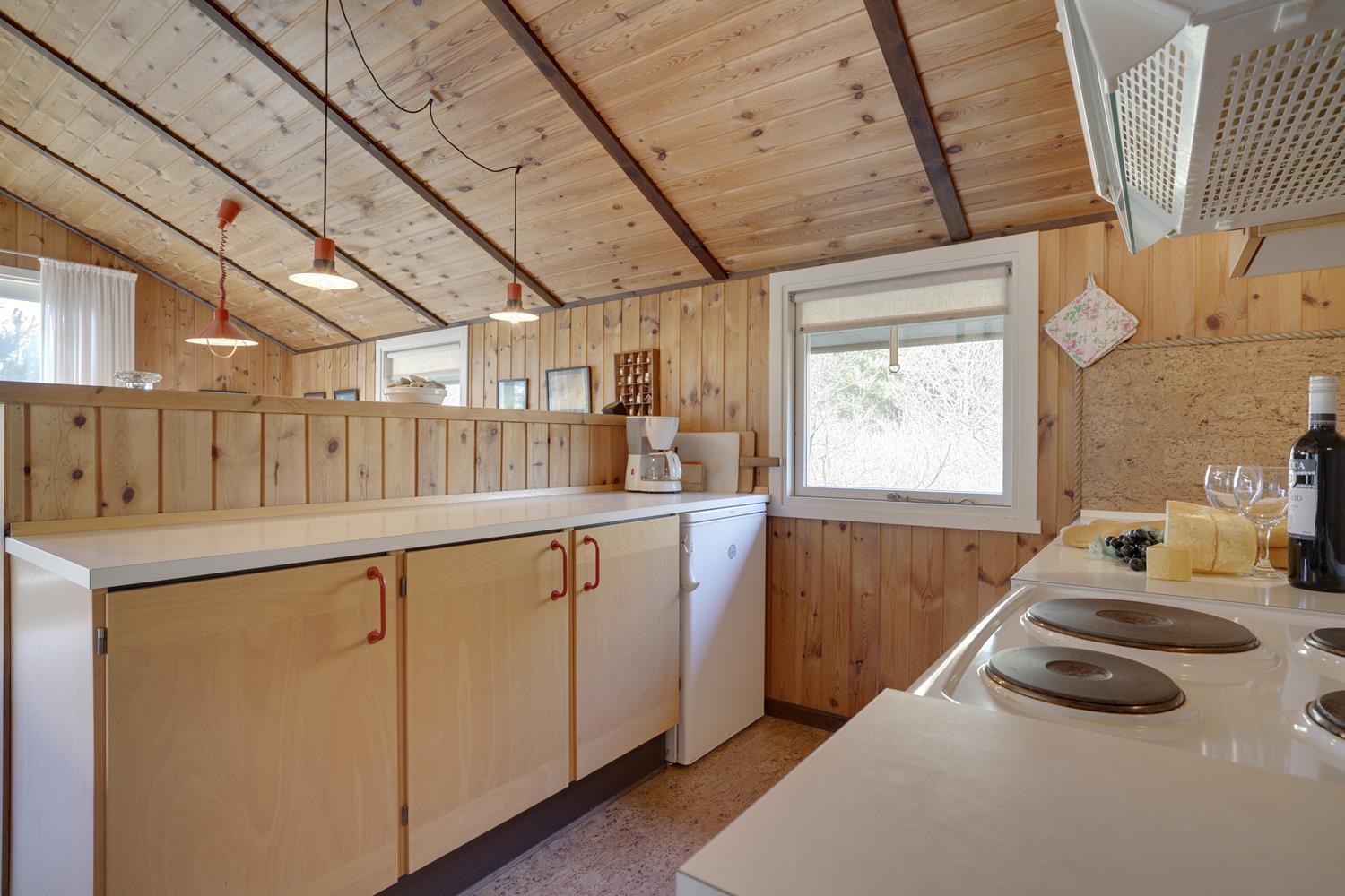 På en rolig og kuperet naturgrund omkranset af træer og buske ligger dette feriehus med delvis overdækket terrasse. Køkkenet er kombineret med stuen, som er indrettet med brændeovn og TV. Der forefindes 3 soverum, som fordeler sig på 1 værelse med dobbelt seng, 1 værelse med 2 senge og det sidste værelse med køjer. Huset har tæpper på gulvene og træ på vægge og lofter. Der er 4 tyske TV-progammer