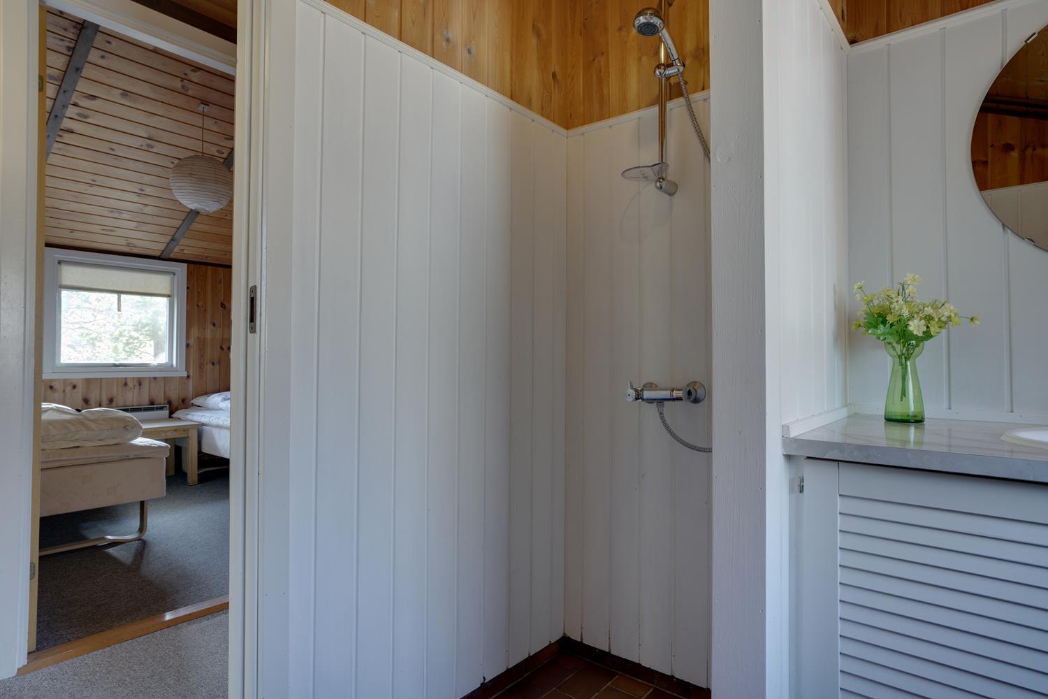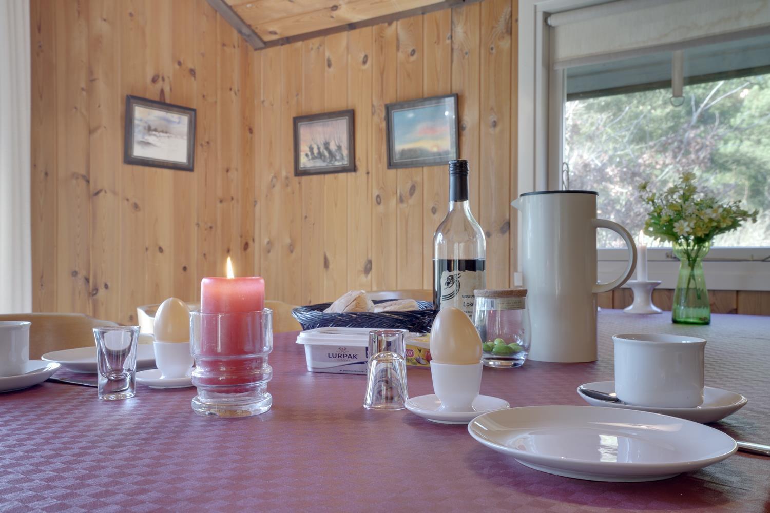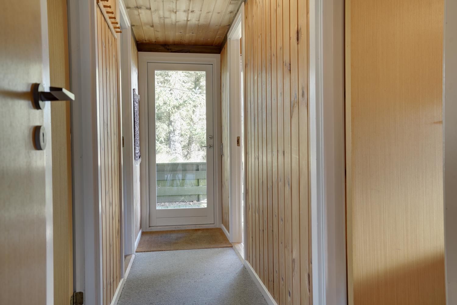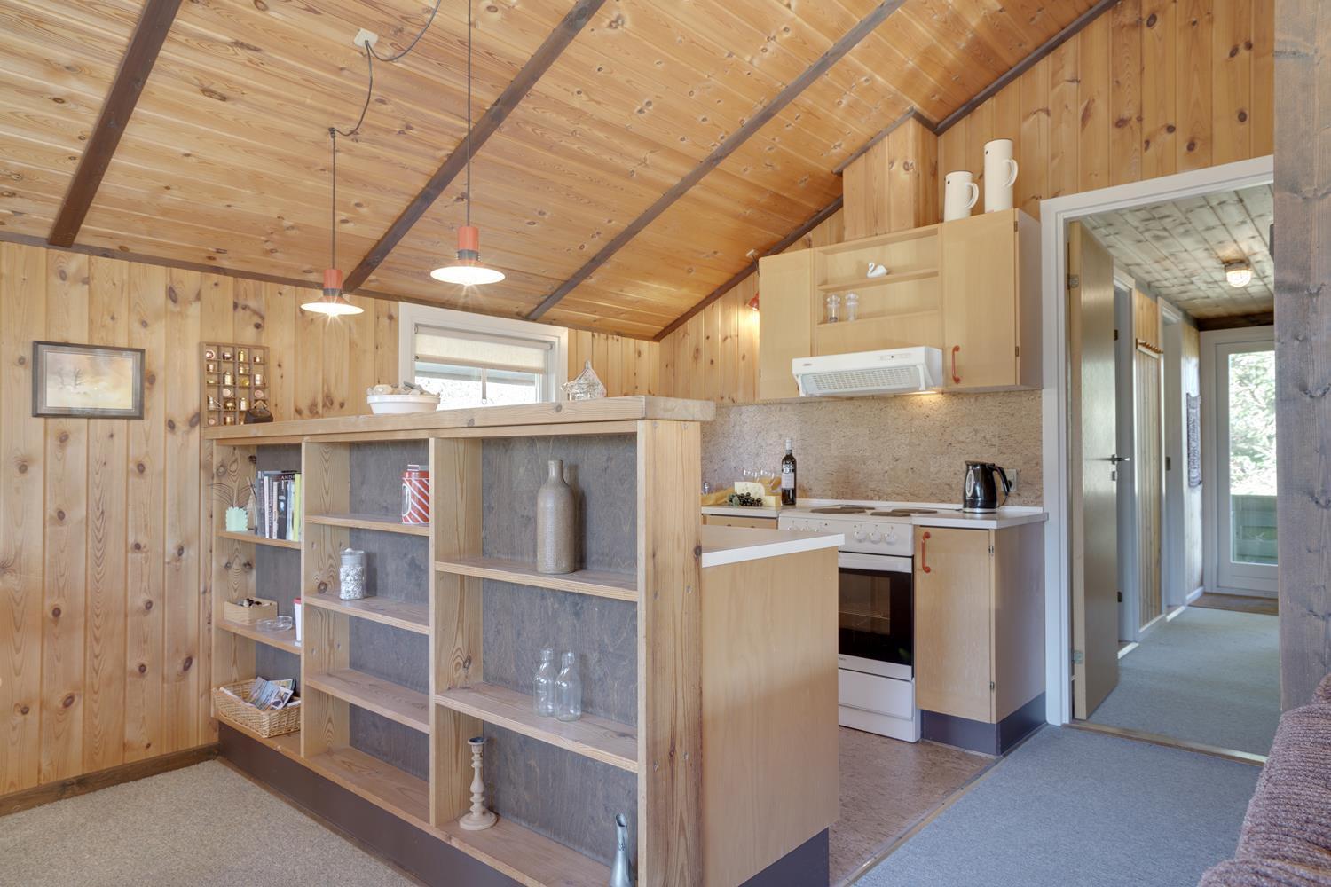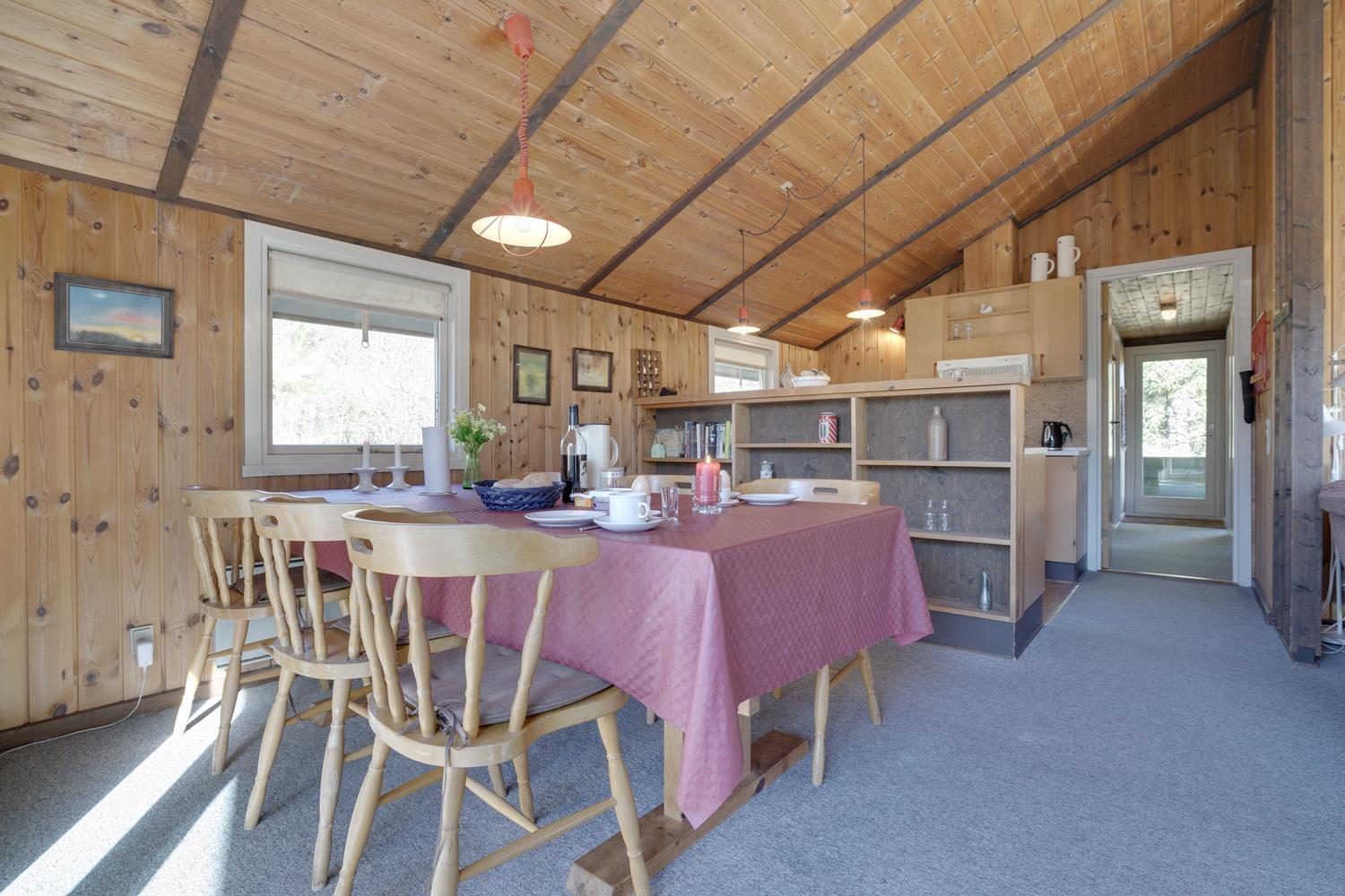 På en rolig og kuperet naturgrund omkranset af træer og buske ligger dette feriehus med delvis overdækket terrasse. Køkkenet er kombineret med stuen, som er indrettet med brændeovn og TV. Der forefindes 3 soverum, som fordeler sig på 1 værelse med dobbelt seng, 1 værelse med 2 senge og det sidste værelse med køjer. Huset har tæpper på gulvene og træ på vægge og lofter. Der er 4 tyske TV-progammer