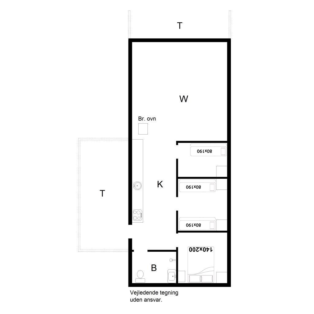 Sengestørrelser: 1 dobbeltseng 140 x 200 cm + 3 køjesenge 80 x 190 cm.