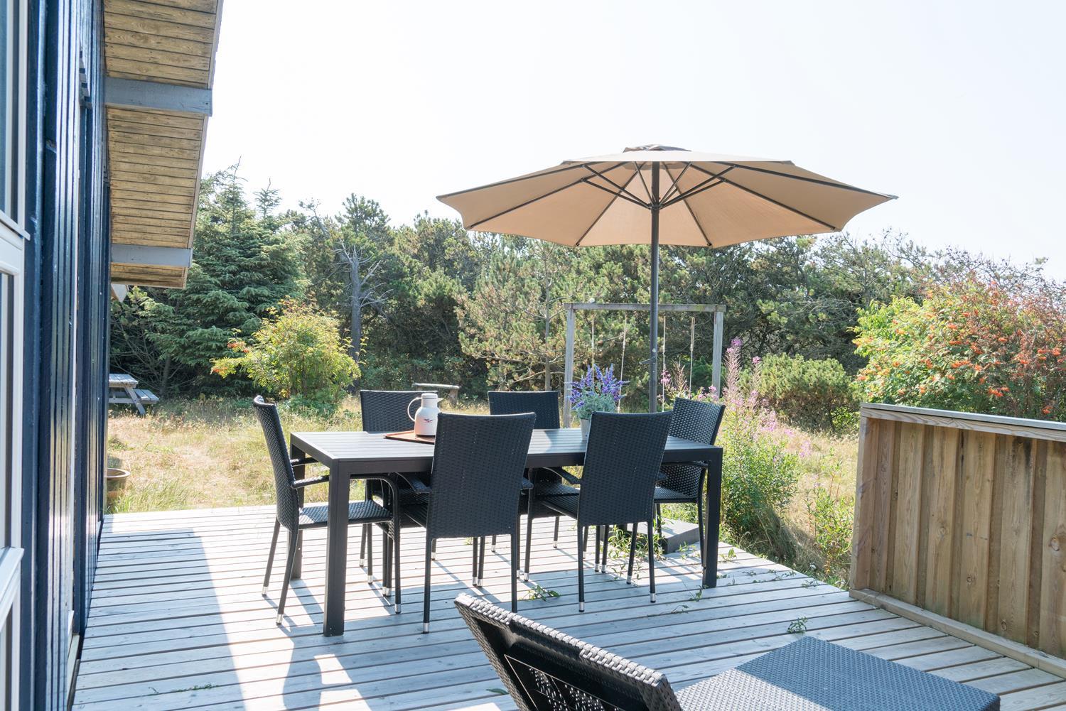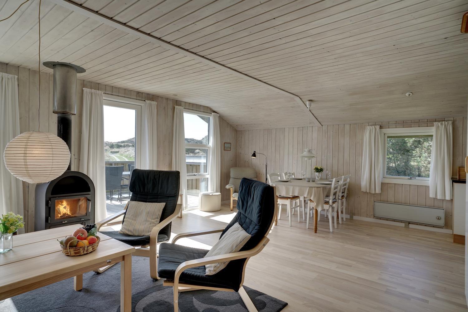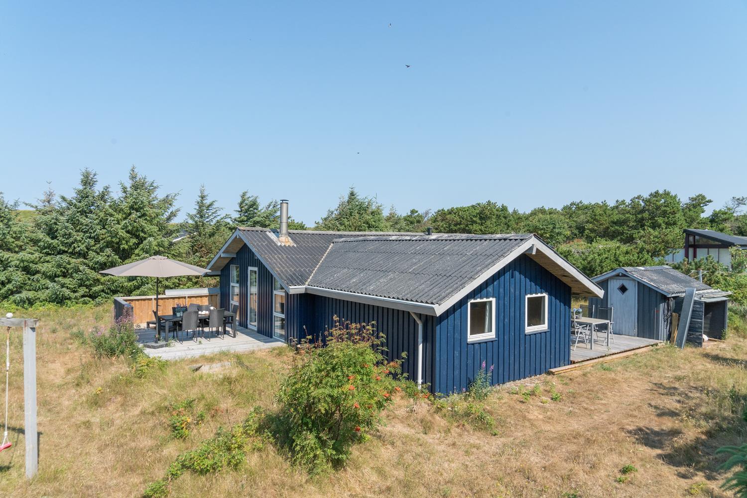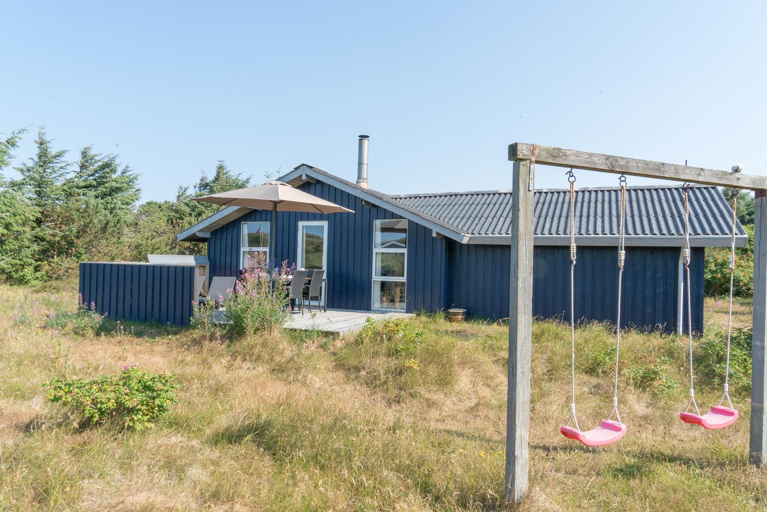 Hyggeligt og velholdt feriehus nær Henne Strand med brændeovn, flere terrasser og moderne faciliteter.
