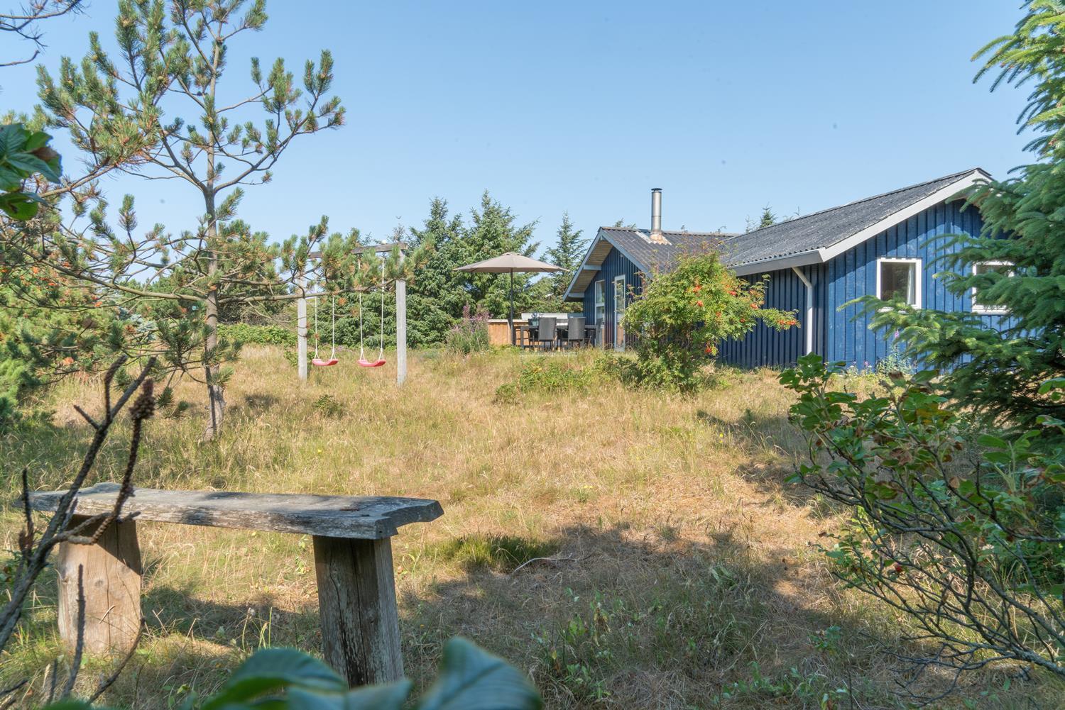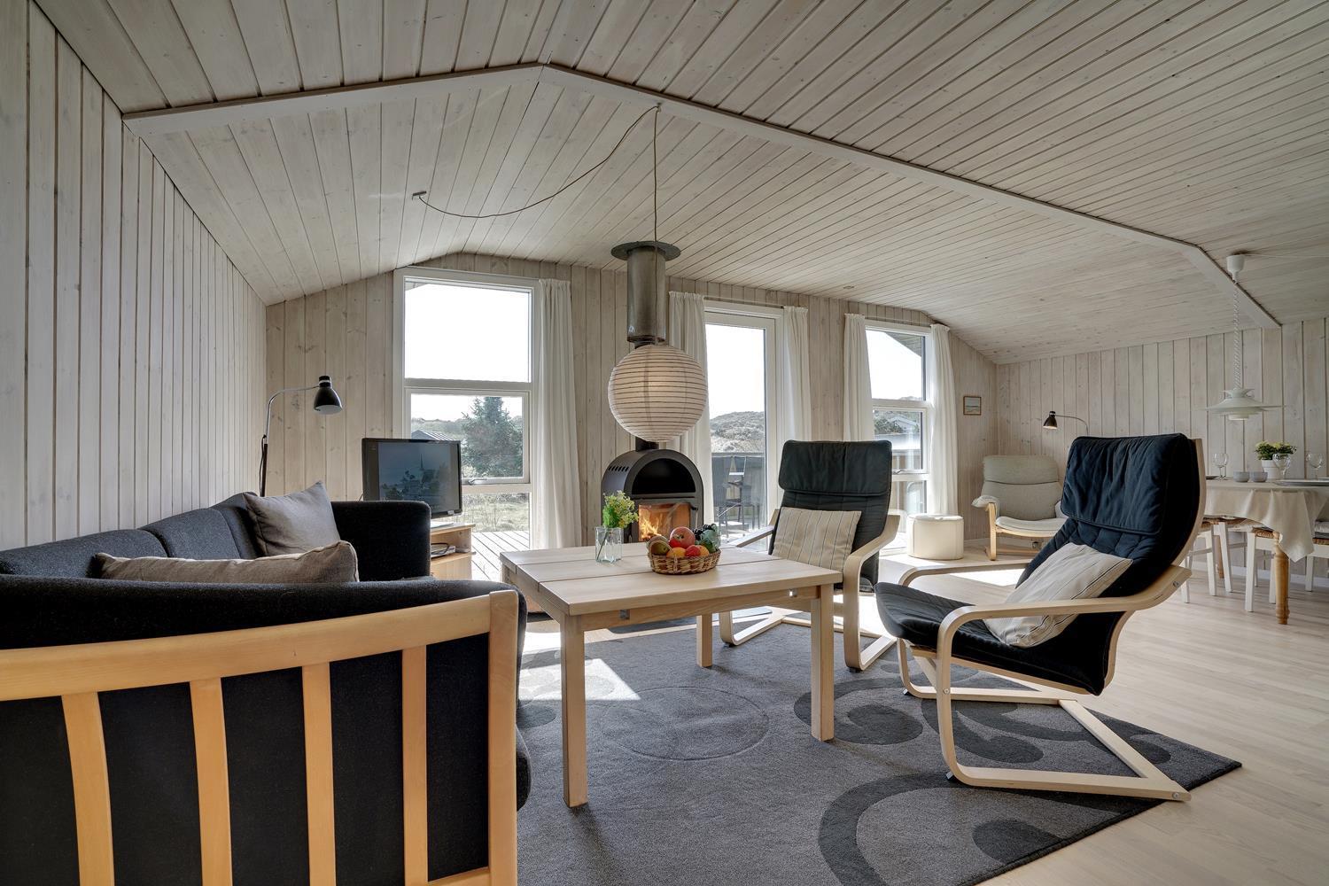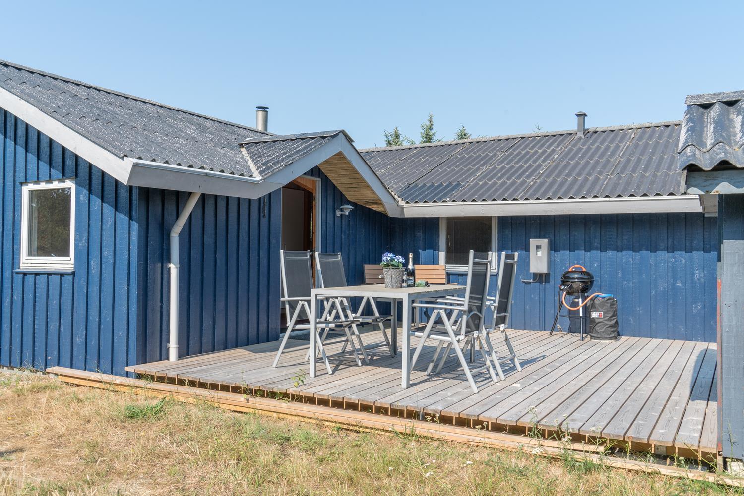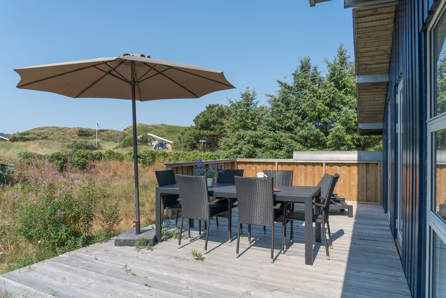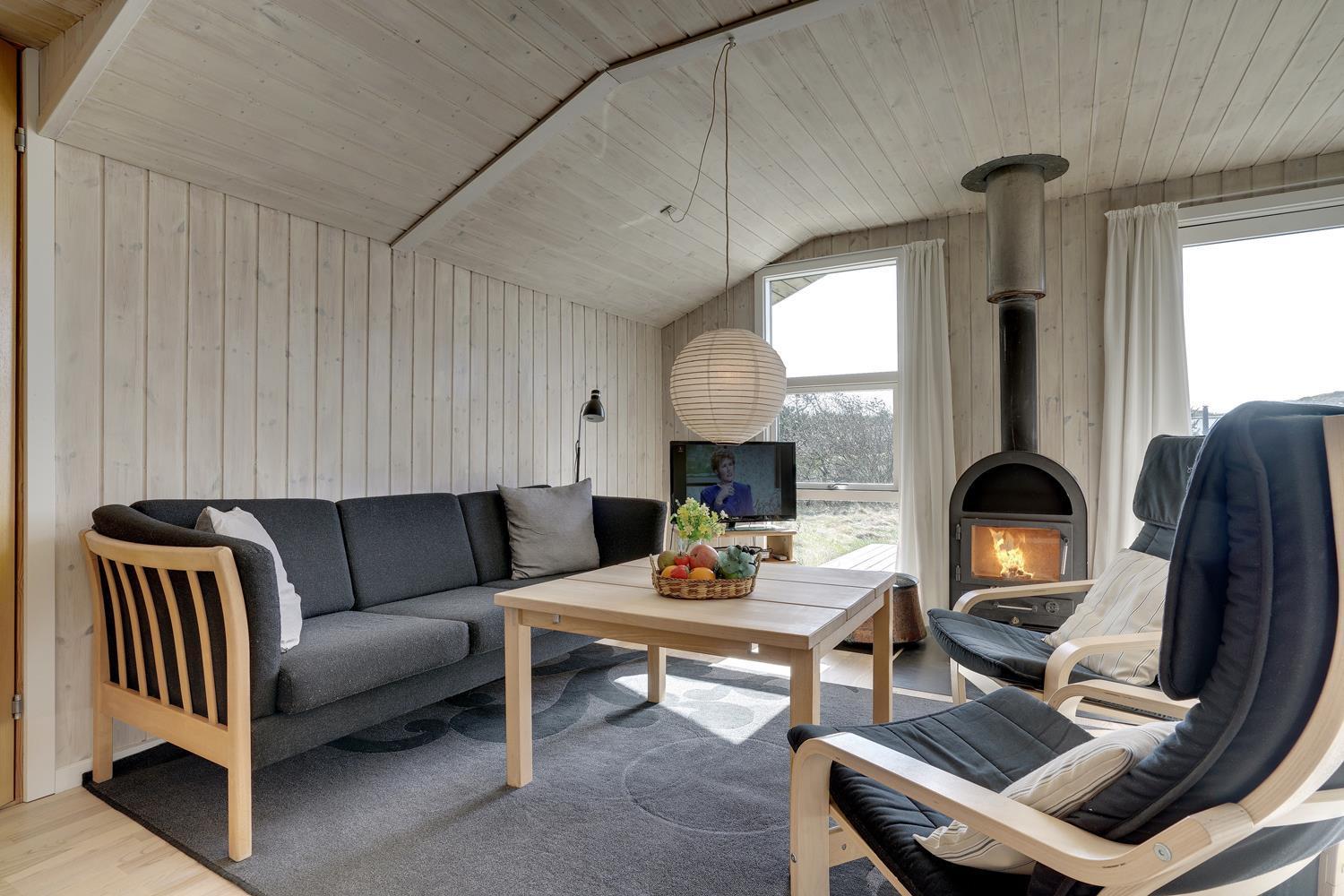 Hyggeligt og velholdt feriehus nær Henne Strand med brændeovn, flere terrasser og moderne faciliteter.