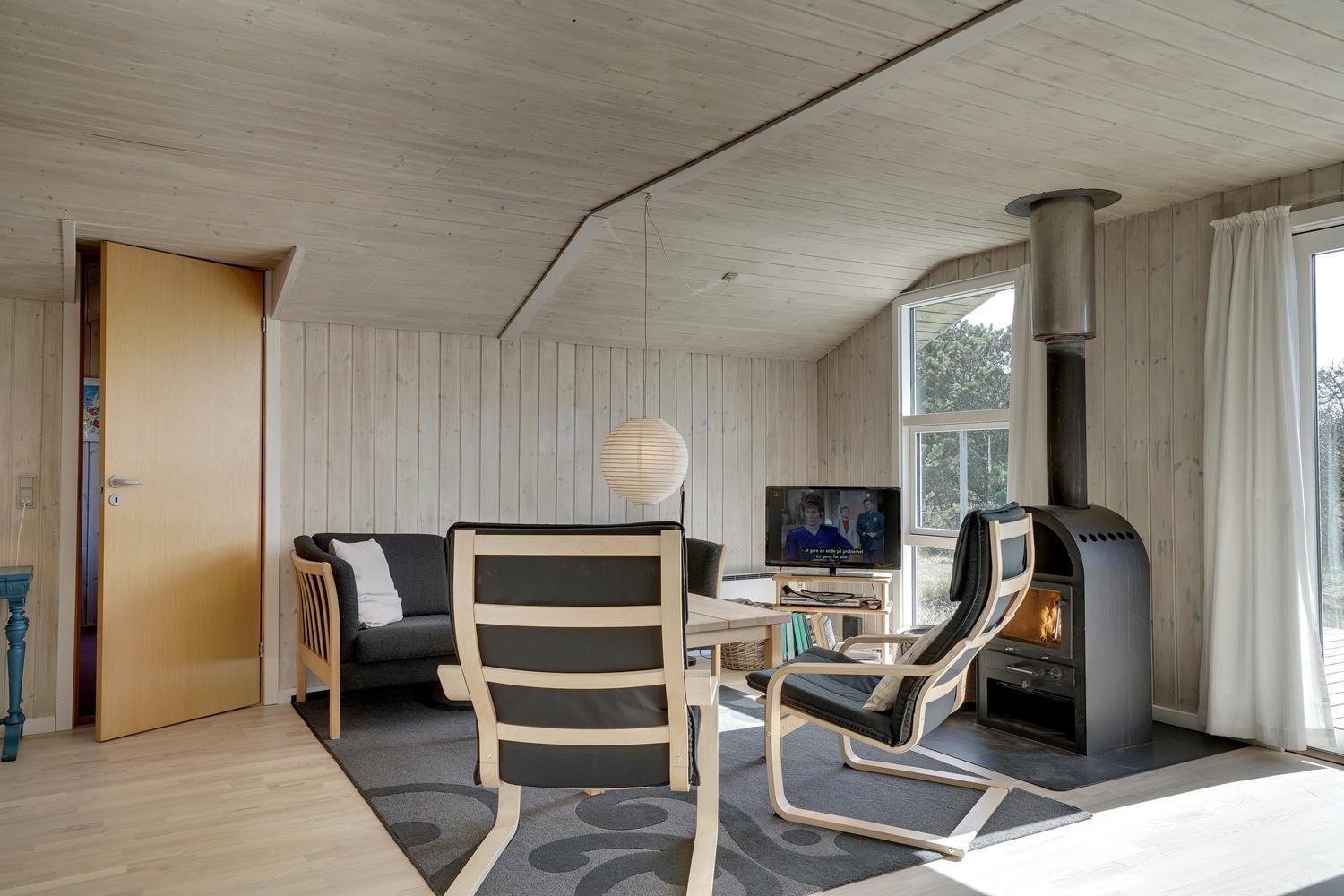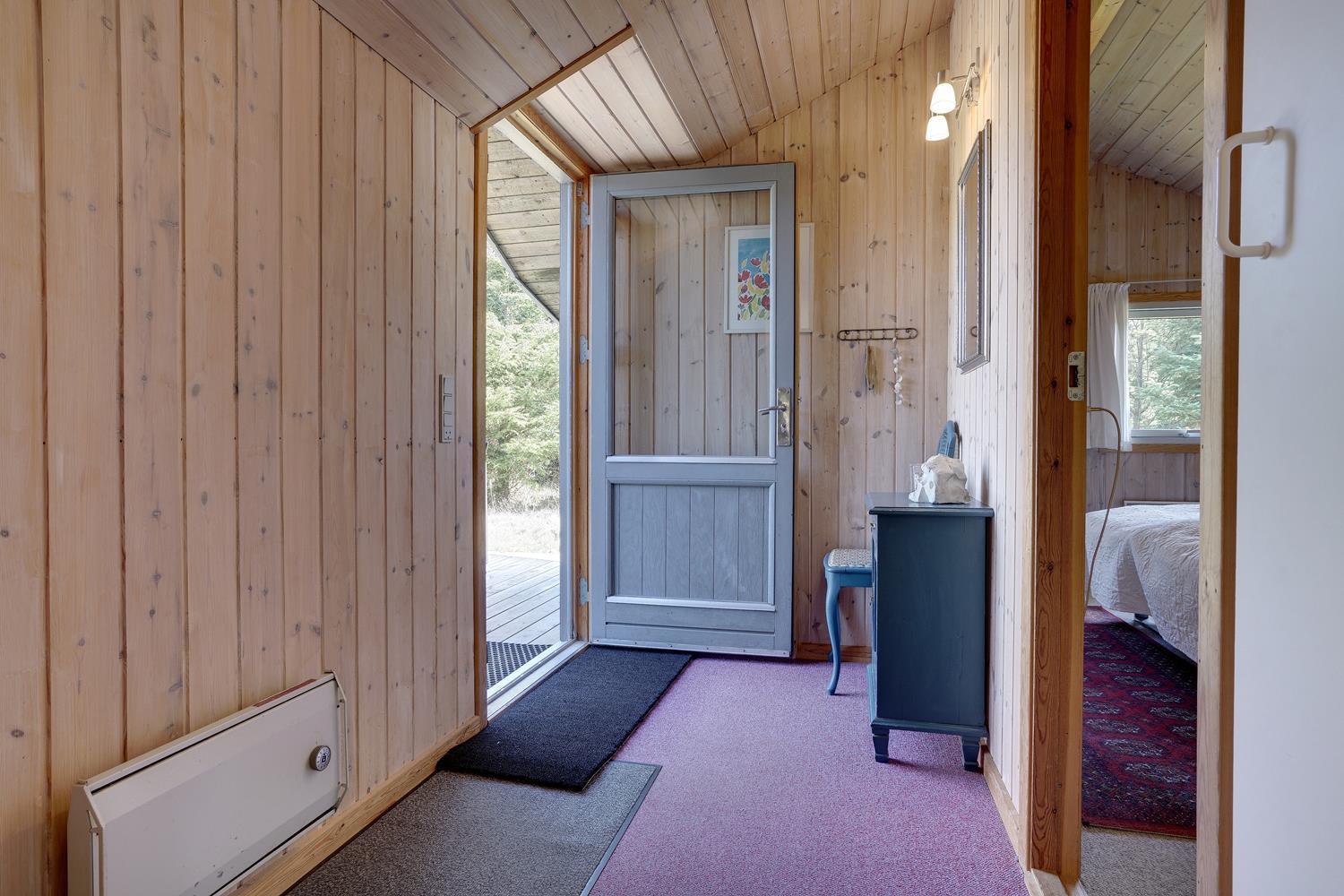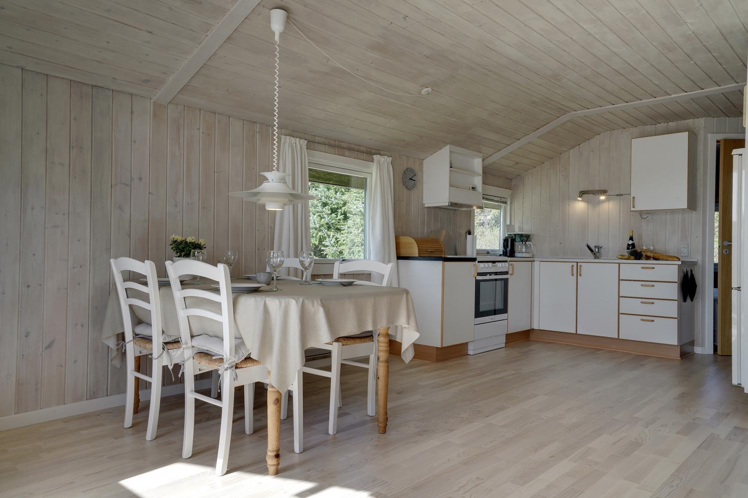 På en flot, bevokset naturgrund i rolige omgivelser ligger dette hyggelige og velholdte feriehus. Køkkenet er kombineret med den hyggelige og personligt indrettede stue med brændeovn og med direkte udgang til feriehusets terrasse. Der er flere dejlige træterrasser, hvor freden og solen kan nydes.