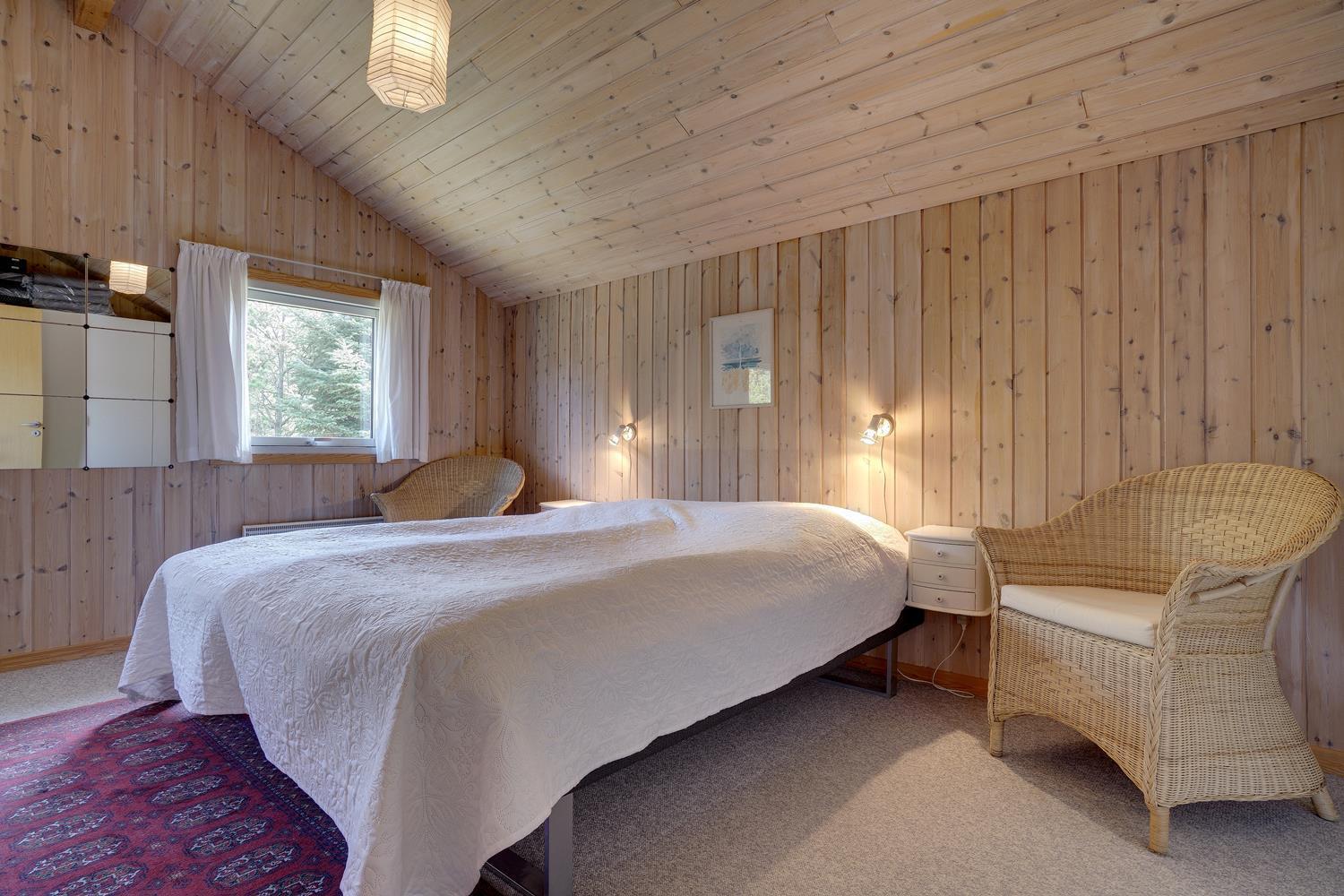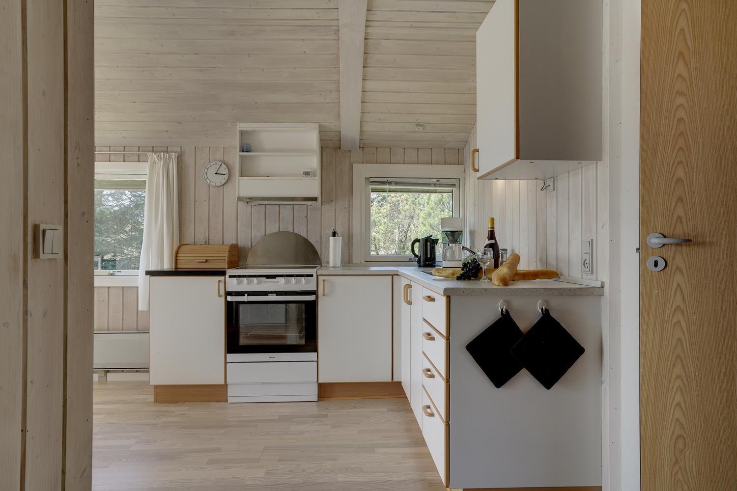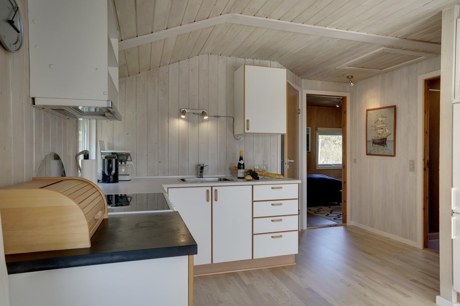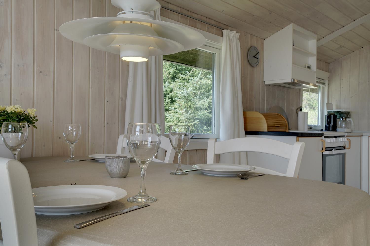 På en flot, bevokset naturgrund i rolige omgivelser ligger dette hyggelige og velholdte feriehus. Køkkenet er kombineret med den hyggelige og personligt indrettede stue med brændeovn og med direkte udgang til feriehusets terrasse. Der er flere dejlige træterrasser, hvor freden og solen kan nydes.