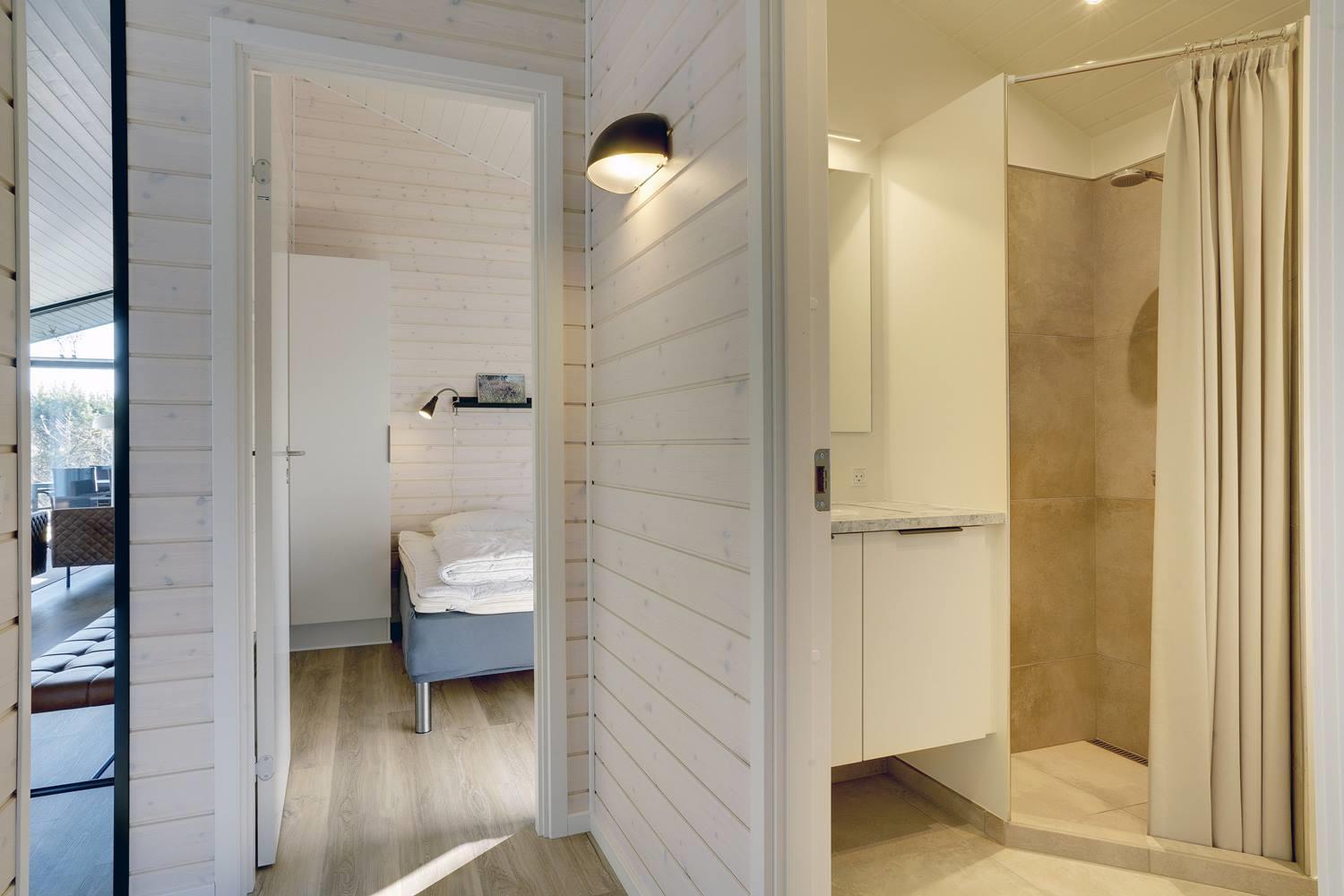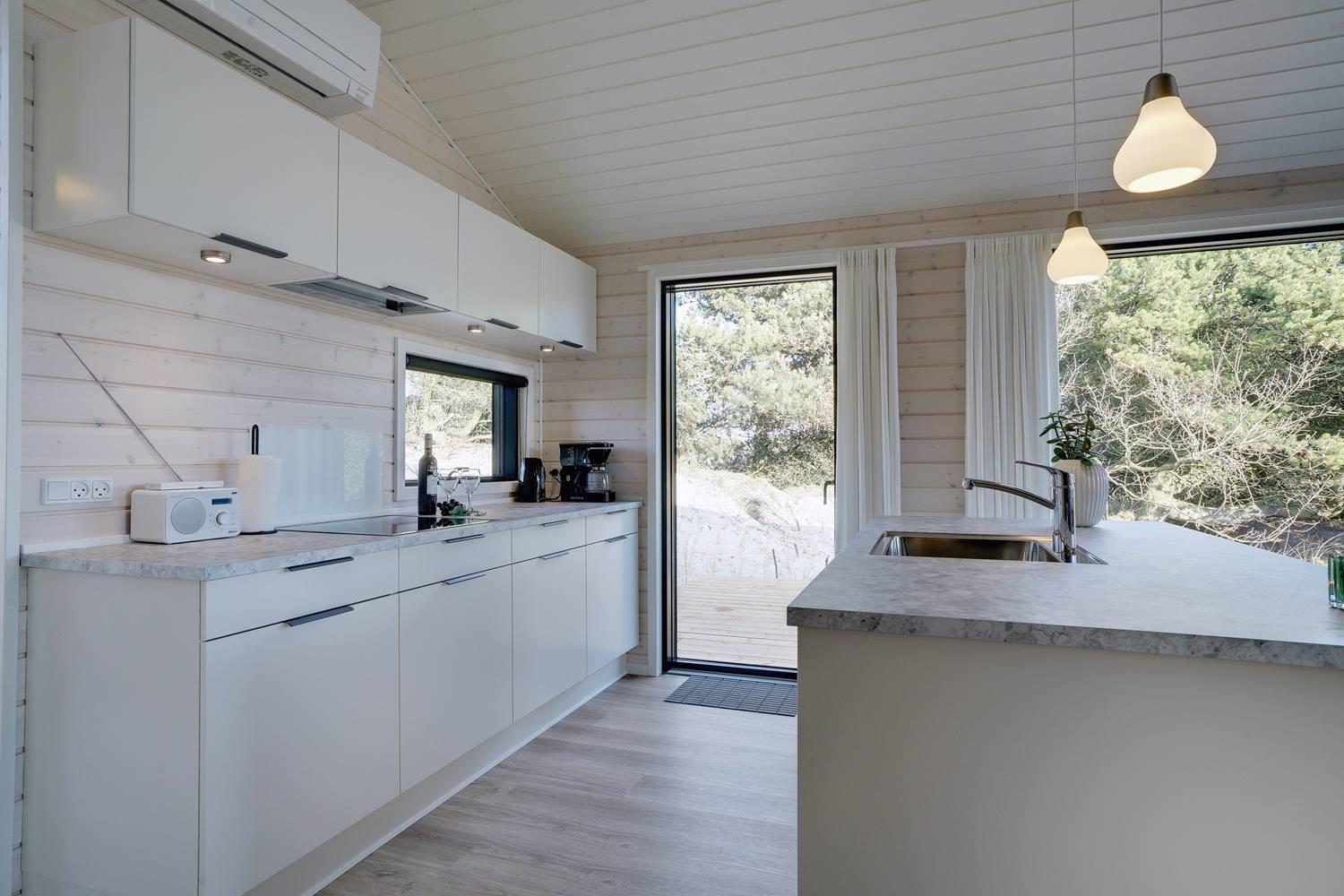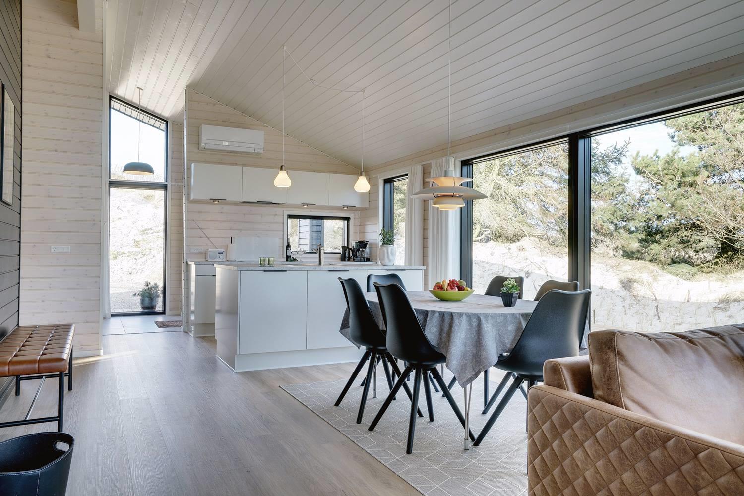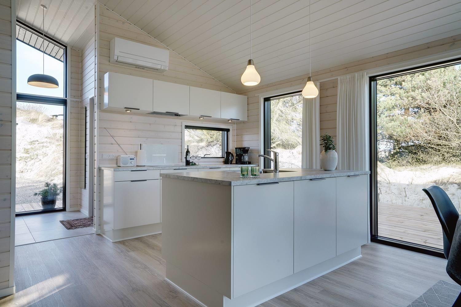 Sommerhuset byder på masser af moderne komfort uden at gå på kompromis med hyggen. Møblerne er velvalgte og elegante, og inventaret på badeværelserne matcher køkkenets. Begge badeværelser har gulvvarme og bruseniche, og det ene har endvidere en sauna, hvor I kan varme jer, hvis I holder ferie her i vinterhalvåret. Der er Chromecast til TVet, og I kan spille jeres egne playlister på radioen via Bluetooth.