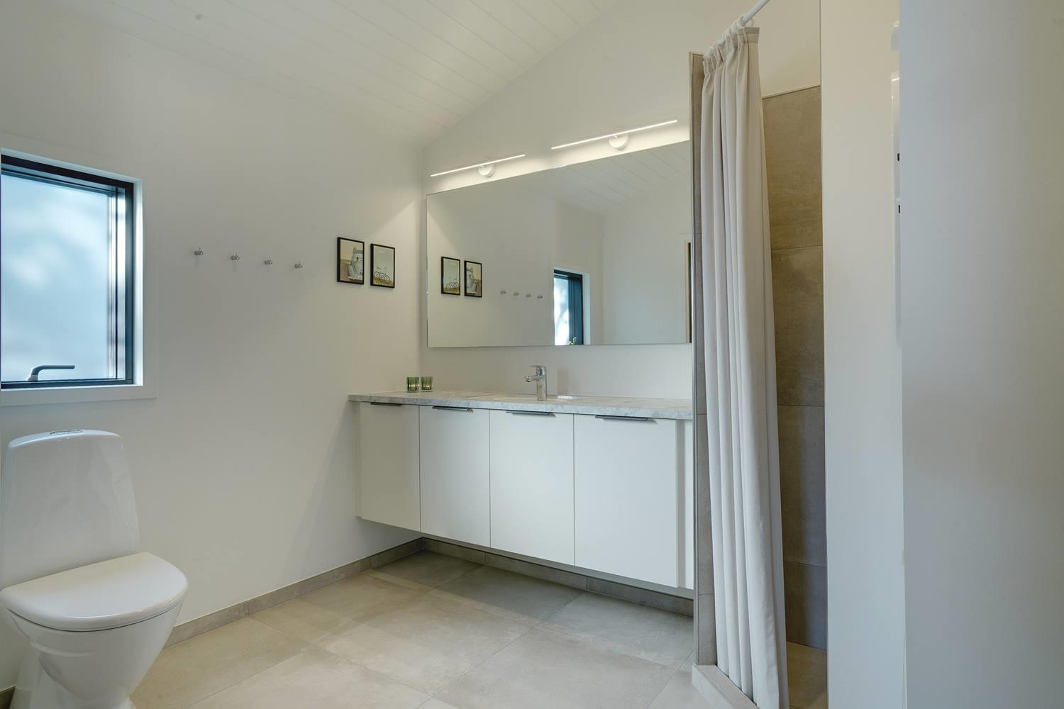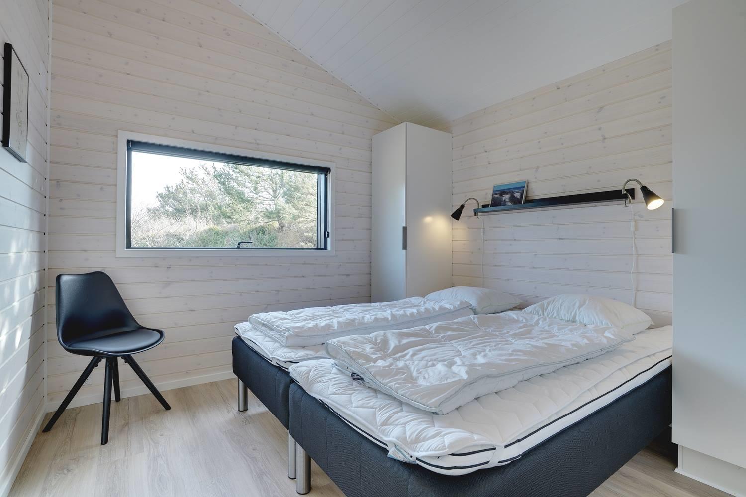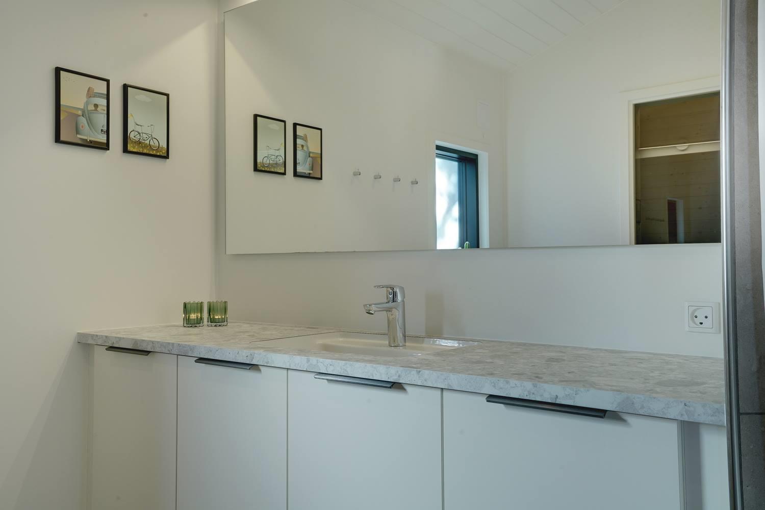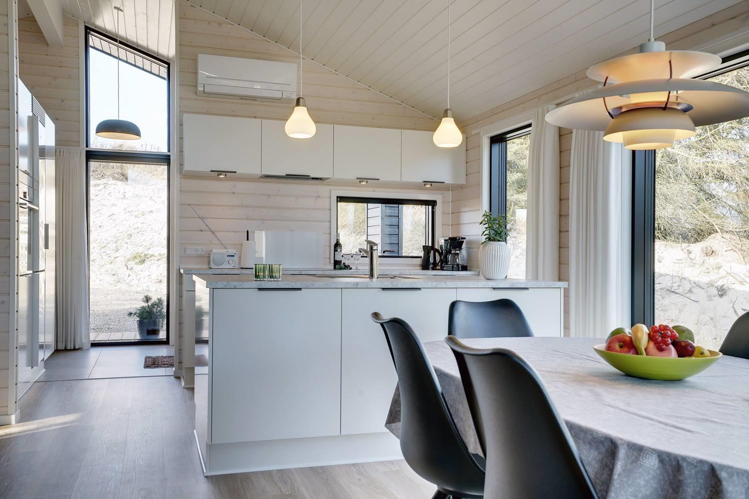 Sommerhuset byder på masser af moderne komfort uden at gå på kompromis med hyggen. Møblerne er velvalgte og elegante, og inventaret på badeværelserne matcher køkkenets. Begge badeværelser har gulvvarme og bruseniche, og det ene har endvidere en sauna, hvor I kan varme jer, hvis I holder ferie her i vinterhalvåret. Der er Chromecast til TVet, og I kan spille jeres egne playlister på radioen via Bluetooth.