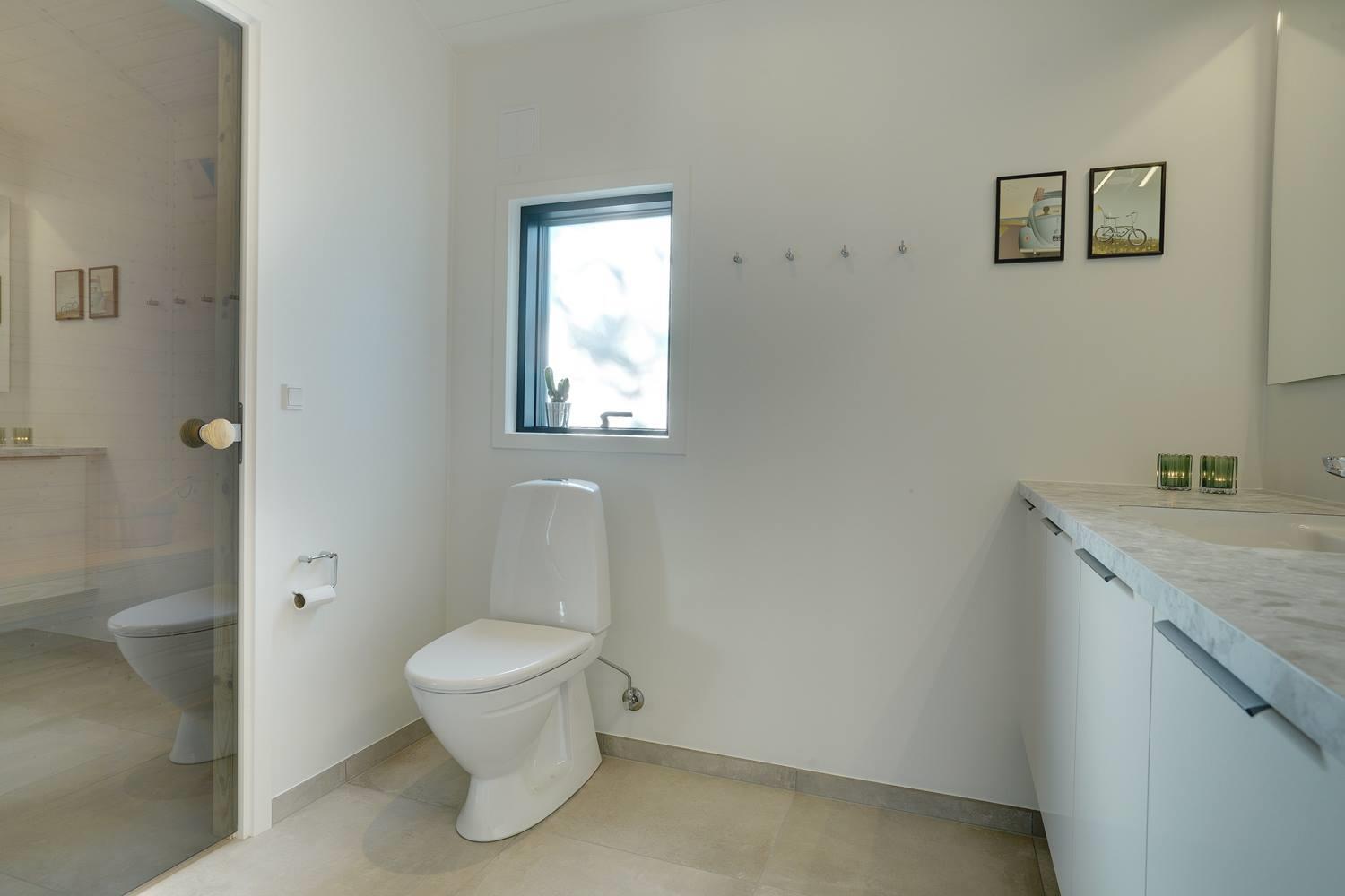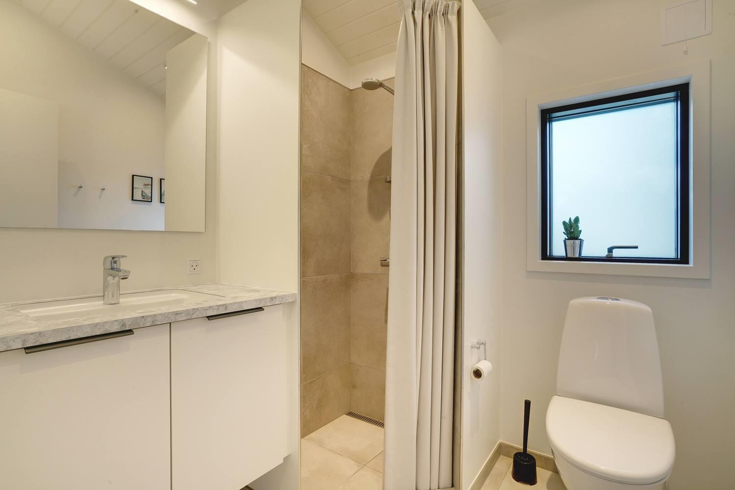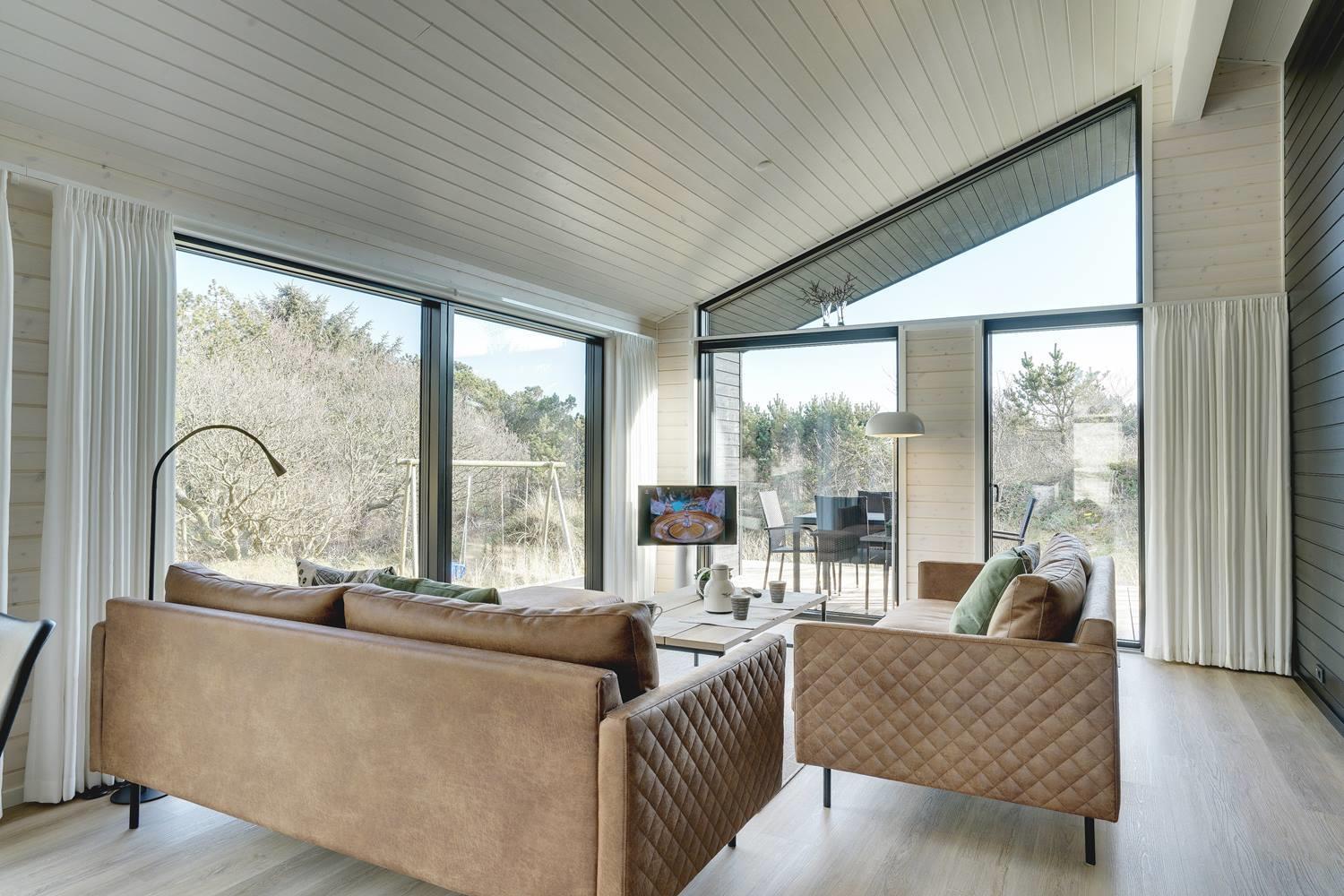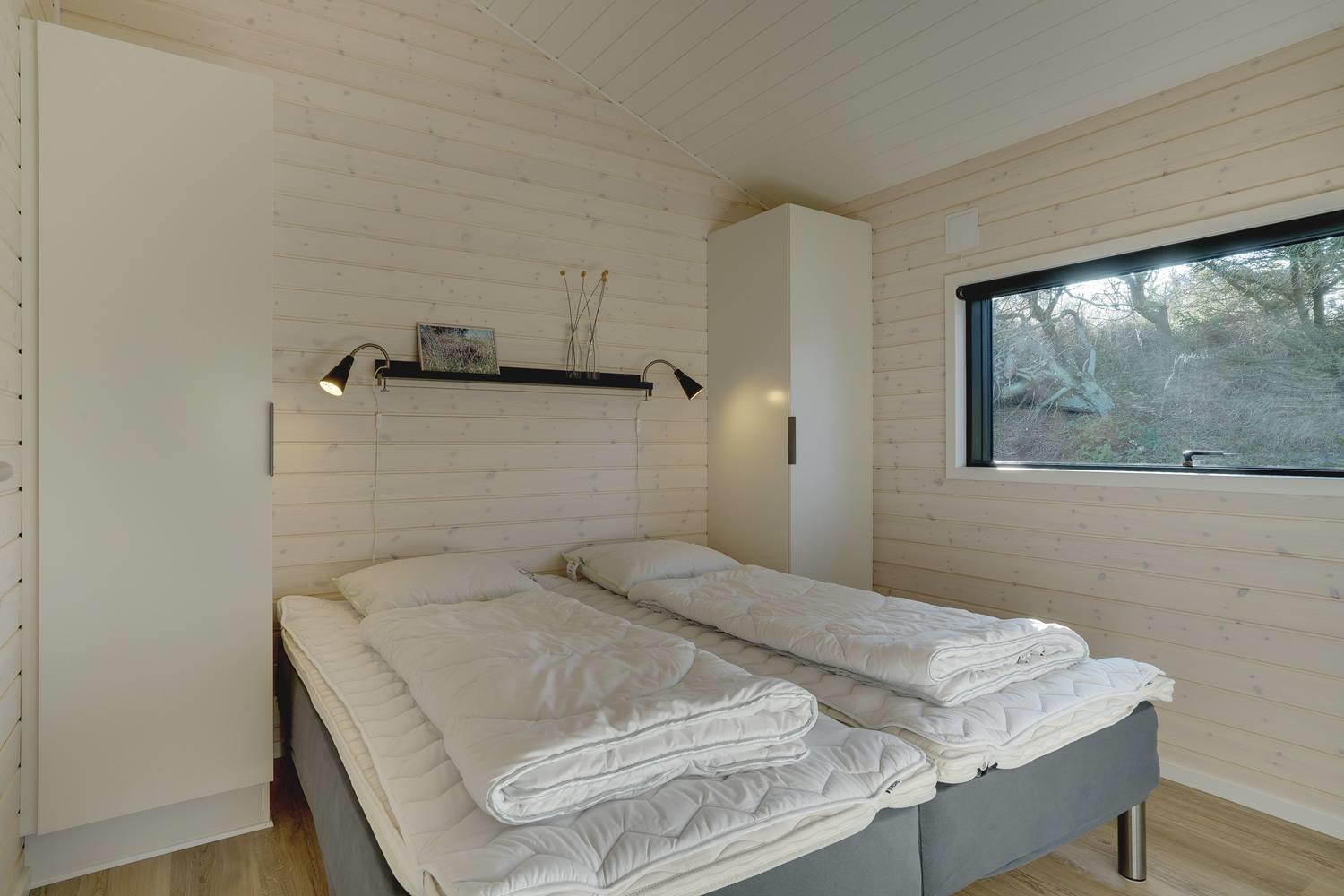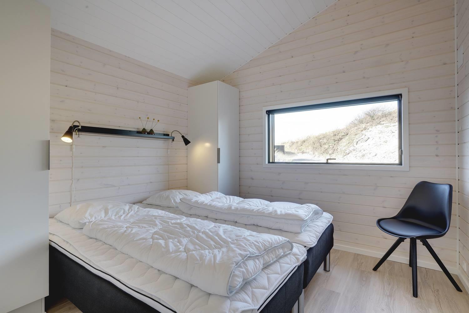 Sommerhuset byder på masser af moderne komfort uden at gå på kompromis med hyggen. Møblerne er velvalgte og elegante, og inventaret på badeværelserne matcher køkkenets. Begge badeværelser har gulvvarme og bruseniche, og det ene har endvidere en sauna, hvor I kan varme jer, hvis I holder ferie her i vinterhalvåret. Der er Chromecast til TVet, og I kan spille jeres egne playlister på radioen via Bluetooth.