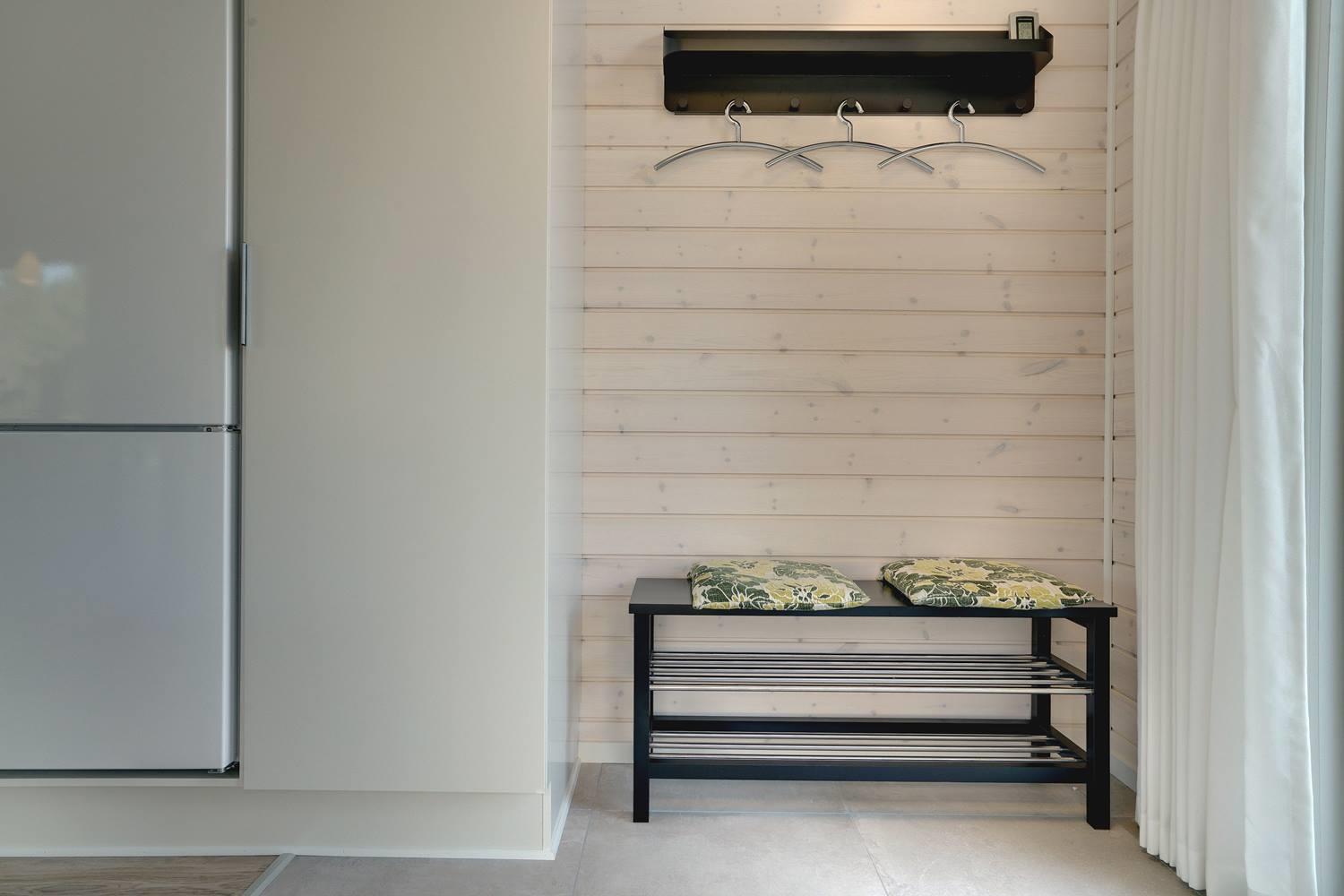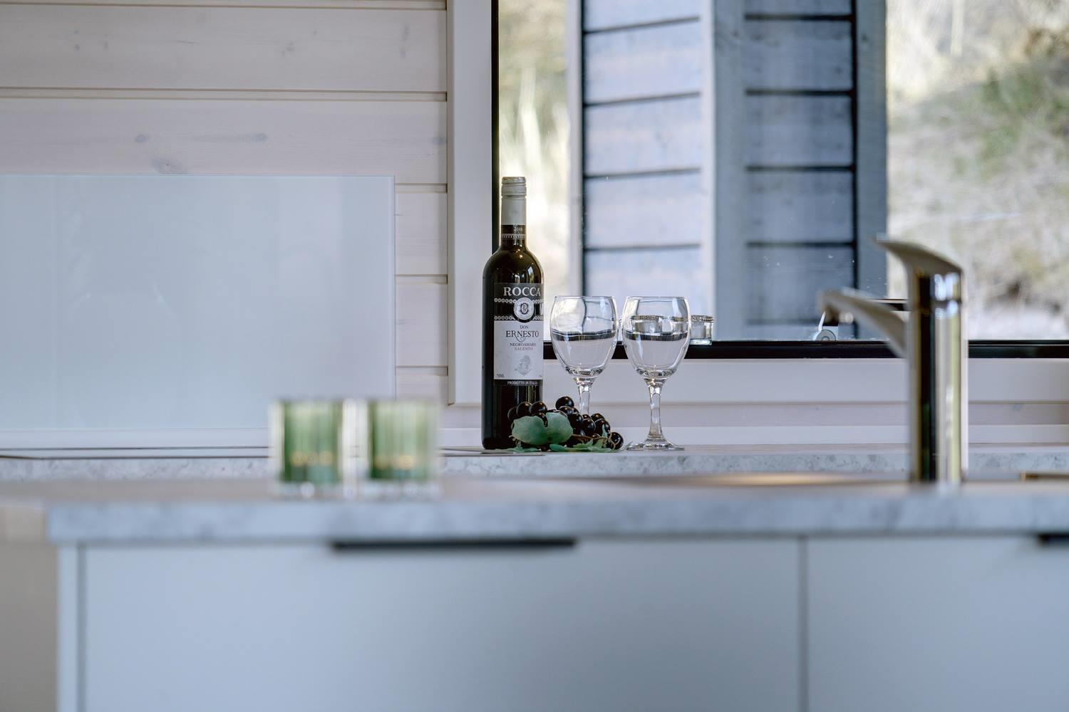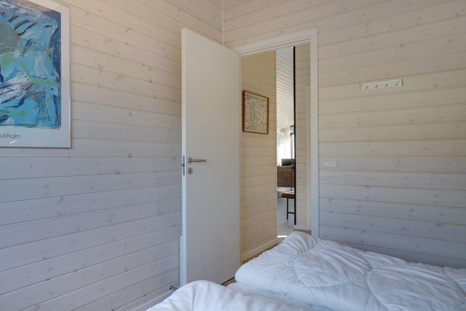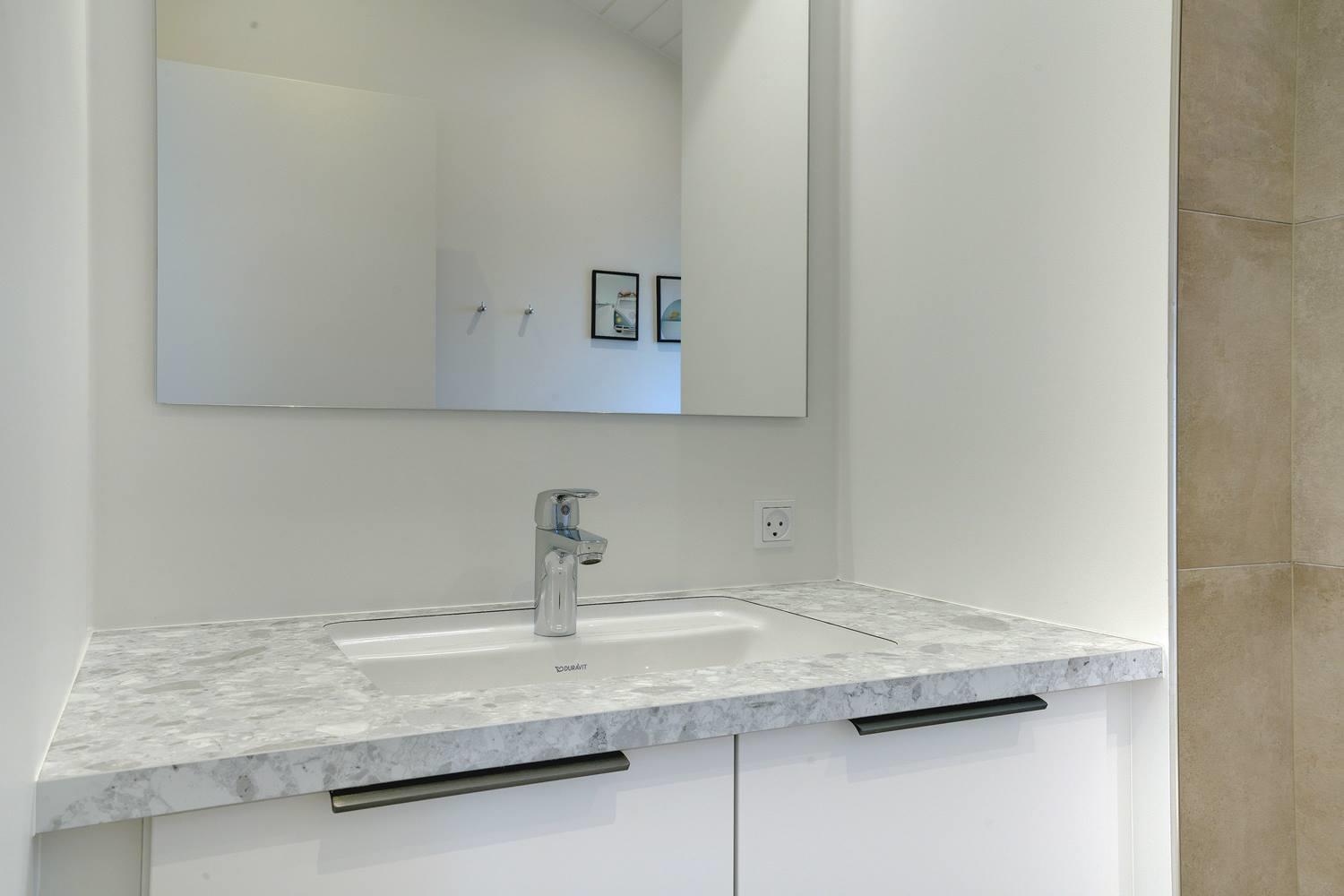 Sommerhuset byder på masser af moderne komfort uden at gå på kompromis med hyggen. Møblerne er velvalgte og elegante, og inventaret på badeværelserne matcher køkkenets. Begge badeværelser har gulvvarme og bruseniche, og det ene har endvidere en sauna, hvor I kan varme jer, hvis I holder ferie her i vinterhalvåret. Der er Chromecast til TVet, og I kan spille jeres egne playlister på radioen via Bluetooth.