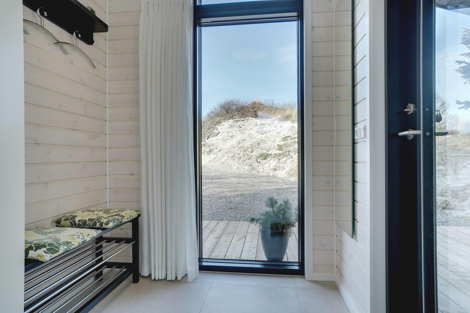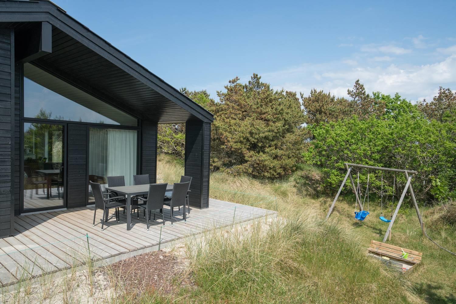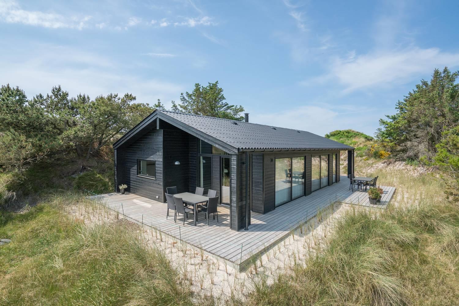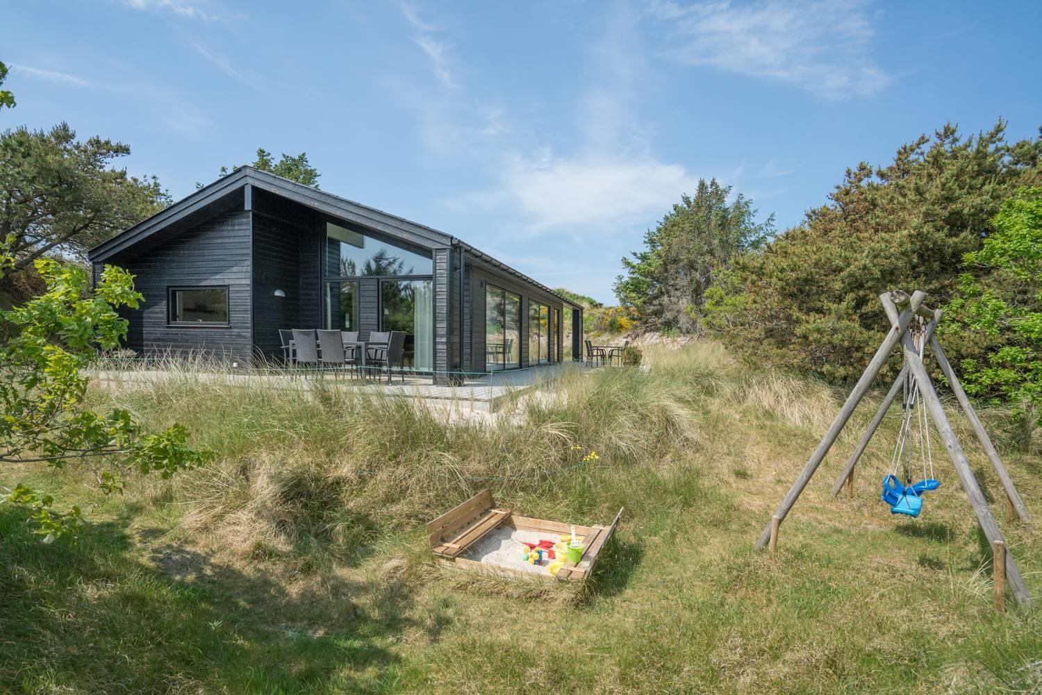 Henne Strand er kendt som en skøn, bred strand med kridhvidt sand - og blot en lille gåtur herfra ligger dette flotte sommerhus, som I kan booke til jeres næste ferie. Huset er utroligt lyst og ligger på en klitgrund, som kan nydes fra husets solrige terrasser.