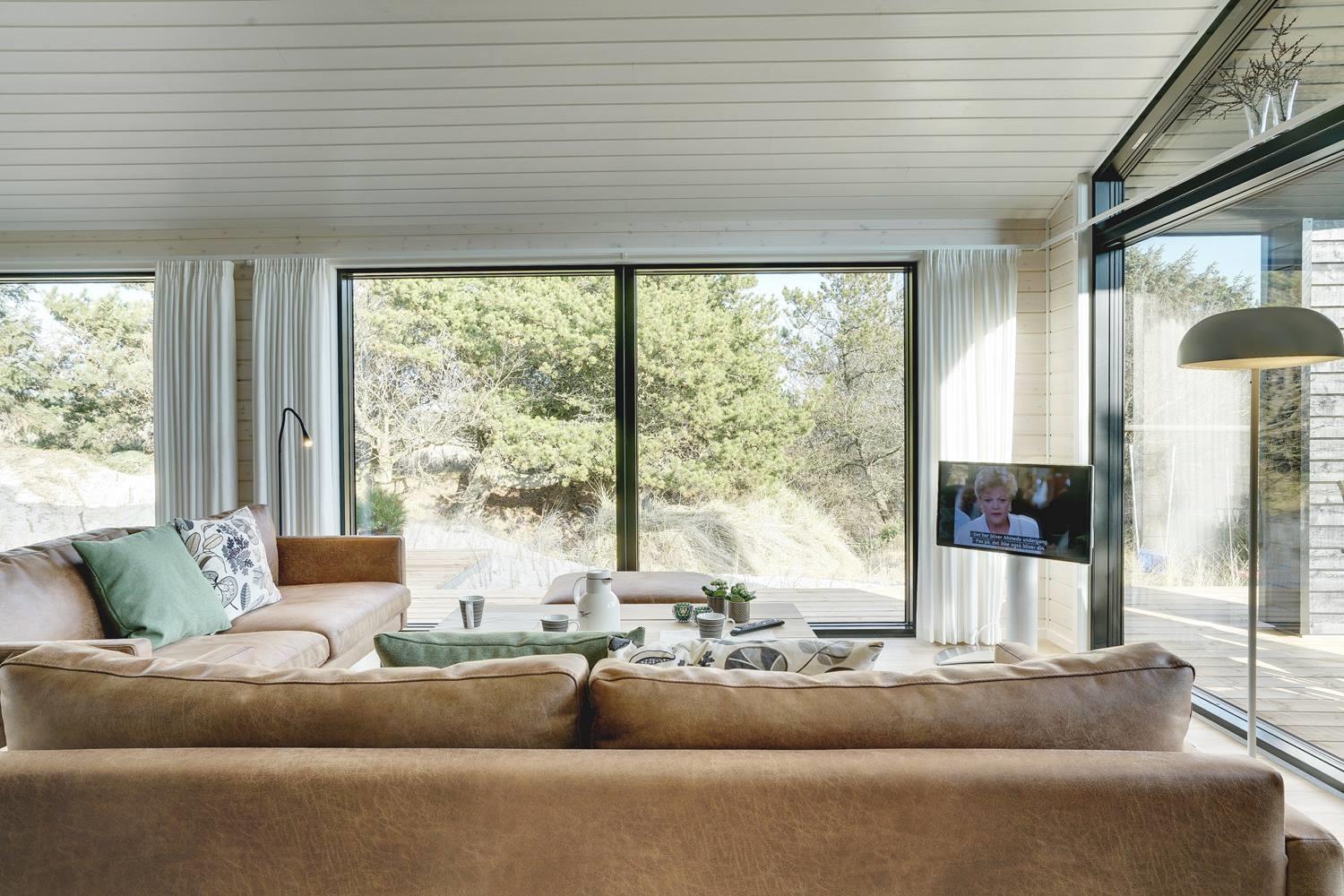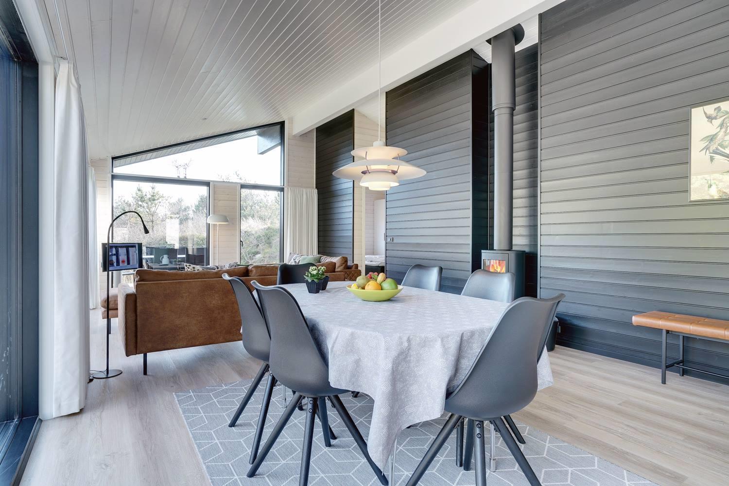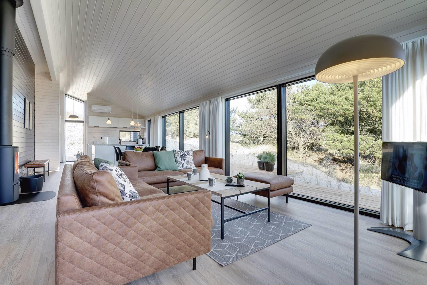 hyggelig brændeovn. Her kan eftermiddagskaffen nydes sammen med udsigten til naturens farver, gennem de store glaspartier, der strækker sig fra gulv til loft. Herudover byder huset på tre soveværelser med god skabsplads og dobbeltsenge, og endelig er her praktisk børneudstyr som babybadekar, barneseng og højstol.