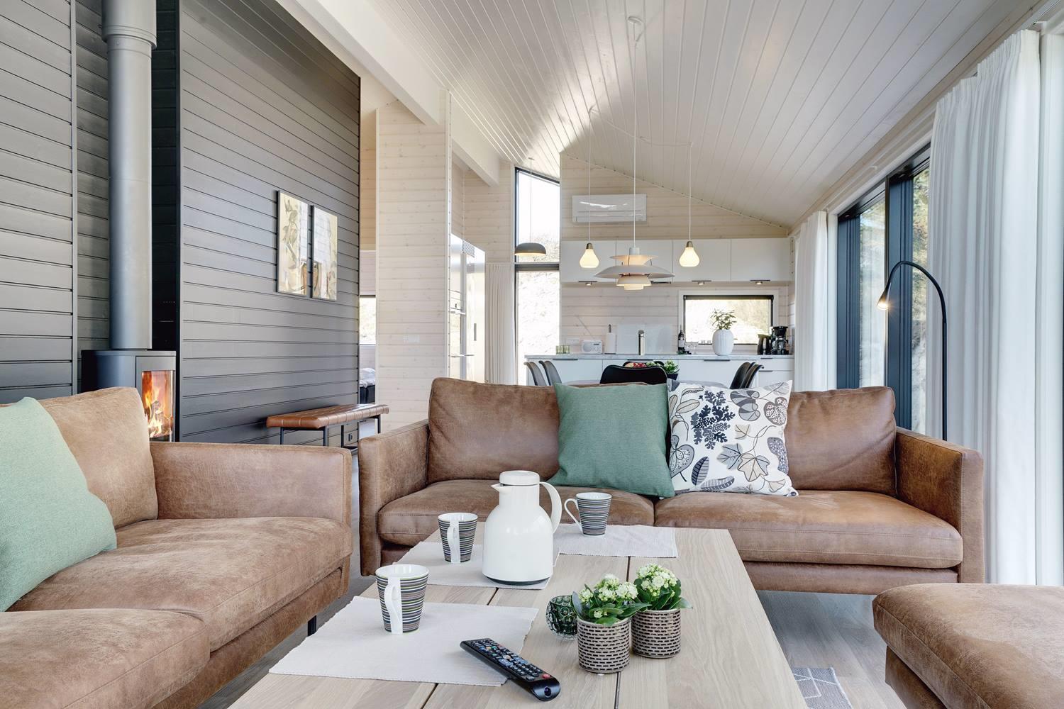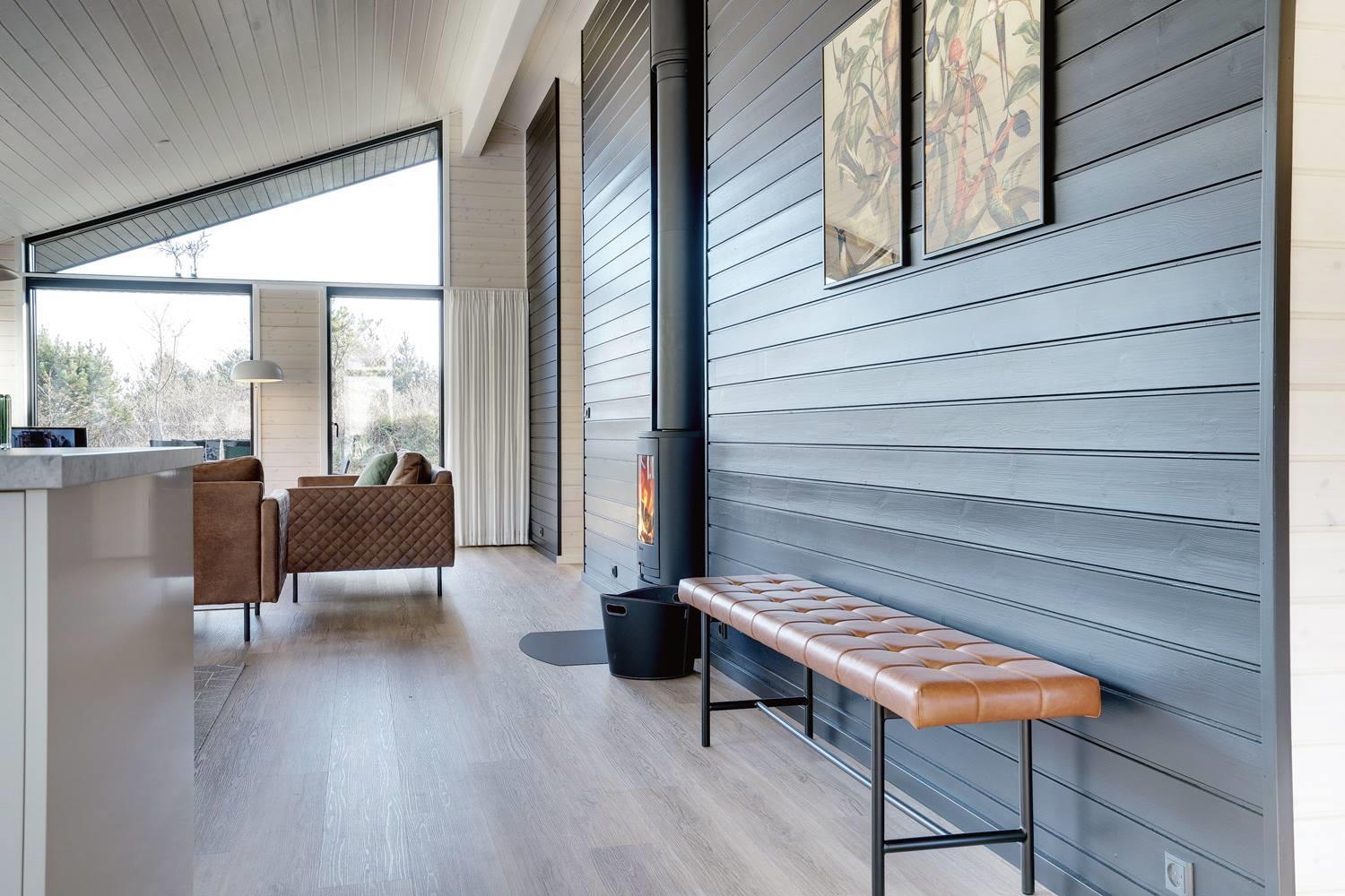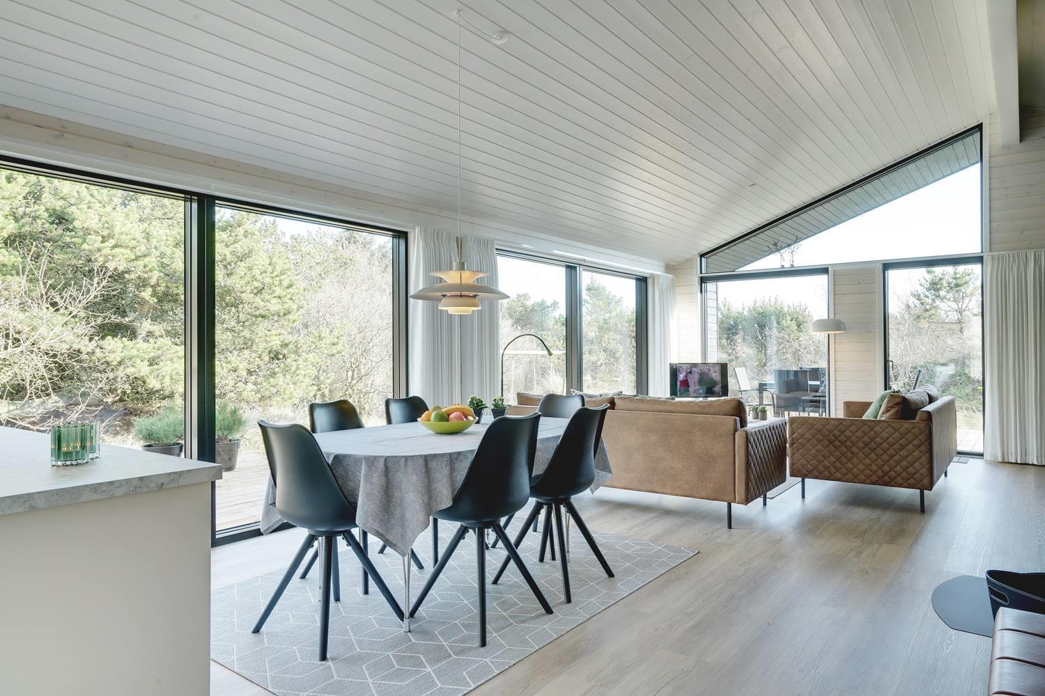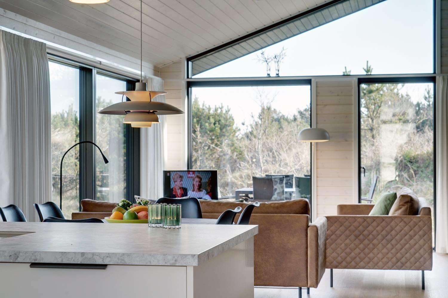 hyggelig brændeovn. Her kan eftermiddagskaffen nydes sammen med udsigten til naturens farver, gennem de store glaspartier, der strækker sig fra gulv til loft. Herudover byder huset på tre soveværelser med god skabsplads og dobbeltsenge, og endelig er her praktisk børneudstyr som babybadekar, barneseng og højstol.