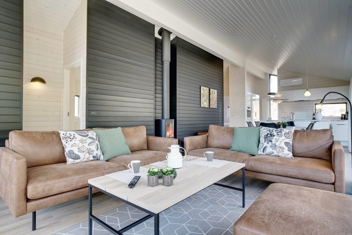 Huset rummer et dejligt, stort opholdsmiljø med stue og køkken i ét, som opvarmes af en