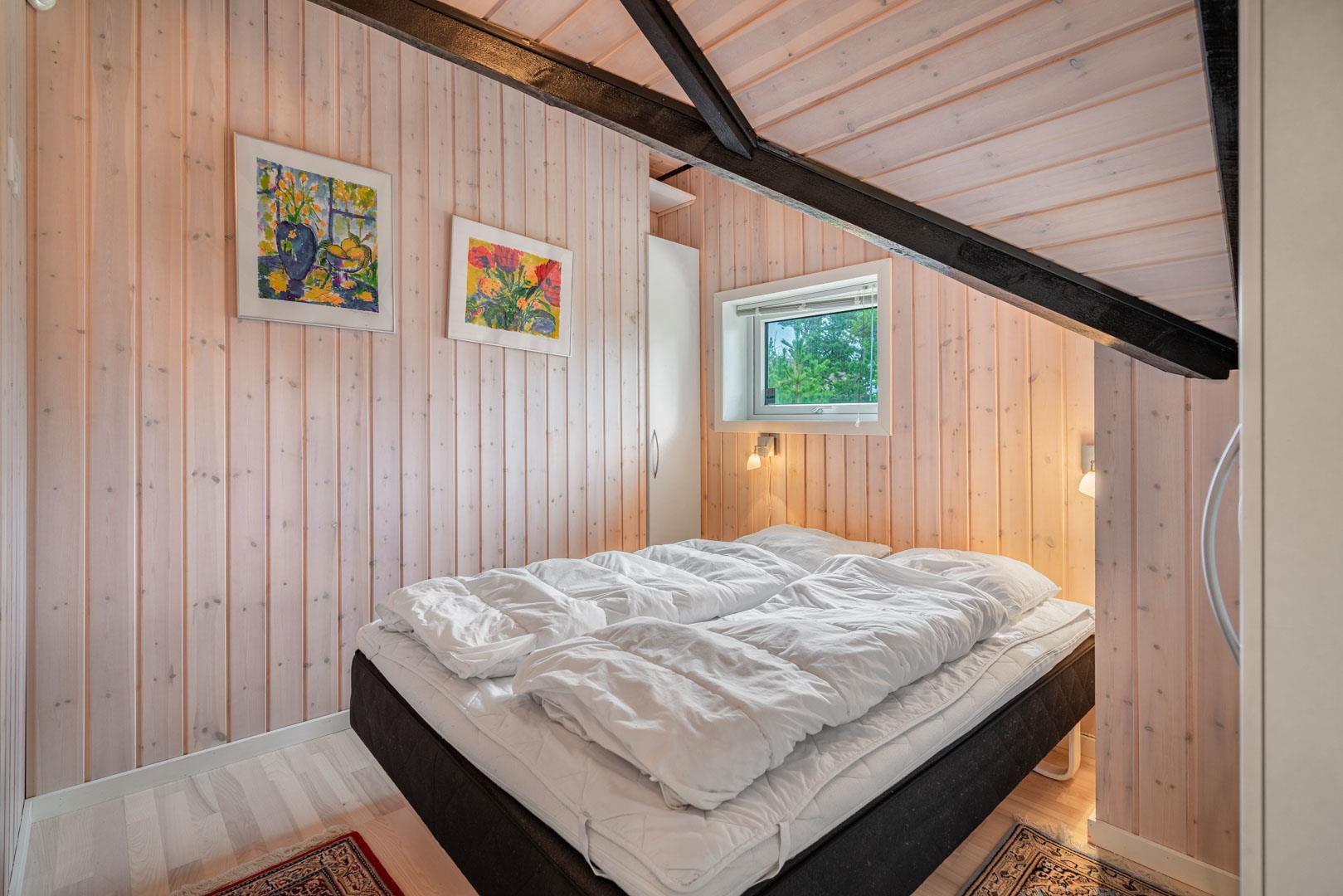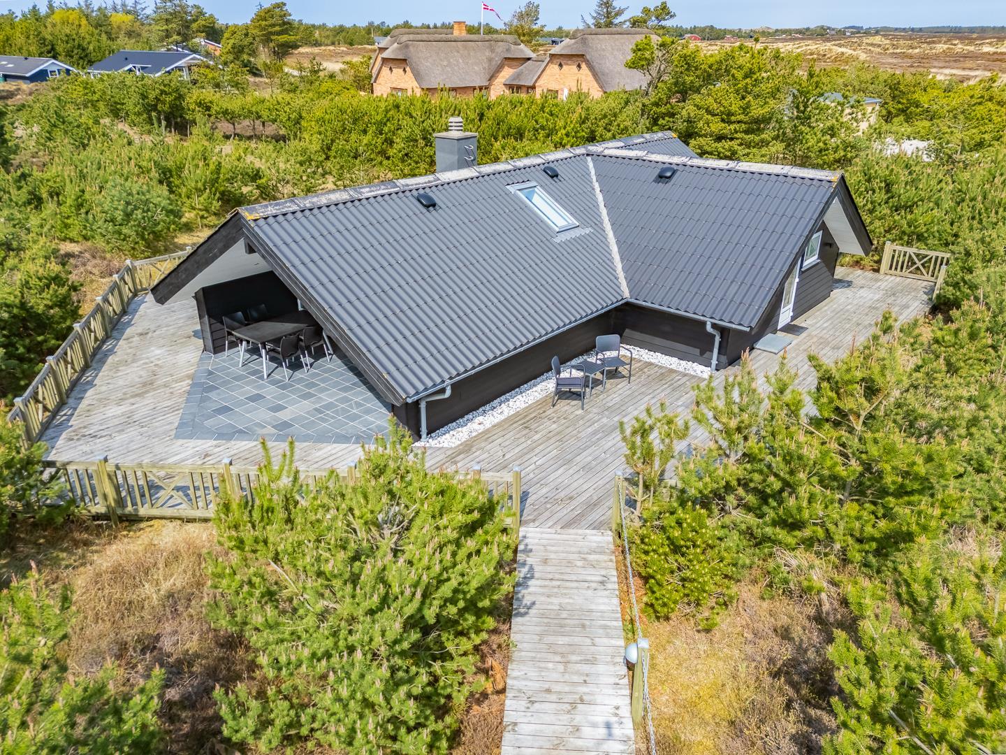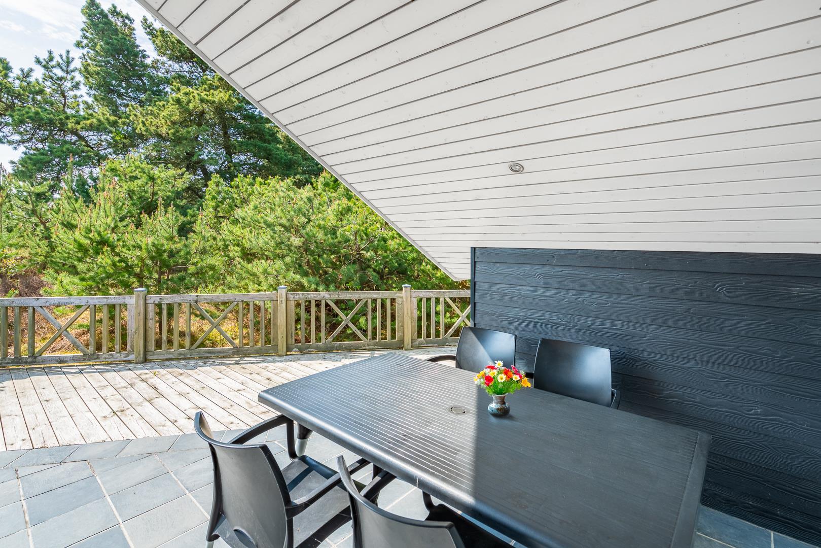 Fra stuen er der direkte adgang til en overdækket og flisebelagt terrasse. Her kan du nyde måltider eller en kop kaffe i det fri – selv når vejret ikke viser sig fra sin bedste side. Sommerhuset er desuden omgivet af en rummelig træterrasse, der indbyder til morgenkaffe i solen, afslapning i liggestolen eller grillhygge under åben himmel. Her kan ferien nydes fra morgen til aften.
