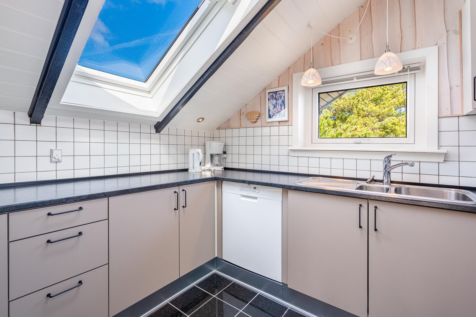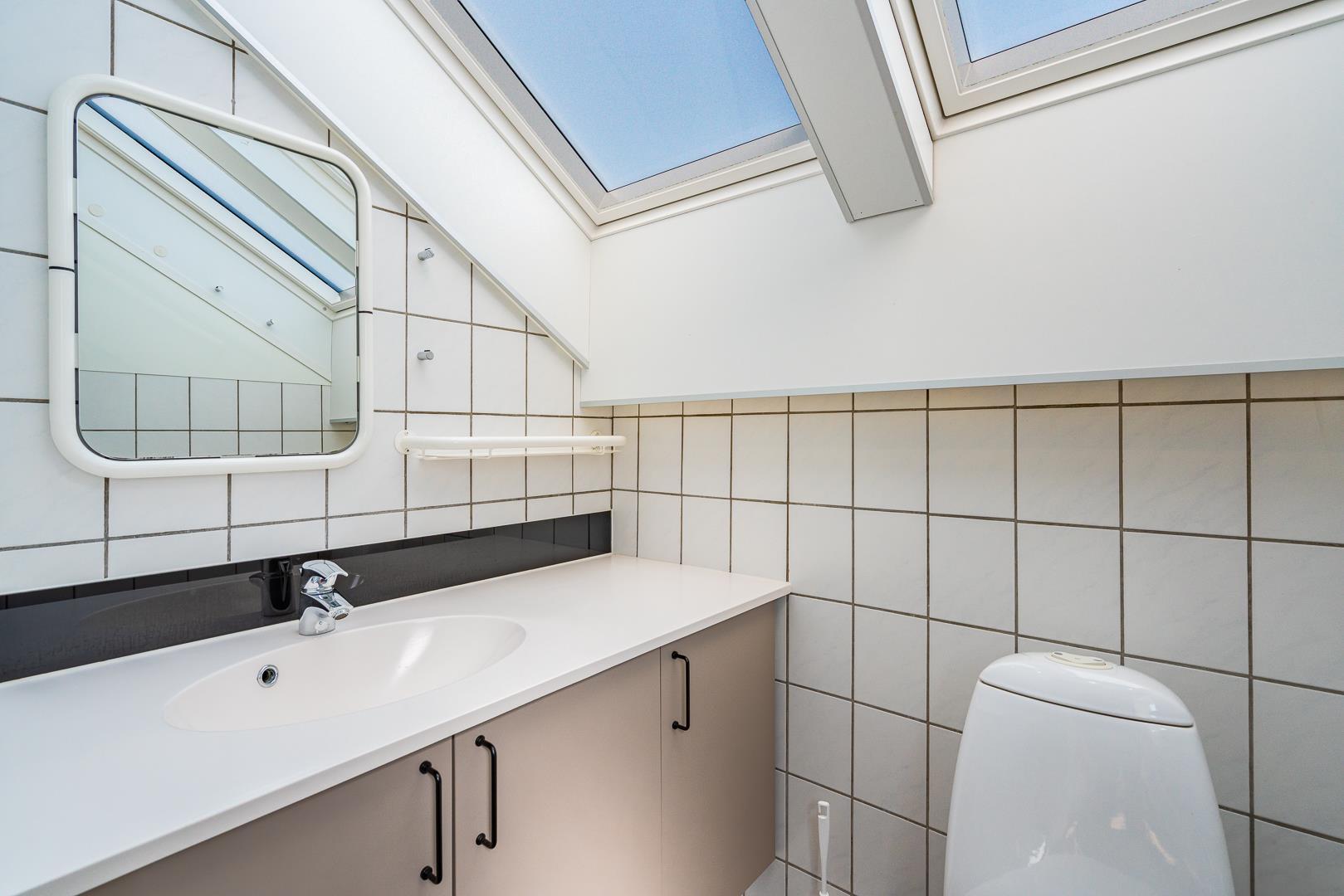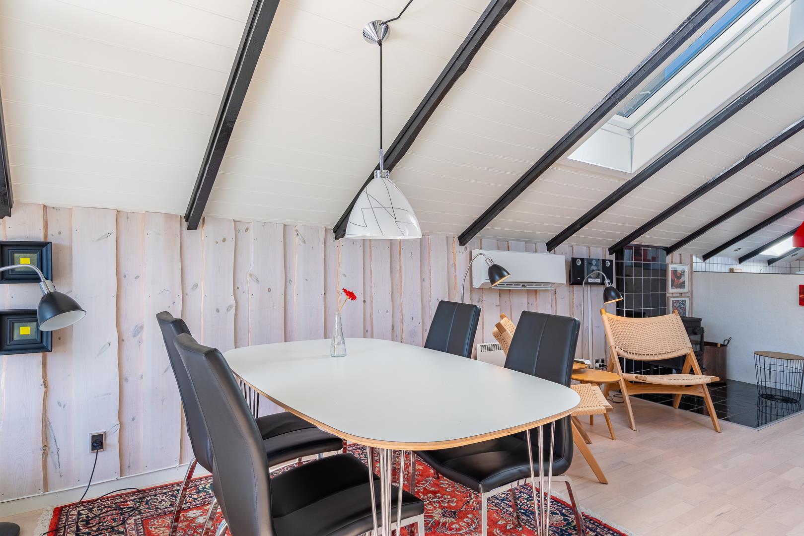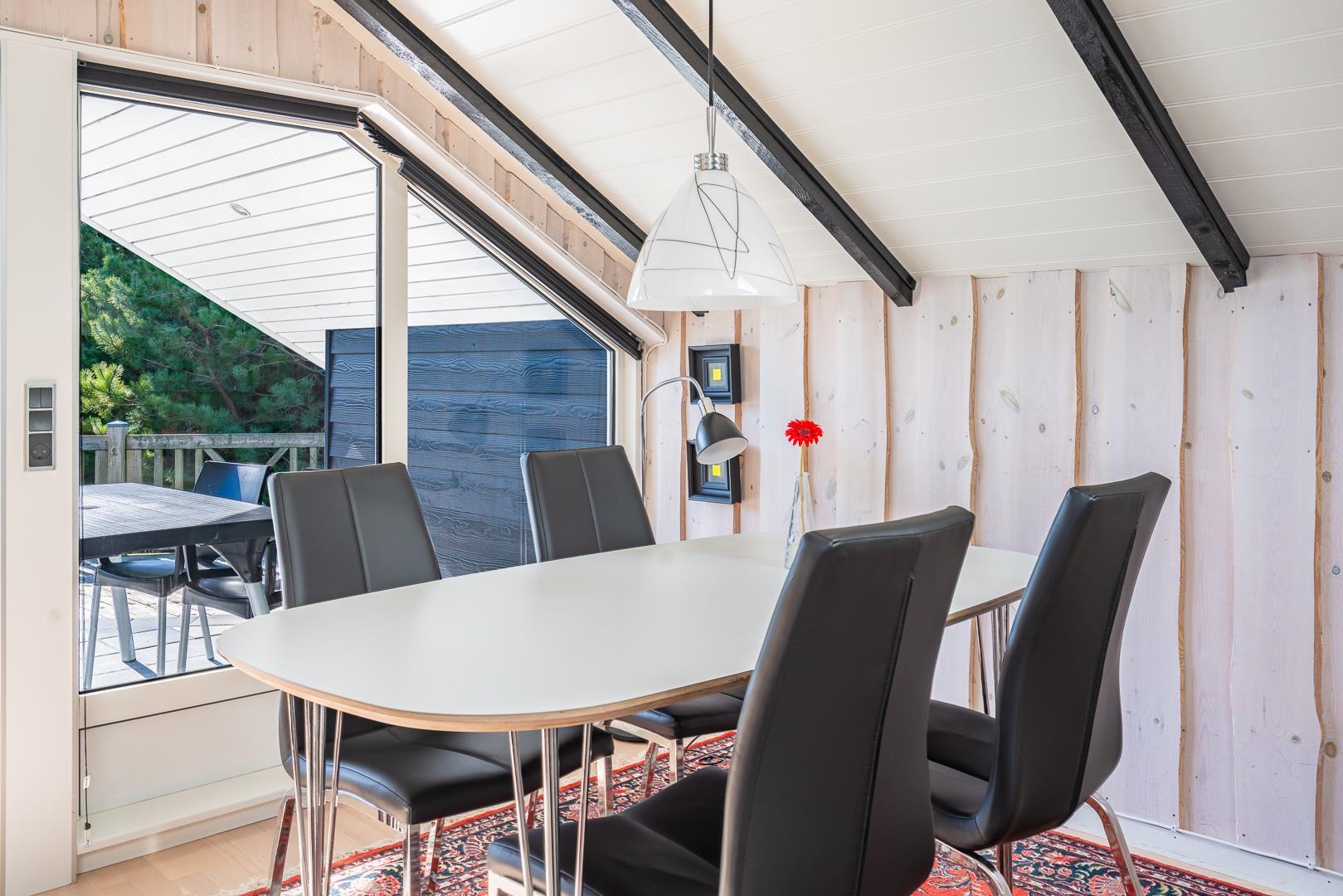 Store vinduespartier og ovenlysvinduer lukker masser af dagslys ind og skaber en lys og indbydende atmosfære. Naturen bliver en del af indretningen, og du kan nyde udsigten både inde og ude.