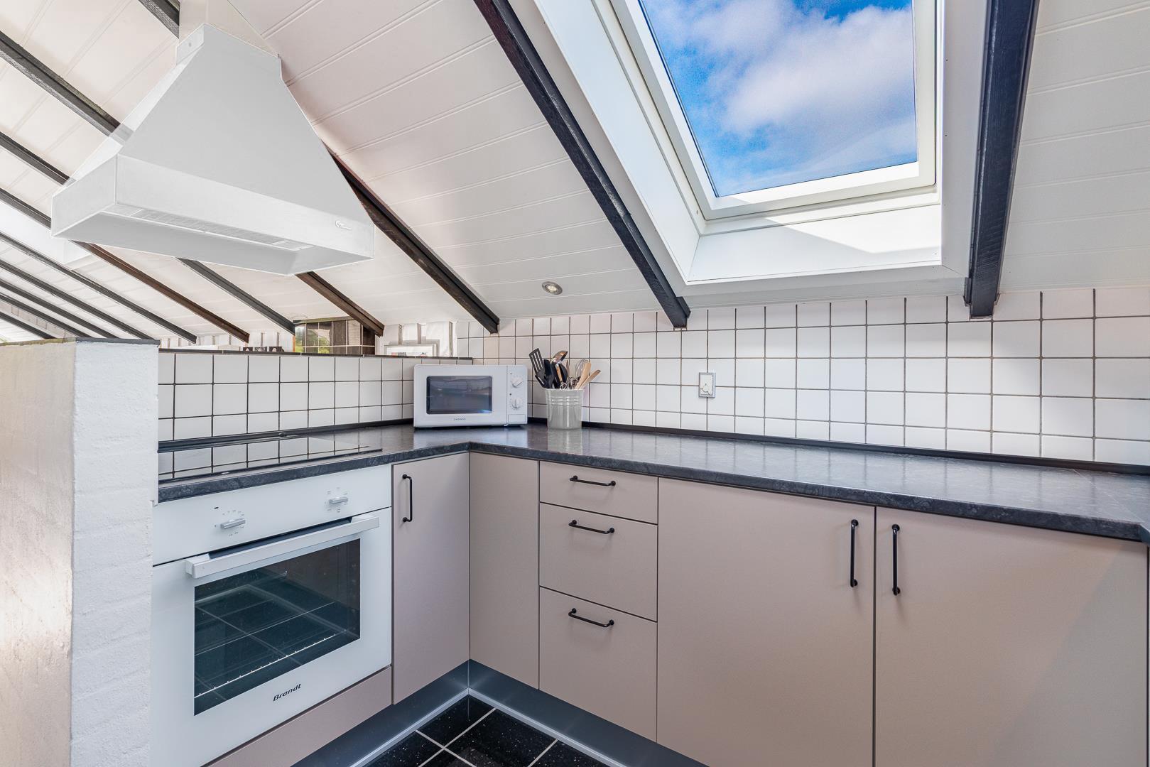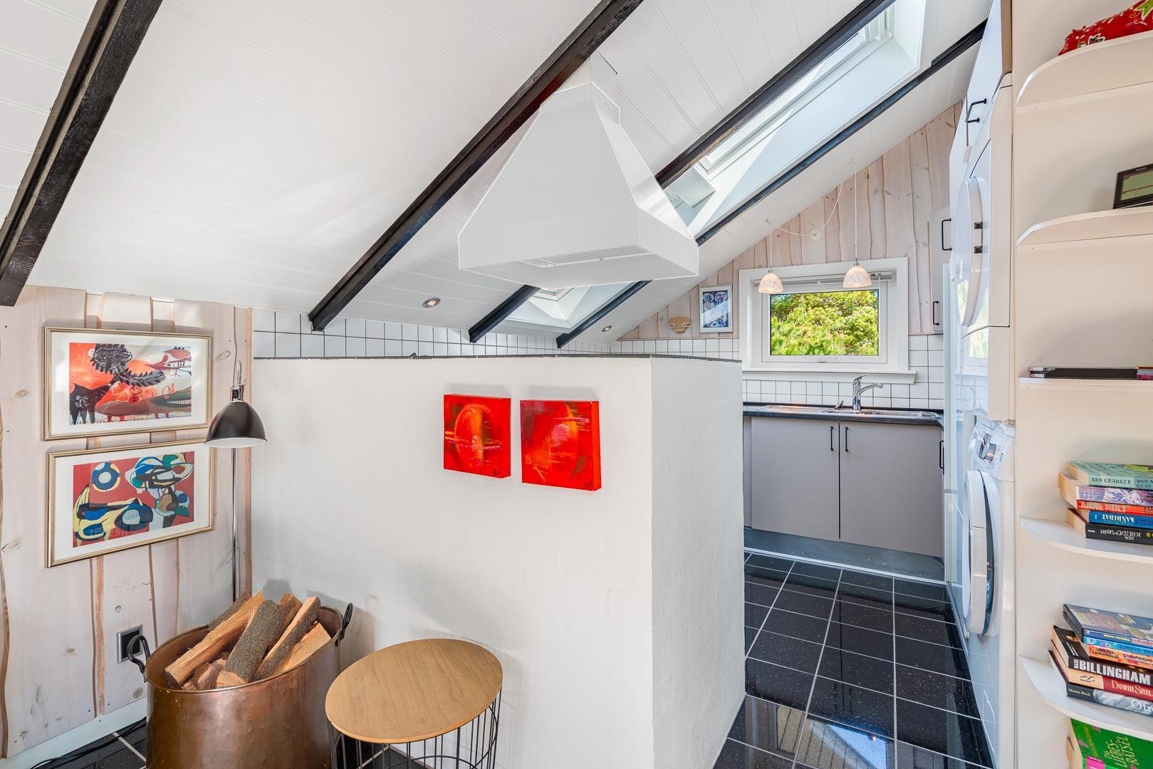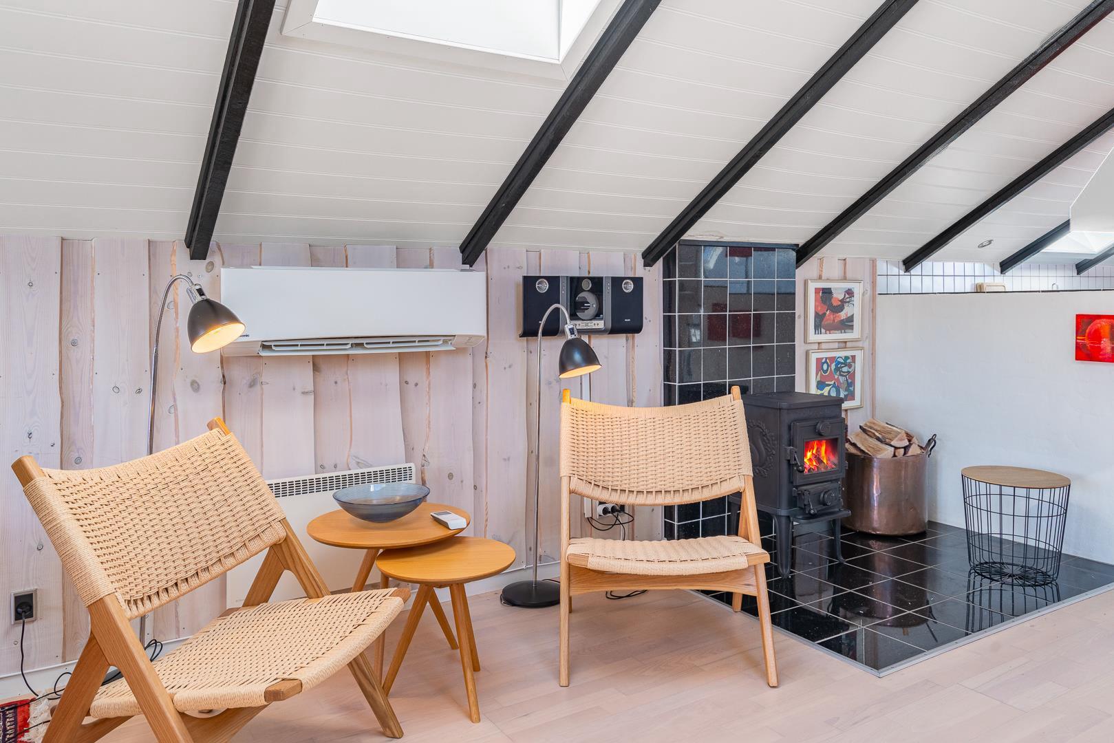 Inde i huset finder du en hyggelig stue med brændeovn, som er åbent forbundet med et veludstyret køkken. Det åbne rum giver mulighed for nærvær og samvær – selv når der laves mad.
