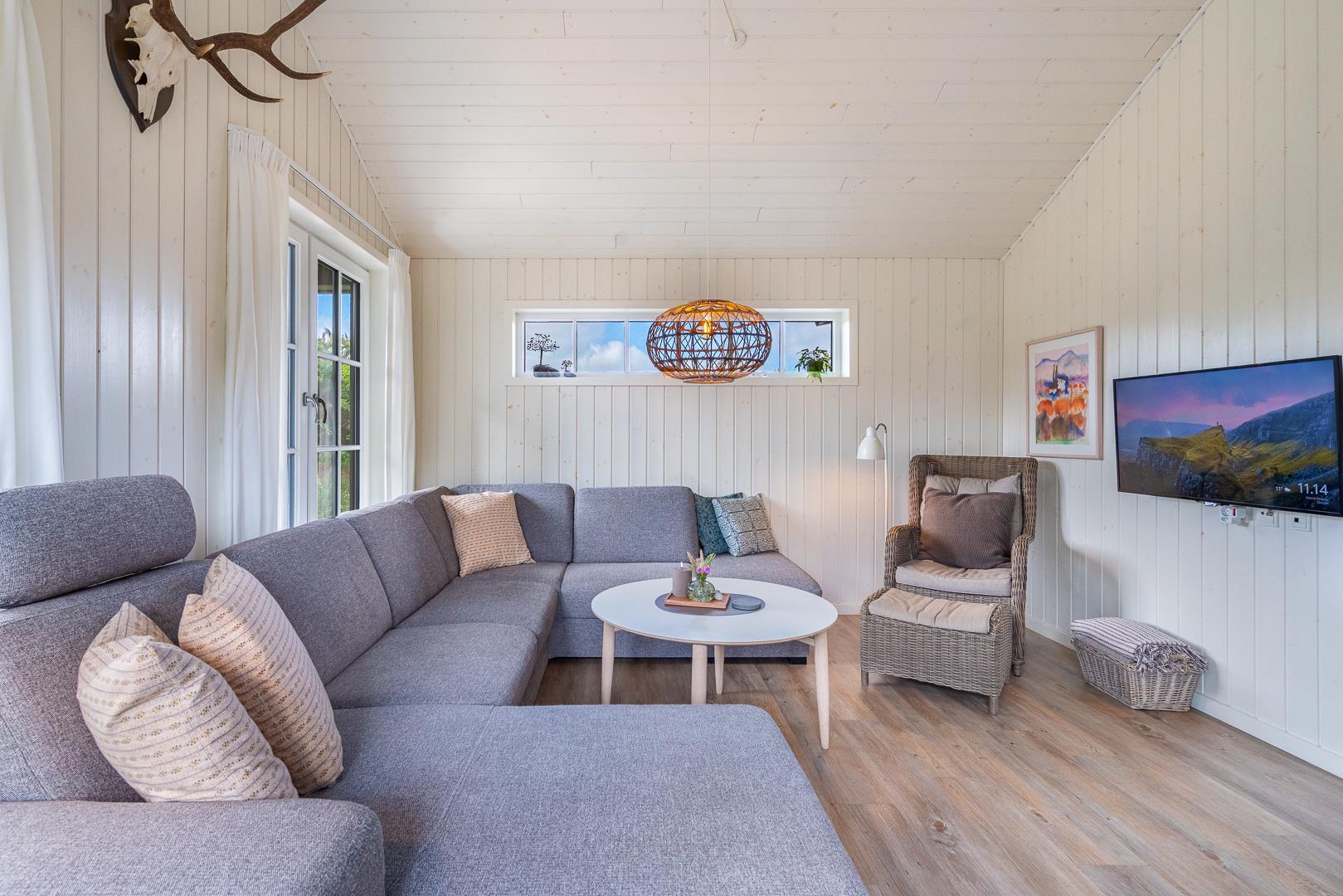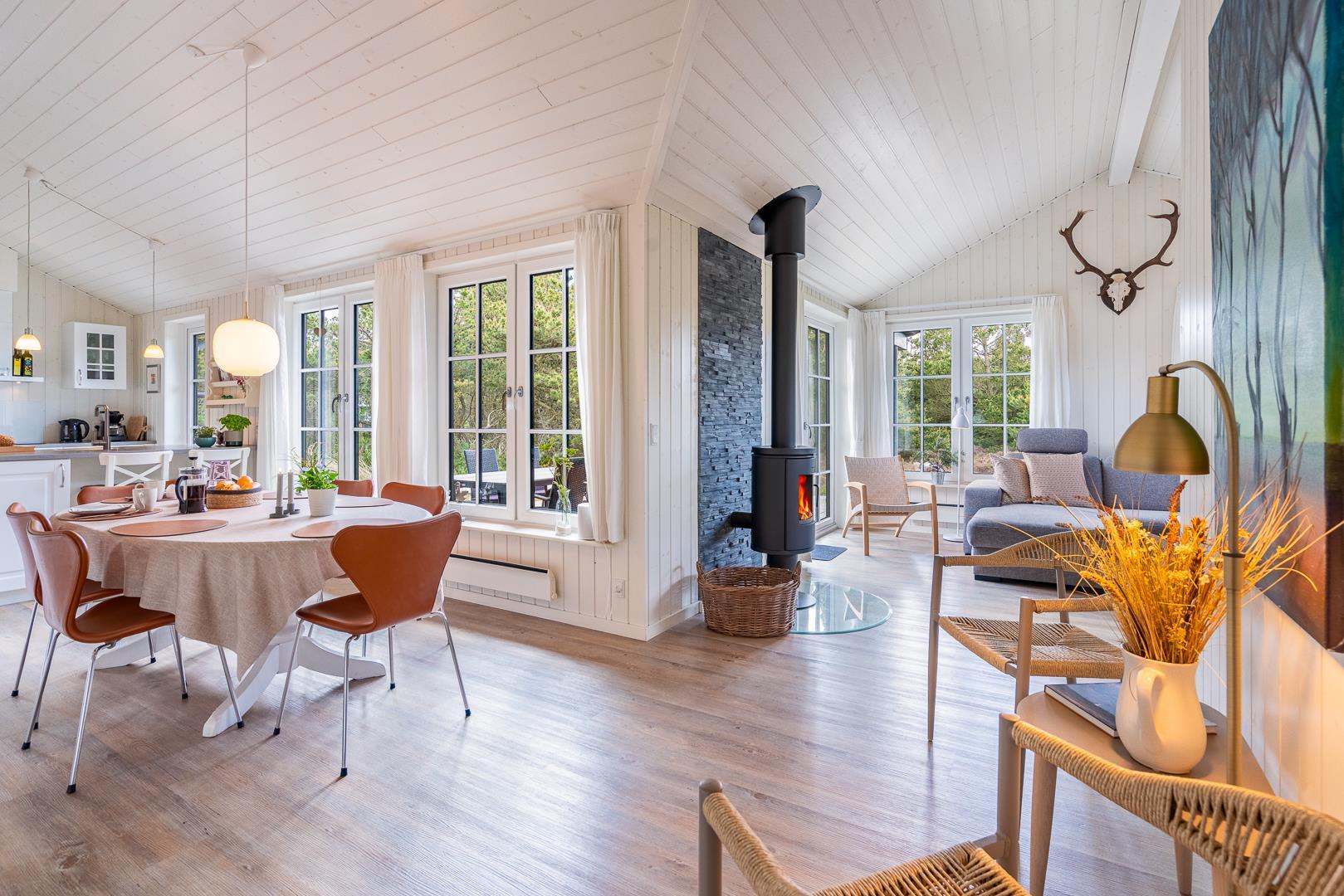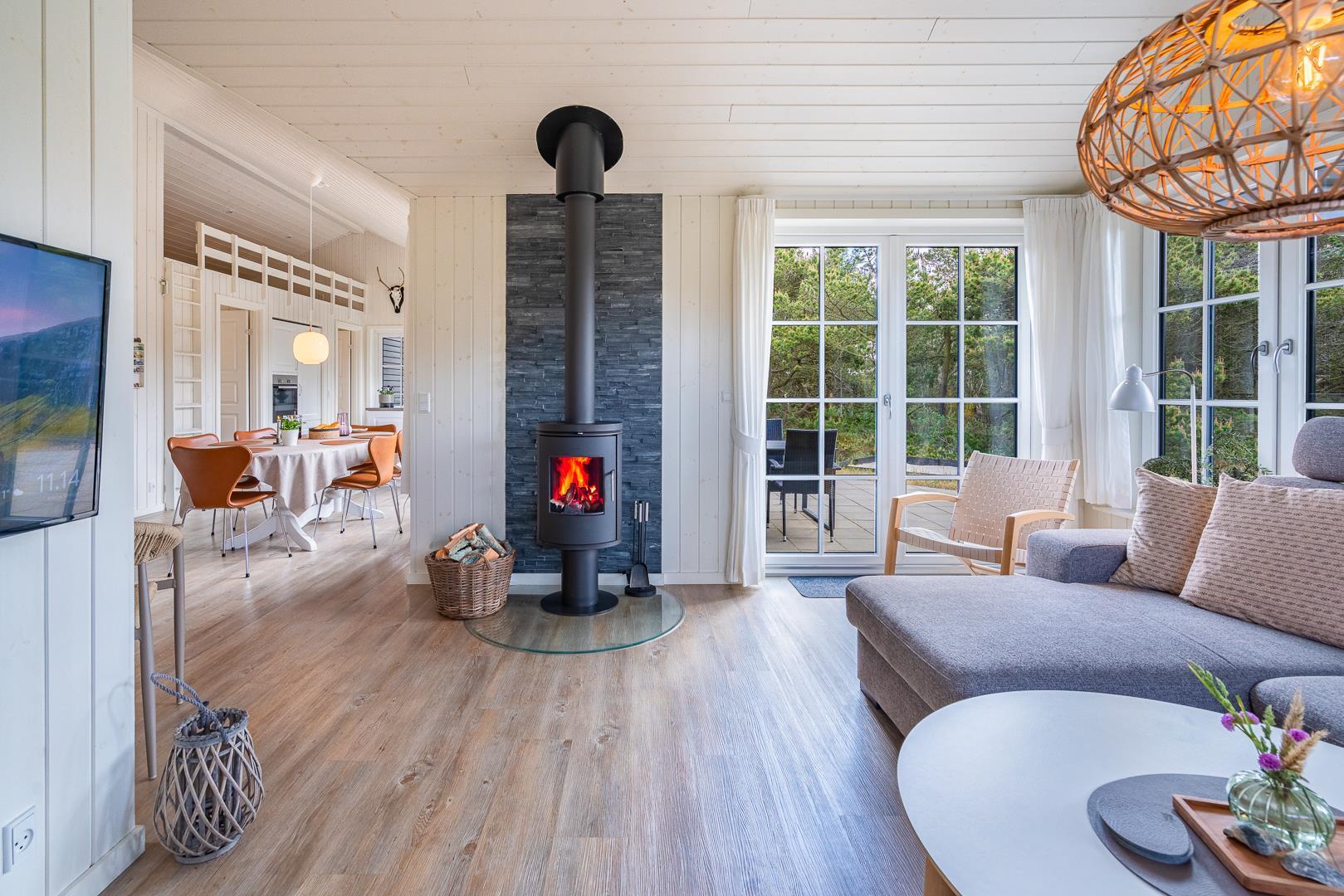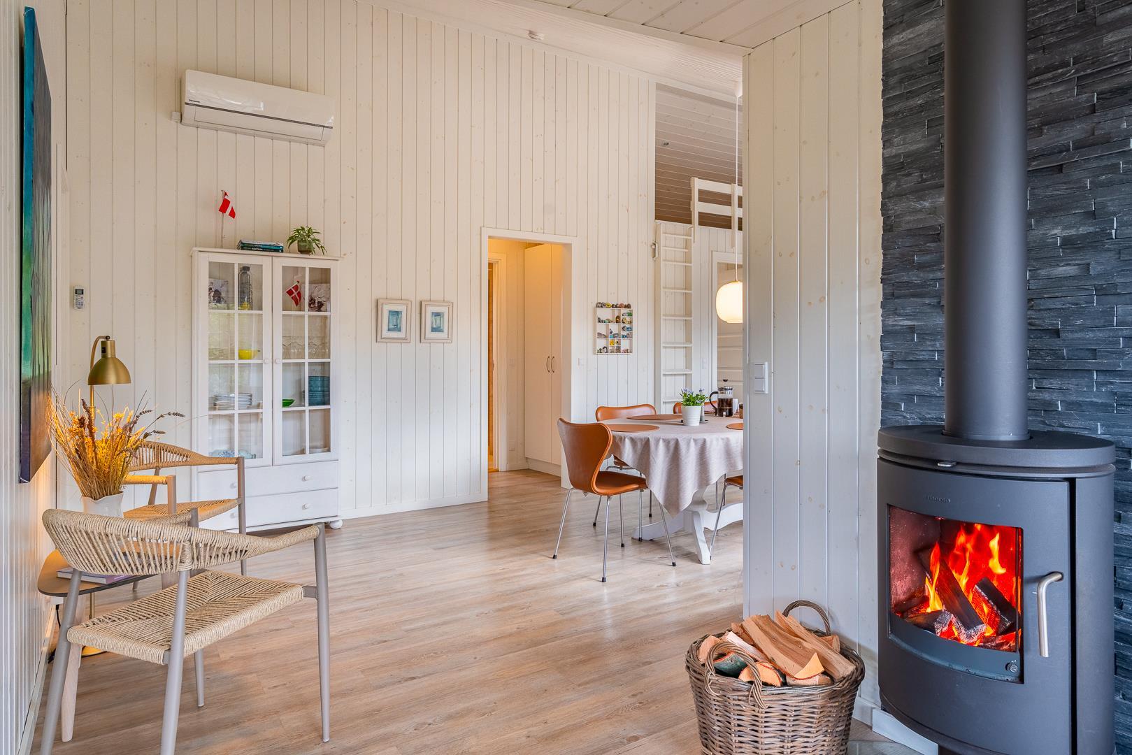 Stuen har også brændeovn til de kølige hyggeaftener, og har I lyst til at flade lidt ud foran fjernsynet, kan I tænde for Chromecasten og se videre på jeres yndlingsserie eller blot vælge imellem udvalget af danske og tyske kanaler.