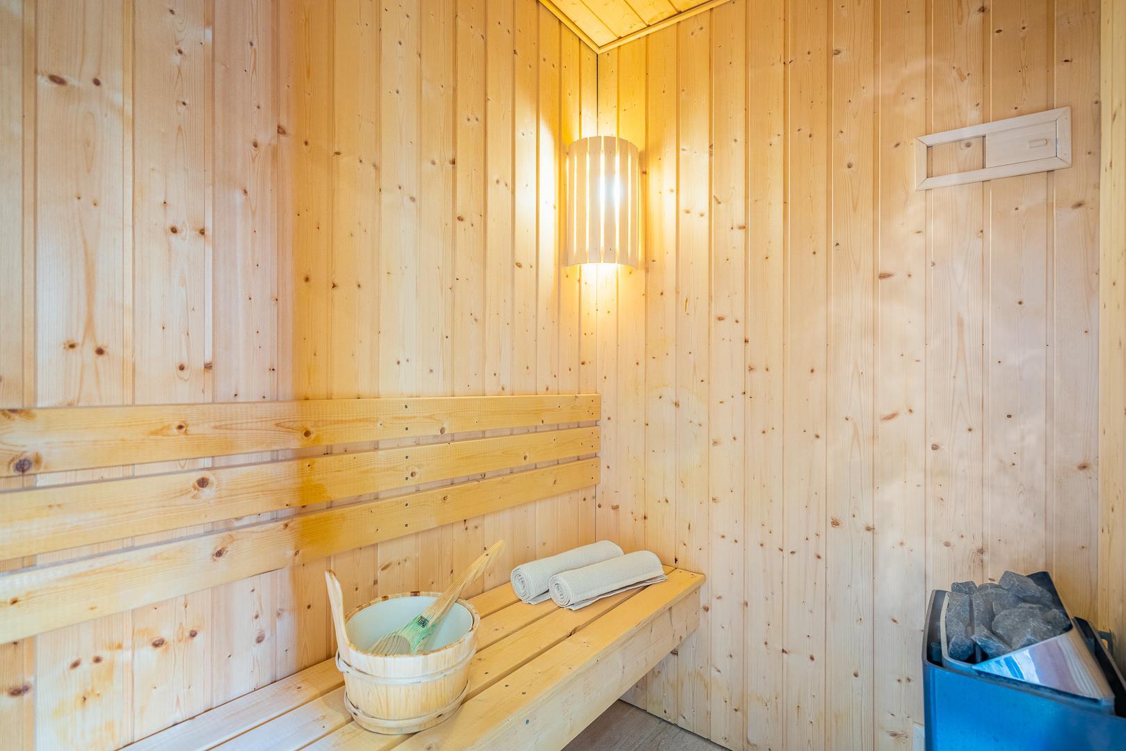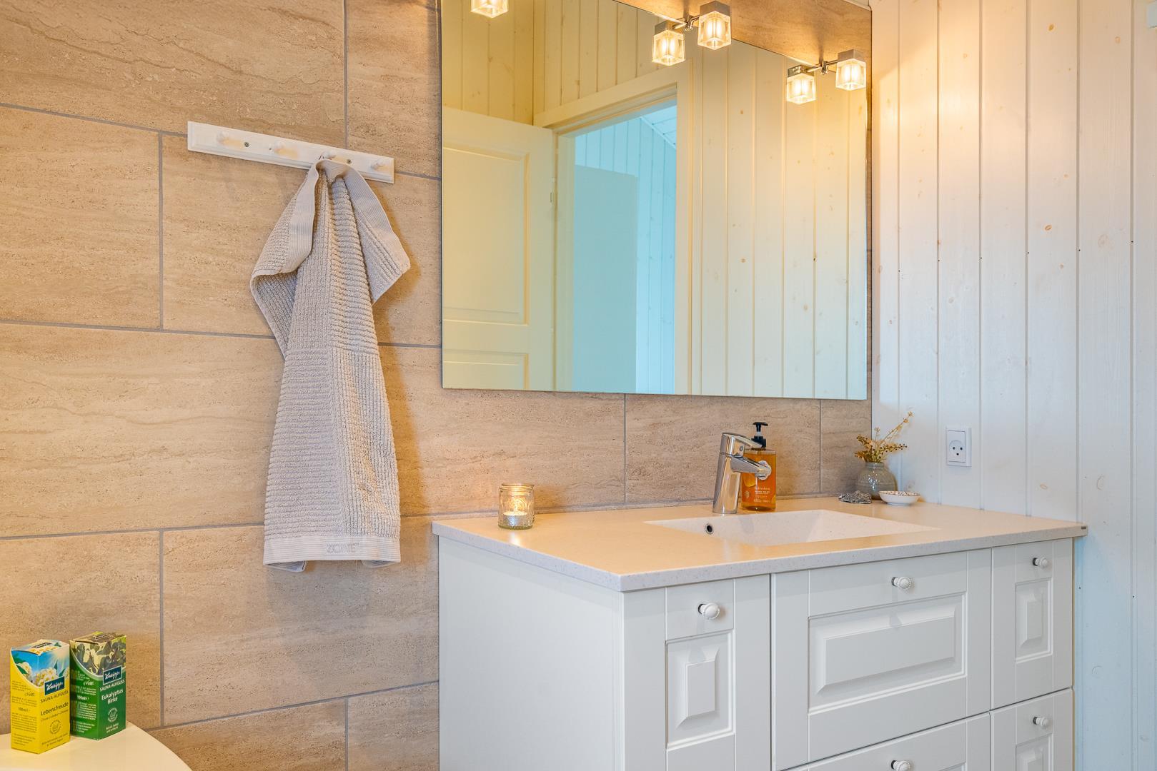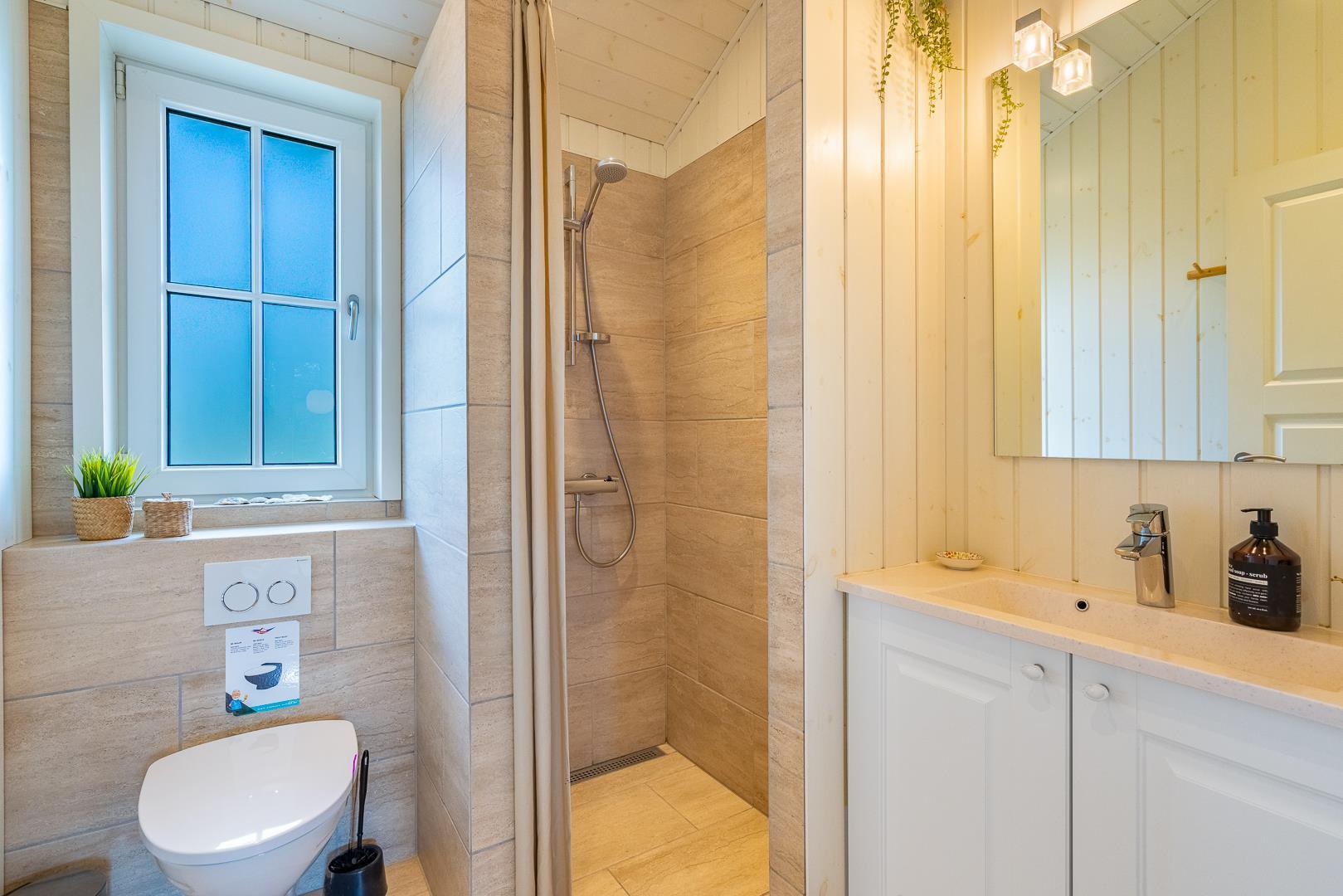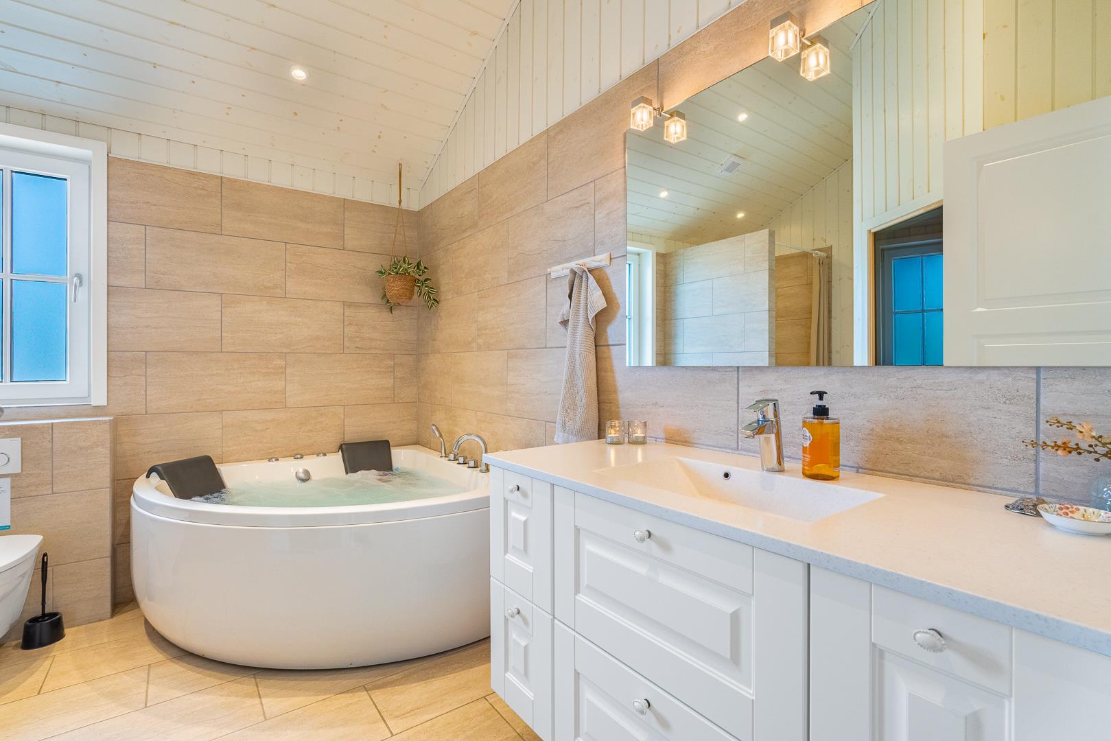 Der er to badeværelser i huset, hvoraf det ene har bruseniche, mens der med sauna og spabad er skruet op for wellnessfølelsen i det andet.