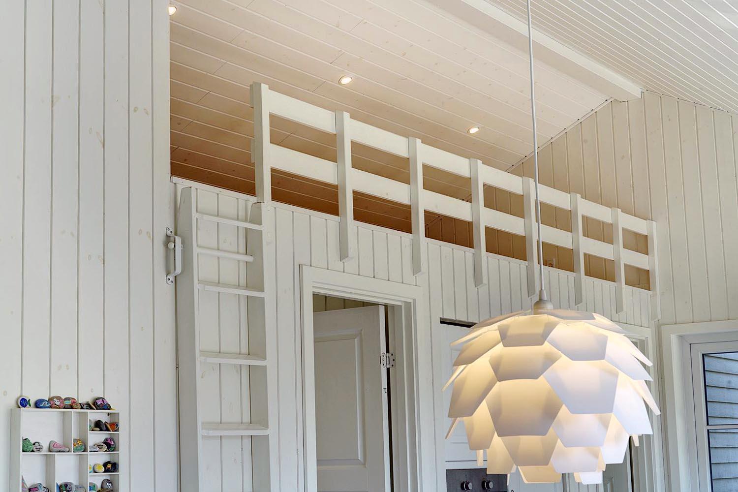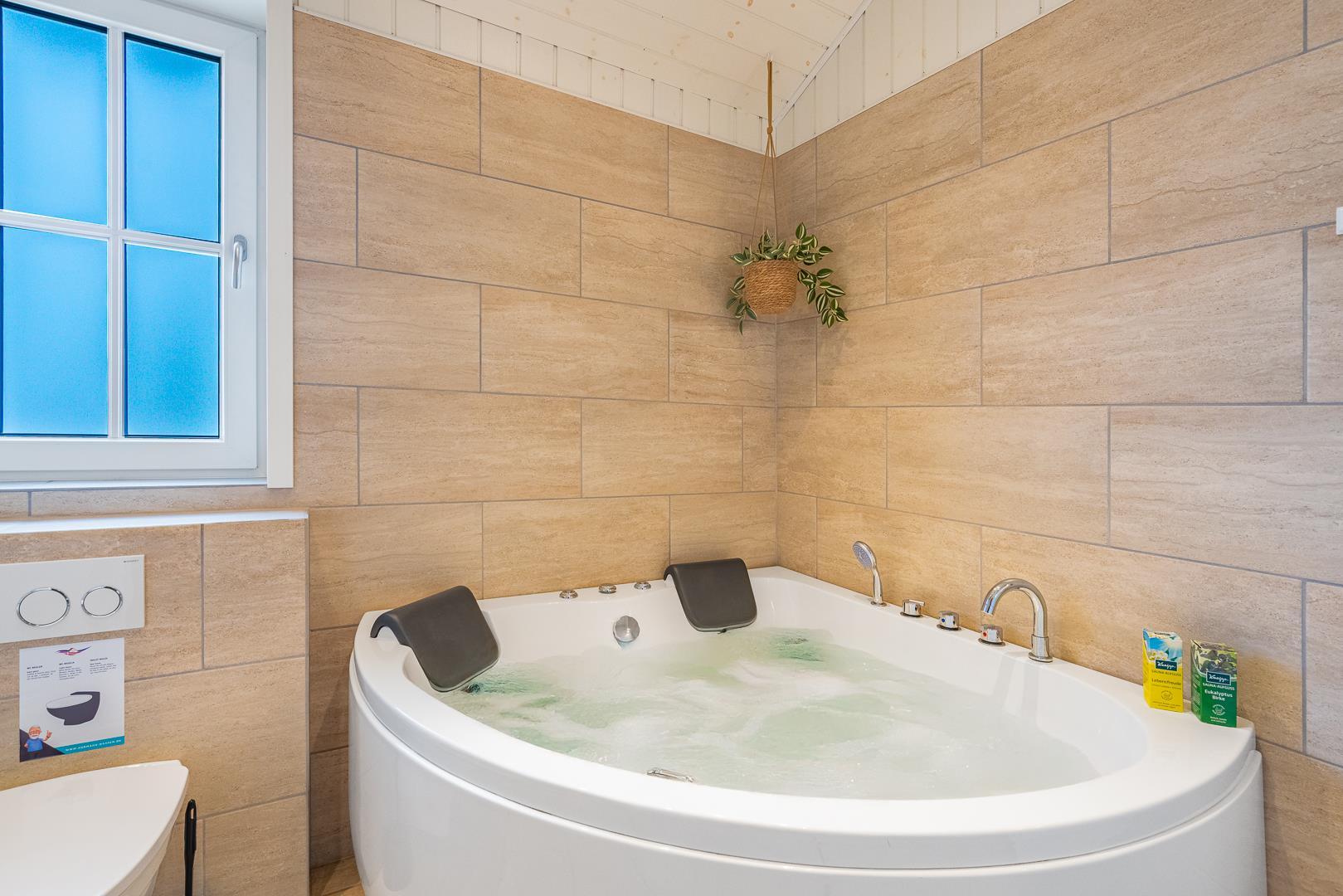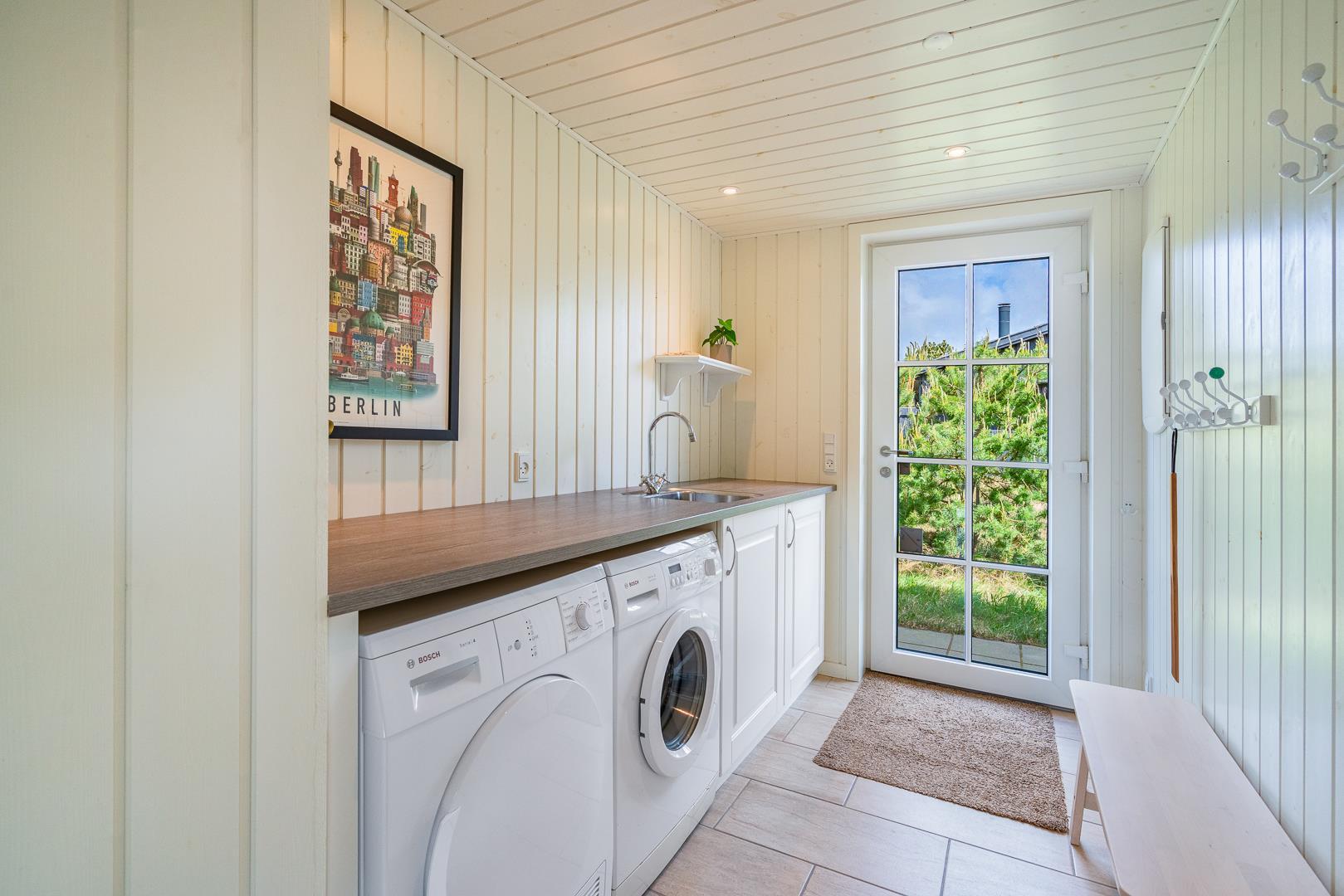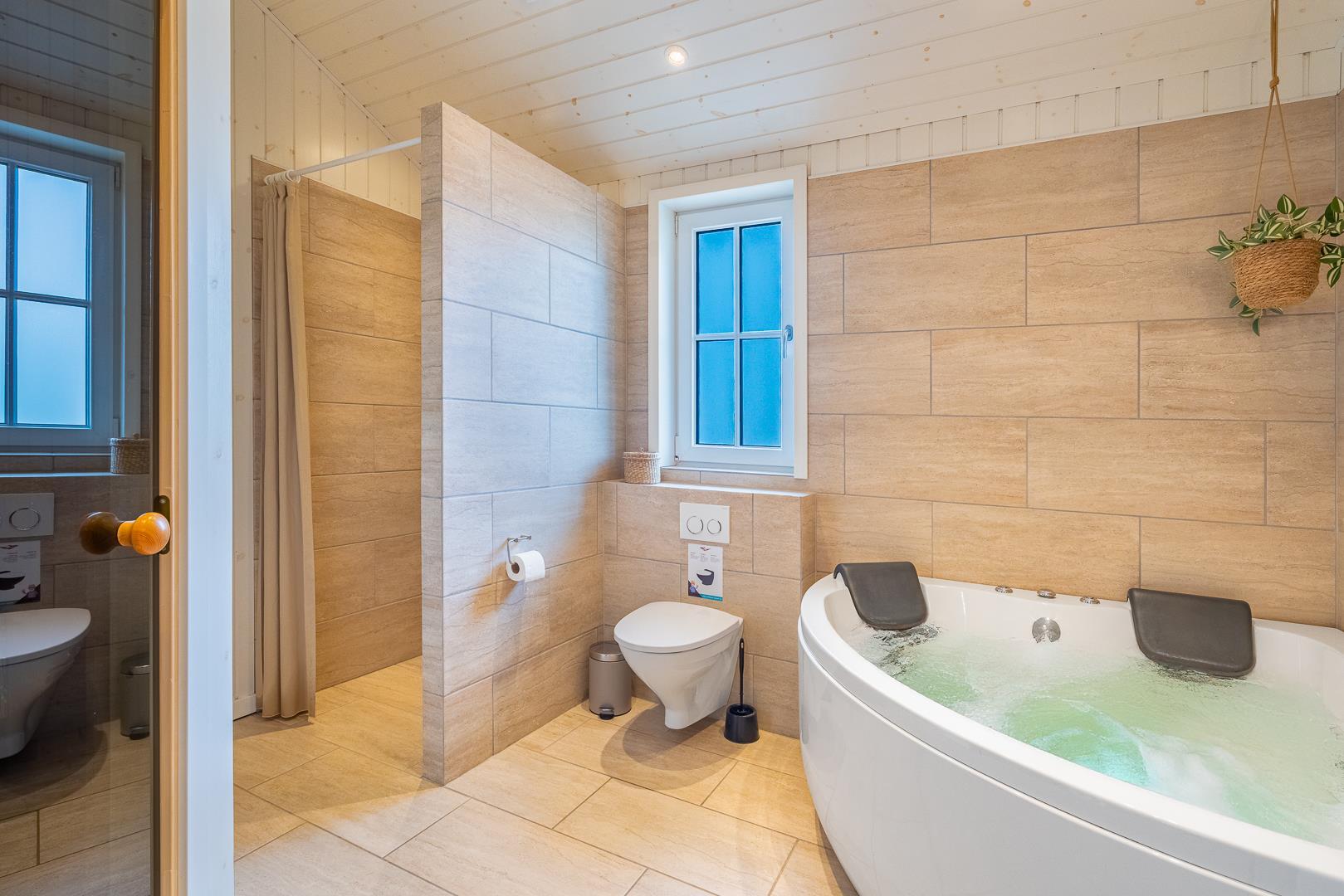 Der er to badeværelser i huset, hvoraf det ene har bruseniche, mens der med sauna og spabad er skruet op for wellnessfølelsen i det andet.