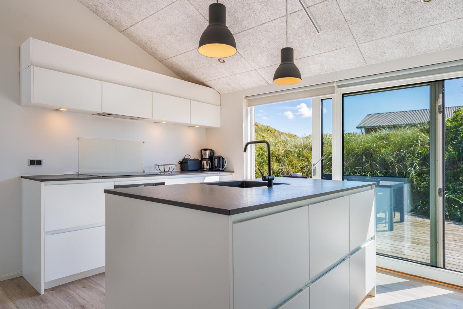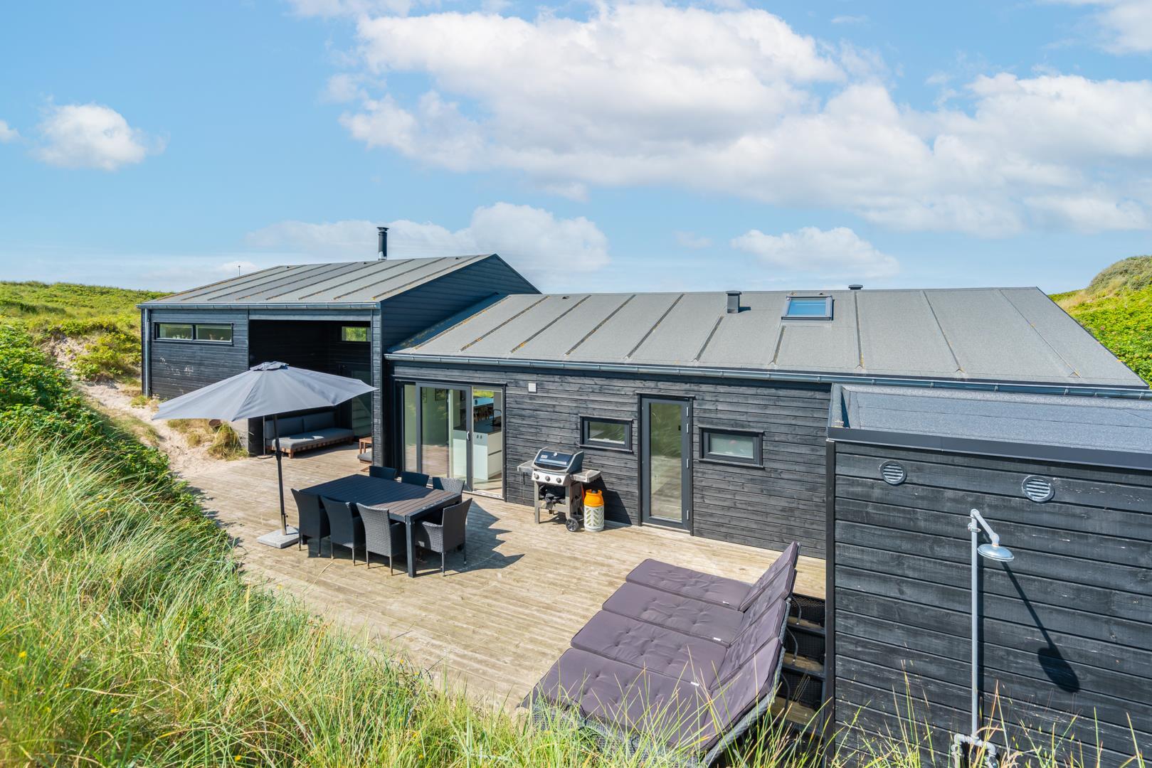 Grunden er en smuk, kuperet klitgrund, og der er gjort meget for, at I kan nyde de naturskønne omgivelser. Således danner et stort terrassedæk om huset masser af hyggekroge, hvor feriedagene kan udspille sig i liggestolene eller ved havebordet under overdækningen.