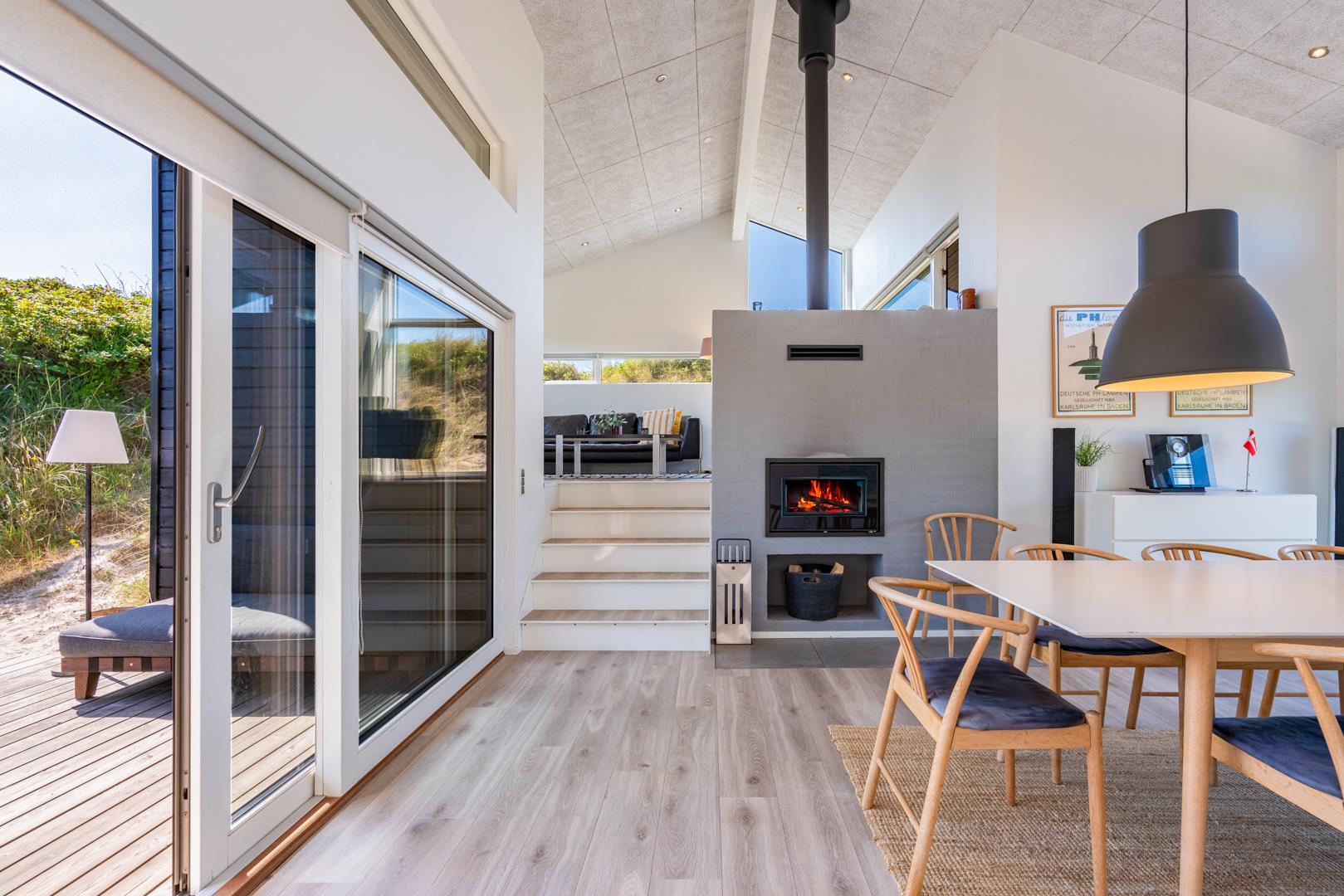 Stuen ligger i det øverste niveau, og herfra er der blot fem trin ned til køkken-alrummet, som har en stor spiseplads med brændeovn og skydedør ud til terrassen. Køkkenet er minimalistisk indrettet, og også herfra er der direkte udgang via en skydedør. Huset byder herudover på fire soverum med dobbeltsenge samt to badeværelser. Begge badeværelser har varme i gulvet, og det ene sætter trumf på med badekar og sauna.