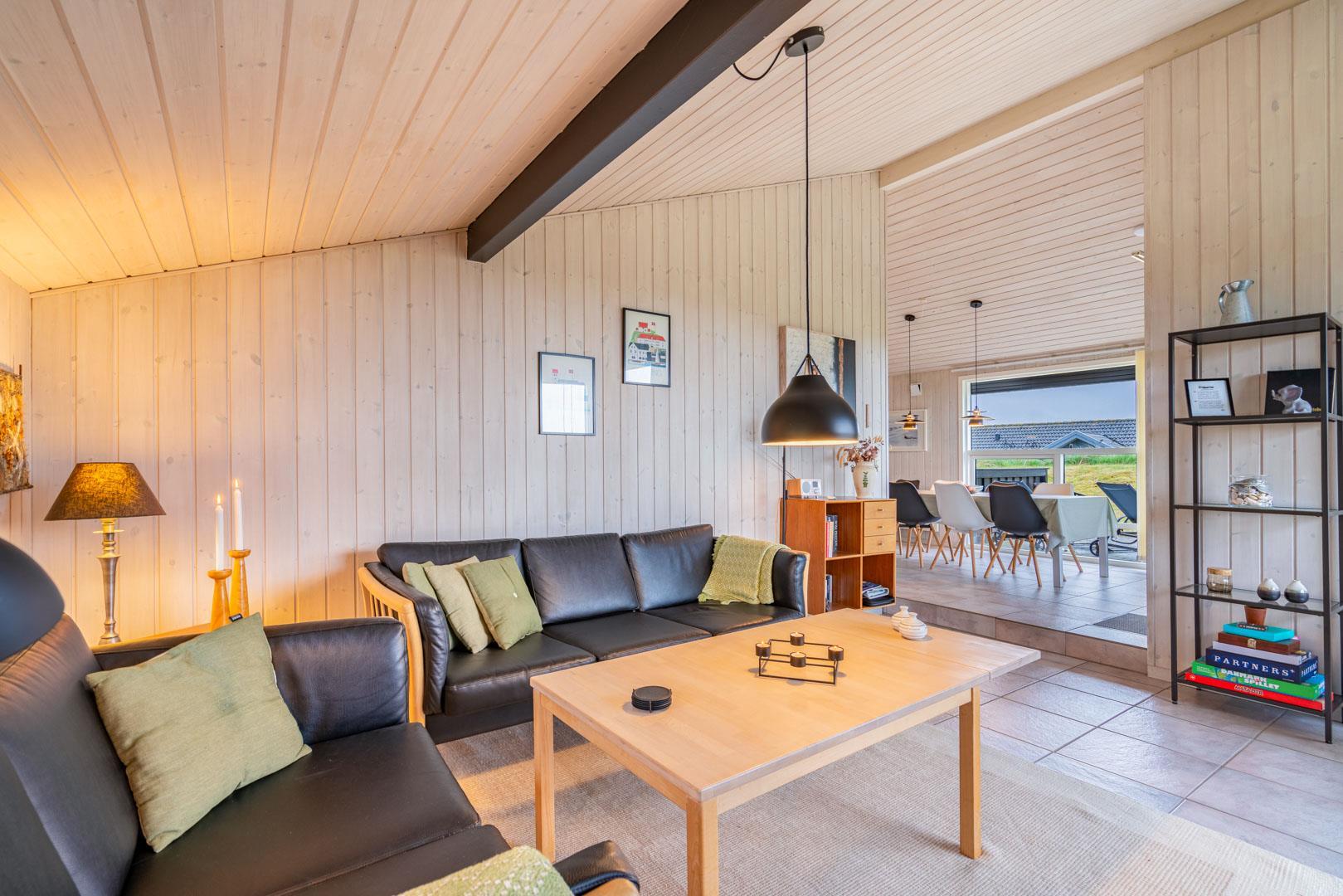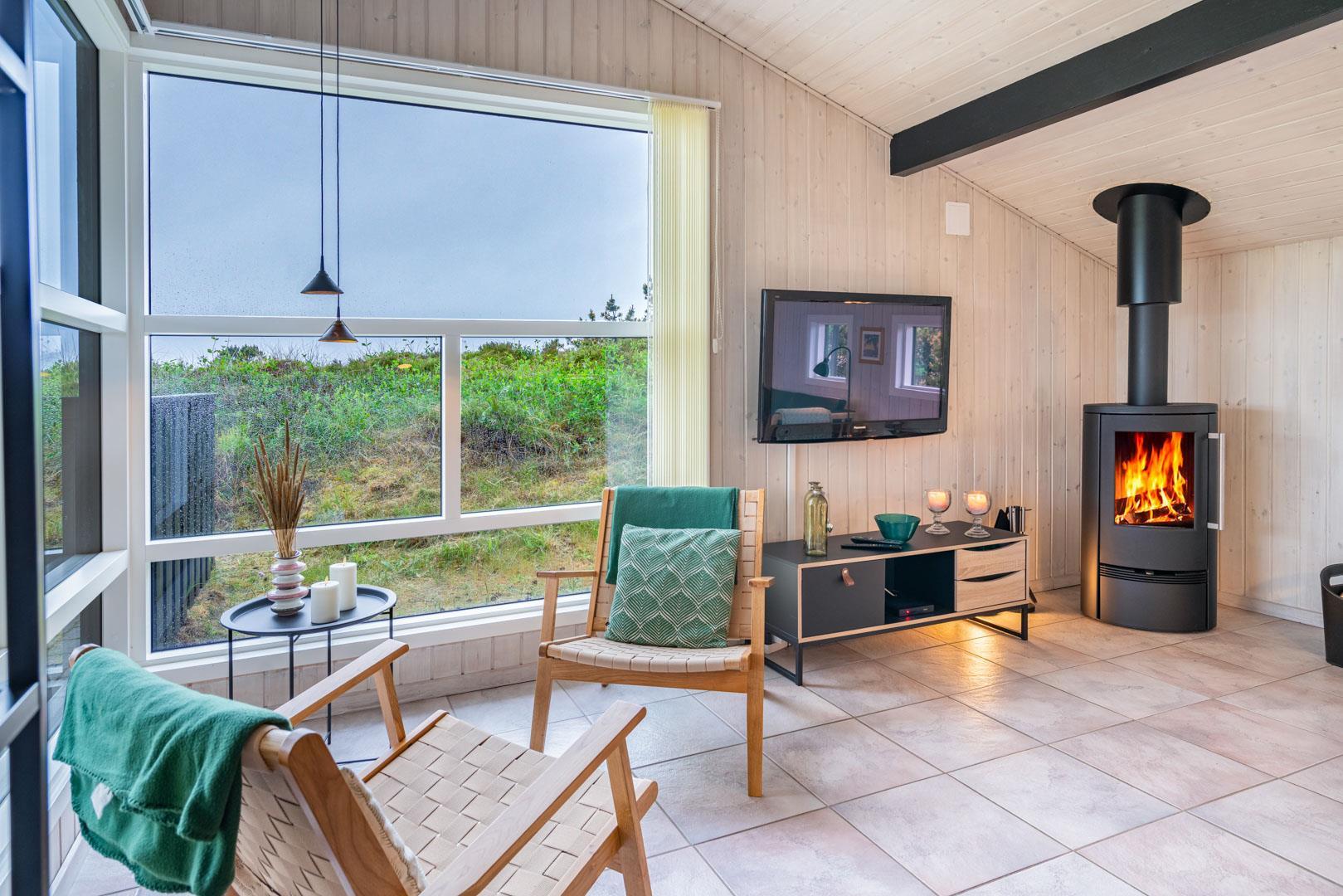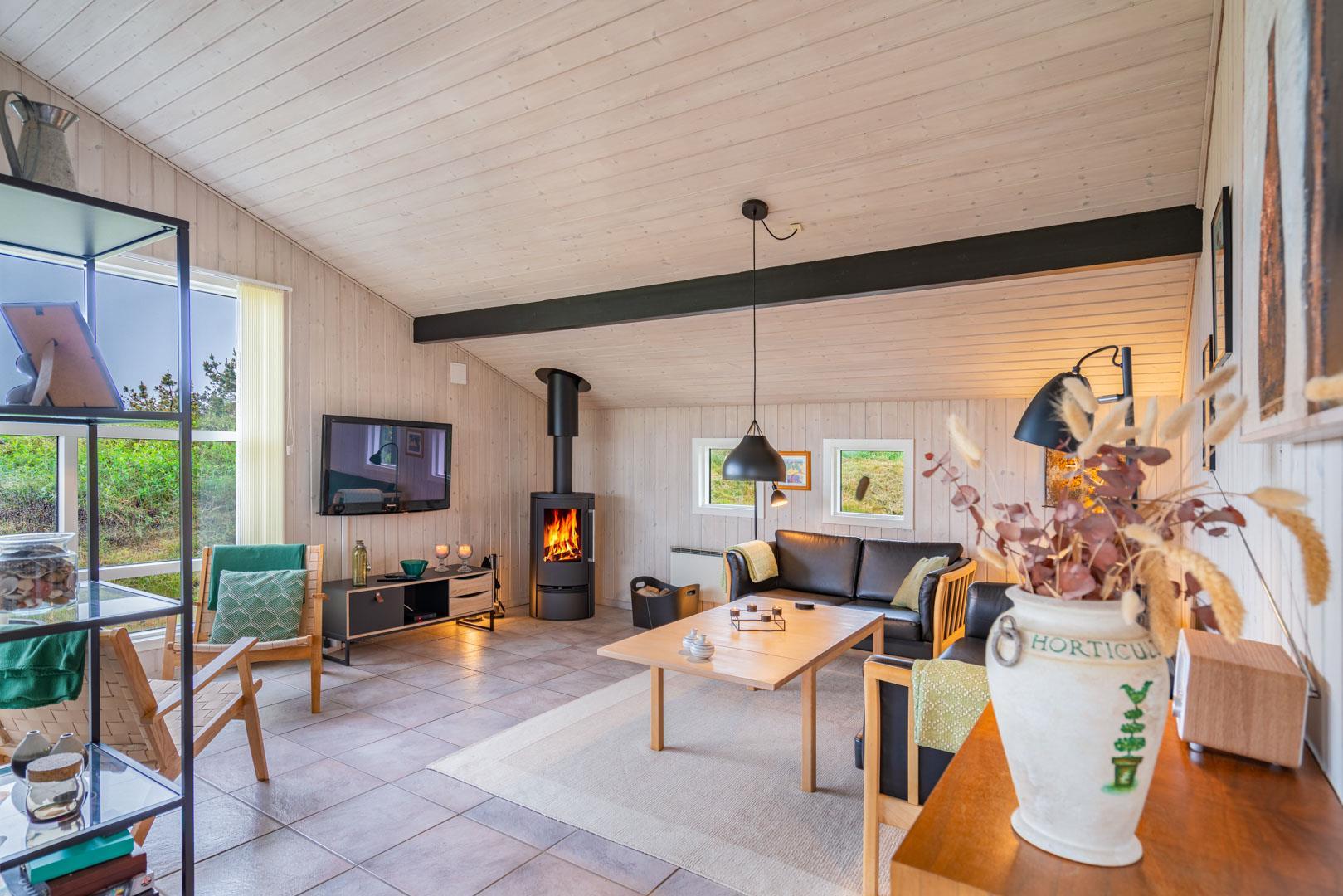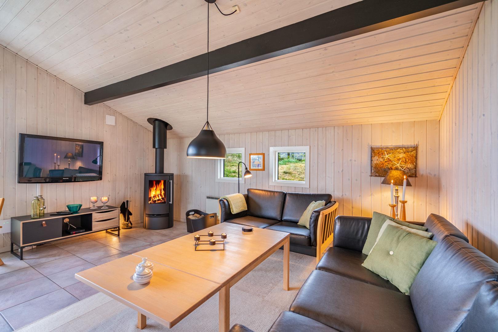 I stuen kan du hygge dig foran brændeovnen, der spreder varme og atmosfære, mens du nyder selskabet af familie og venner. Stuen flyder elegant sammen med køkken/alrummet, hvor du finder alt, hvad du behøver af moderne hårde hvidevarer til at tilberede lækre feriemåltider.