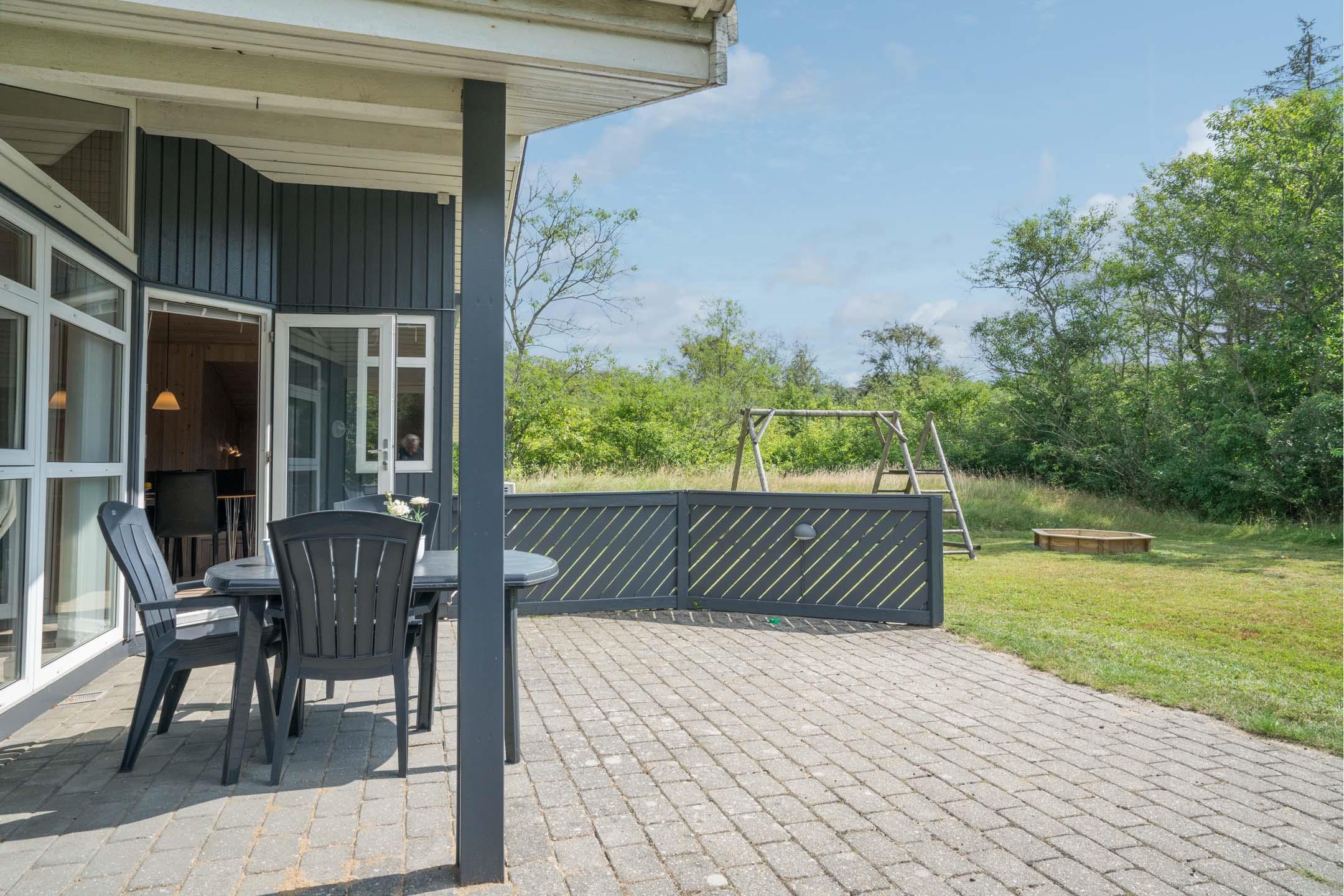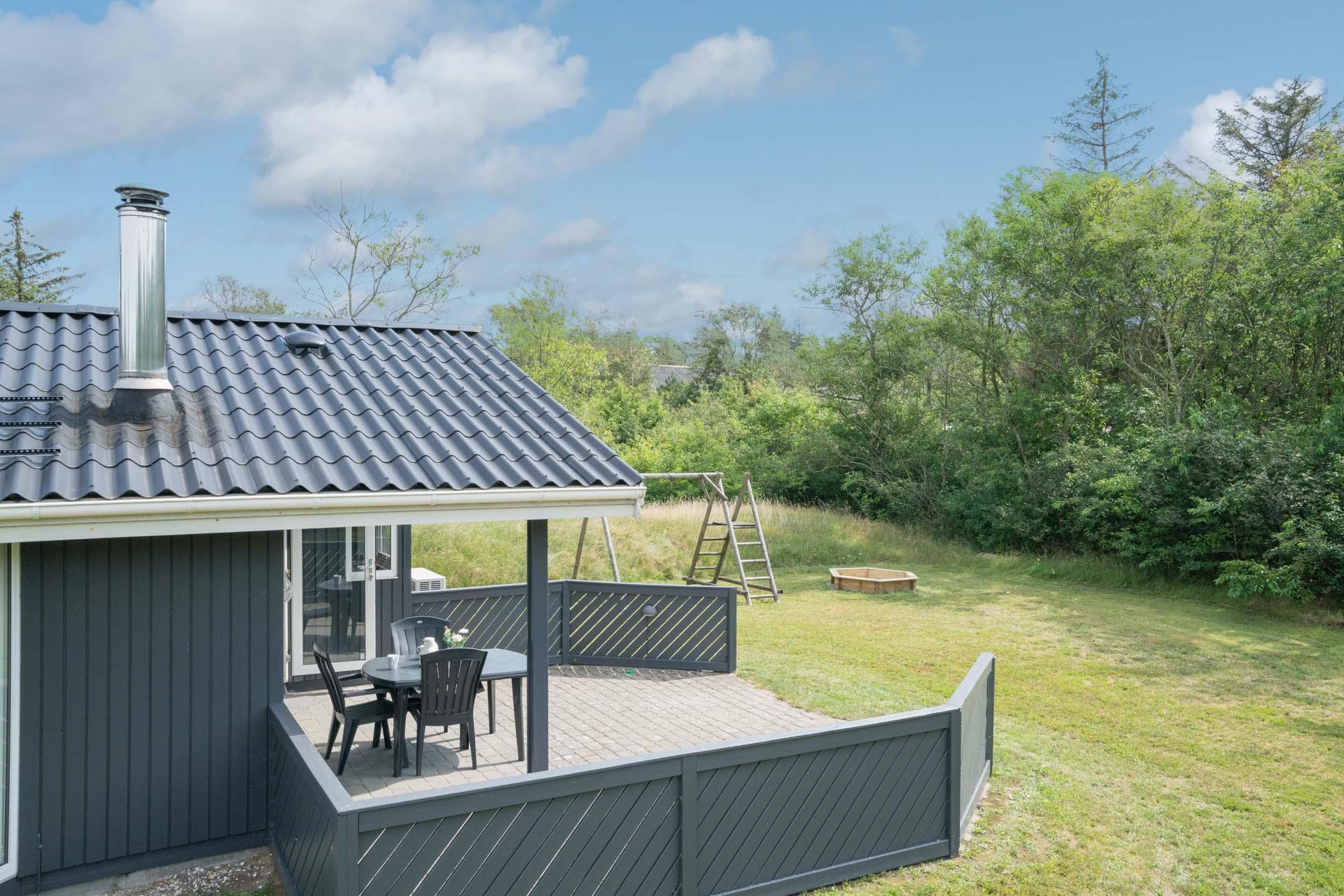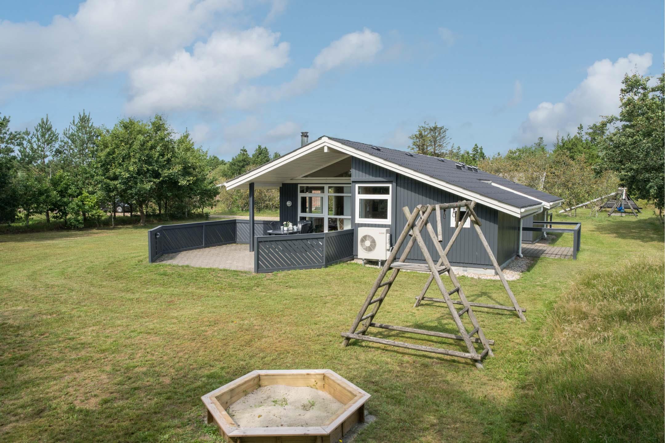 Huset er velegnet til familier med små børn – her findes både babybadekar og puslefaciliteter. Udendørs venter en overdækket terrasse, perfekt til morgenkaffen, grillmiddage og afslapning. Gyngen og sandkassen sikrer timevis af leg for de mindste.