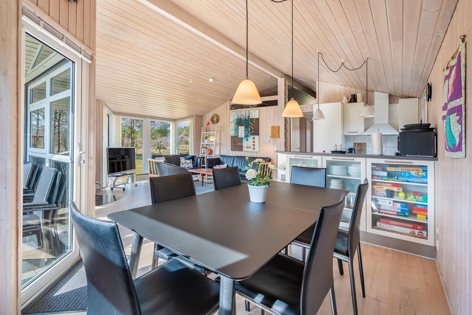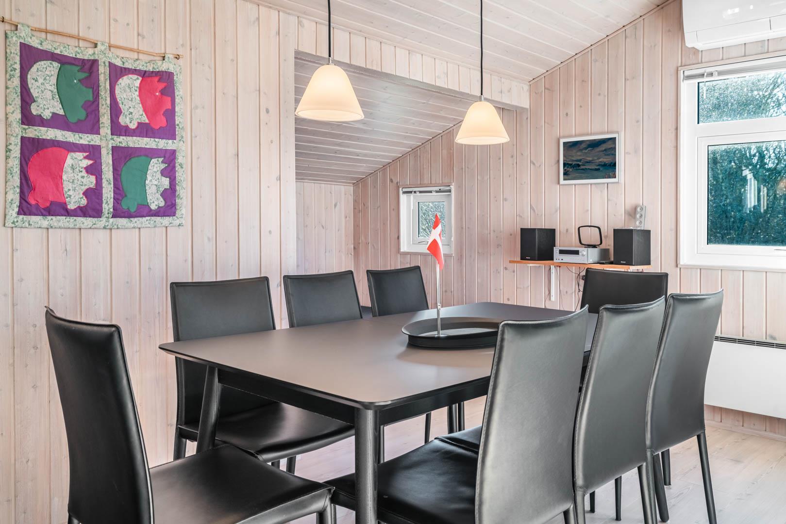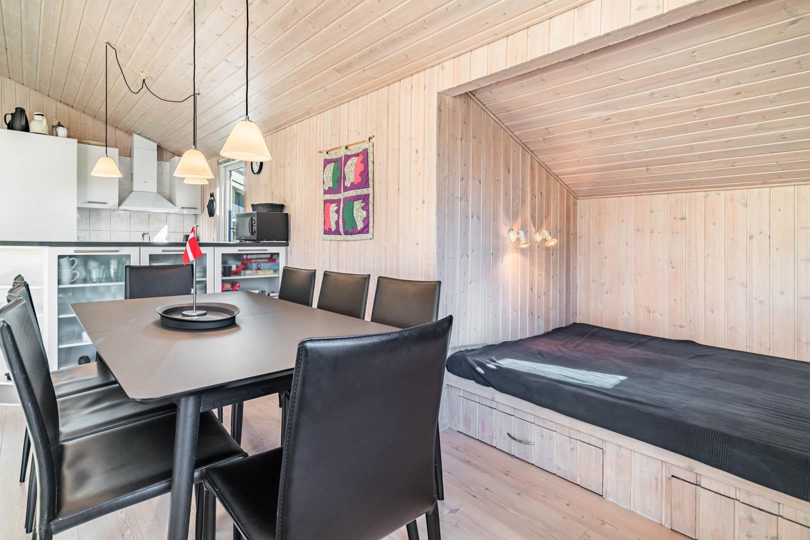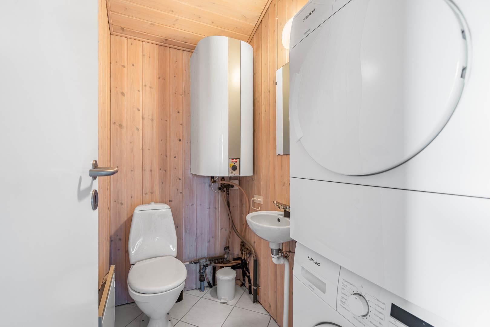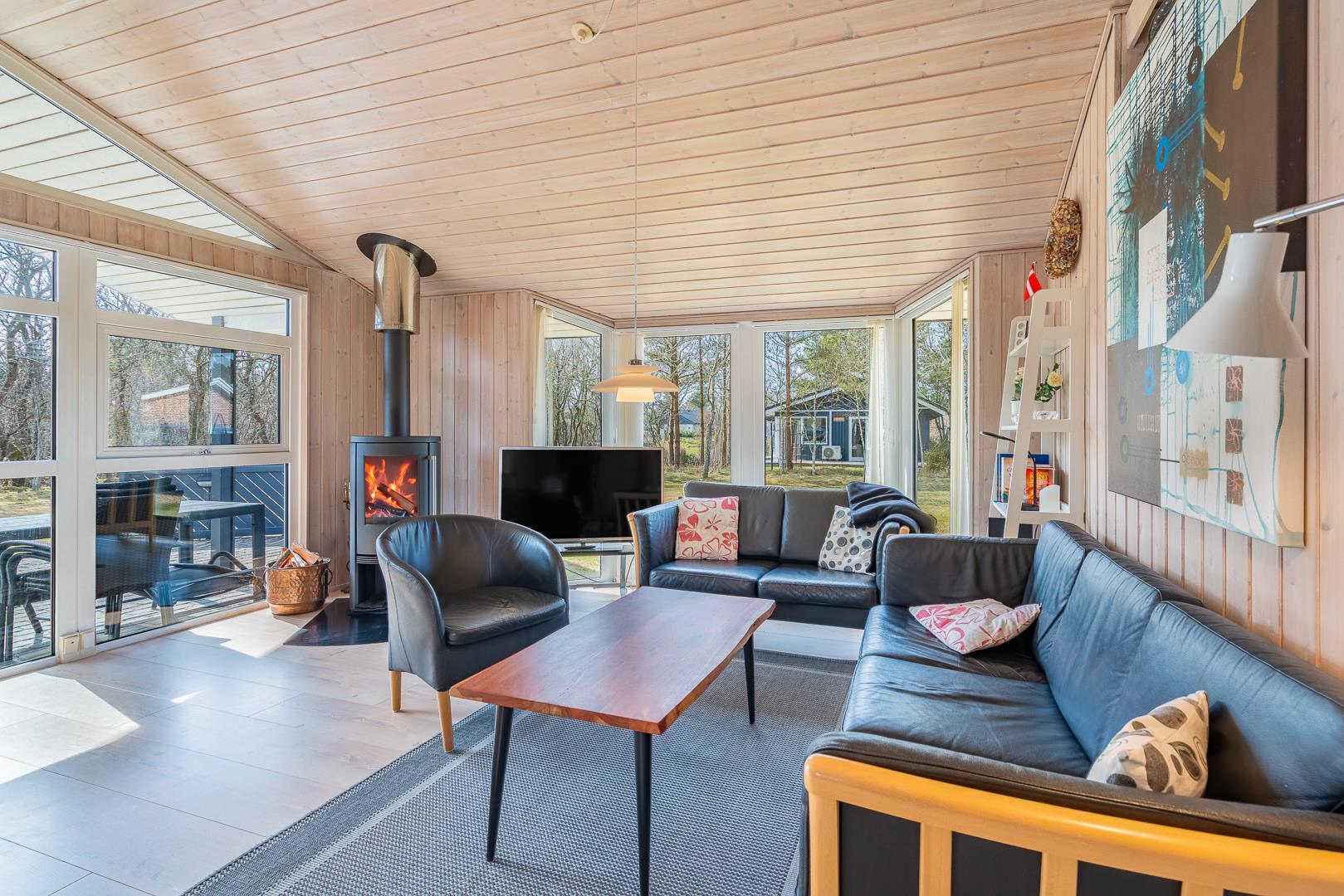 Sommerhusets naturlige samlingspunkt er den lyse opholdsstue med brændeovn, energivenlige varmepumpe og en hyggelig sofaafdeling – ideel til rolige aftener efter en dag ved stranden. Det åbne køkken er veludstyret med opvaskemaskine, god bordplads og alt, hvad I behøver til fælles måltider. Til daglig bekvemmelighed er der både vaskemaskine, tørretumbler og værdiboks.