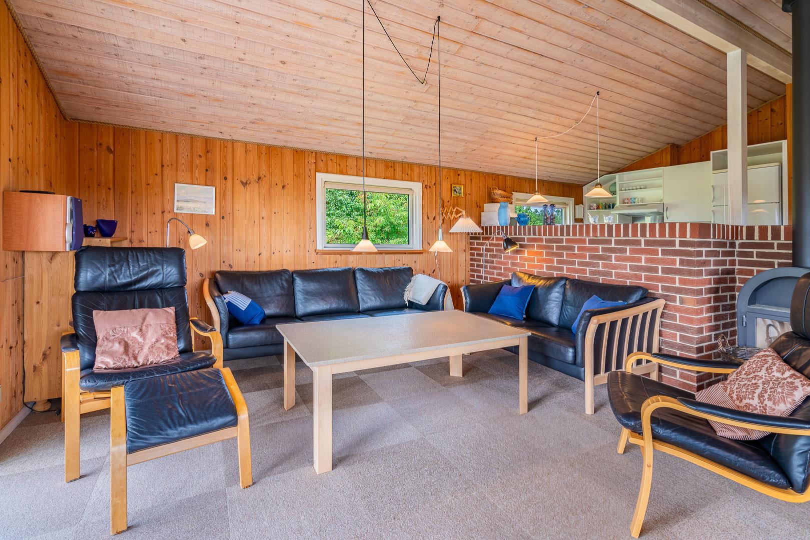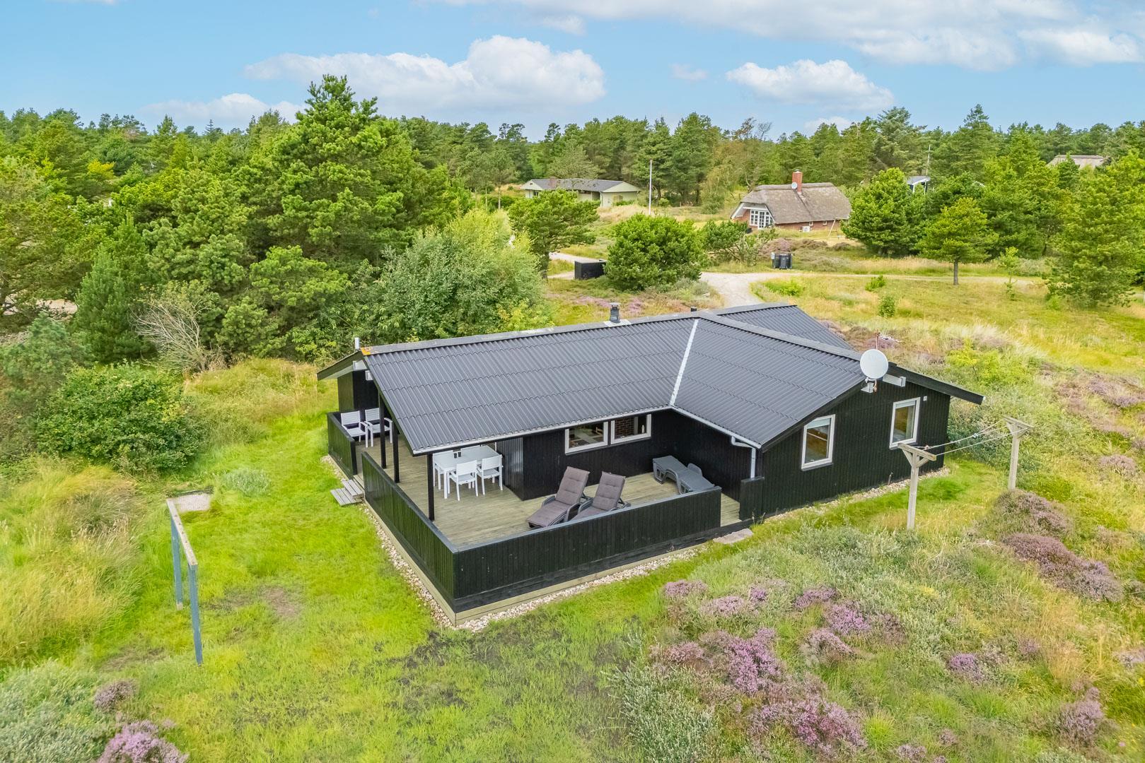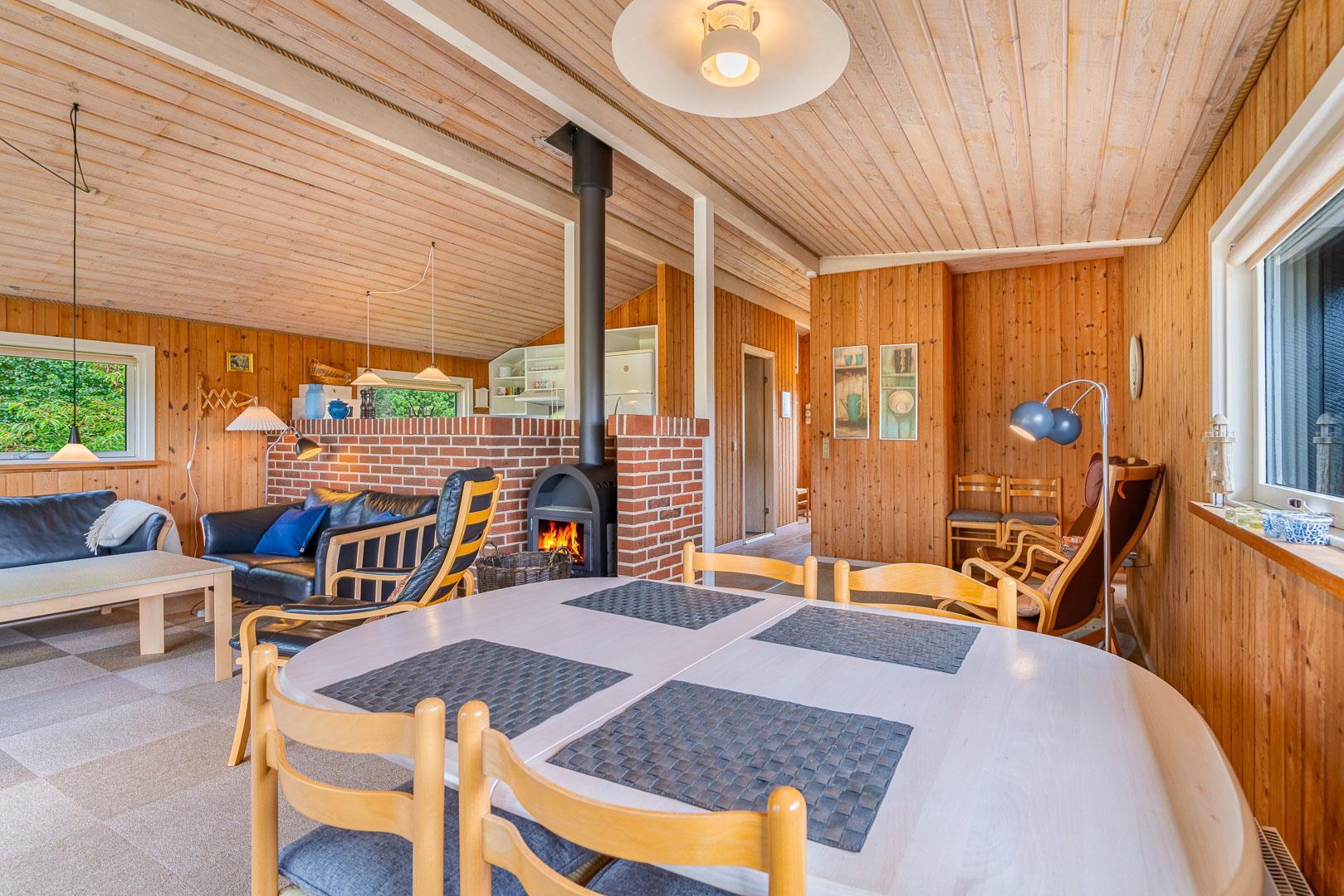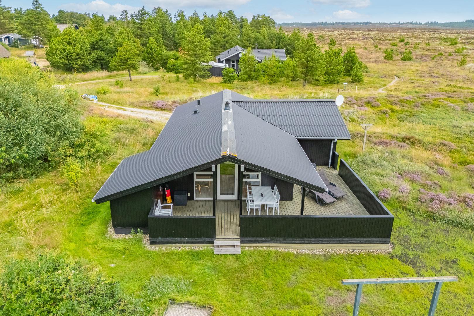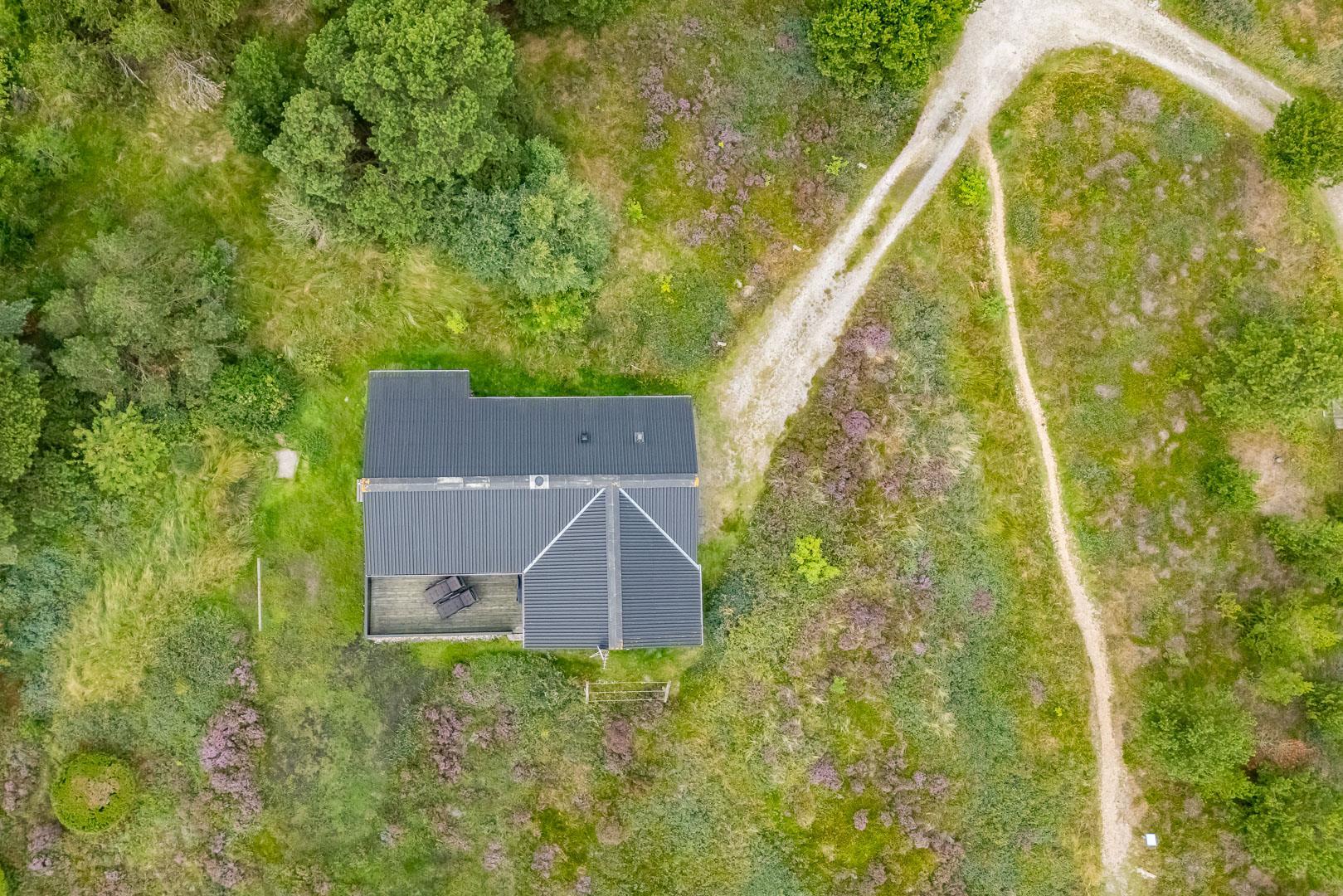 Skønt beliggende feriehus, som ligger helt ugenert ud til større fredet naturområde ud mod Lyngbos Hede areal. Feriehuset fremstår meget privat og hyggeligt og der er både en delvis overdækket og åben terrasse. Huset er indrettet med et personligt præg og med flotte, komfortable møbler. Køkkenet, som ligger i åbent område forbindelse til stuen med brændeovn, har direkte udgang til feriehusets terrasser. Sengestørrelser: dobbeltseng 180x200 cm. (2 madrasser), dobbeltseng 180x200 cm. (2 madrasser), køjesenge 70x200 cm.