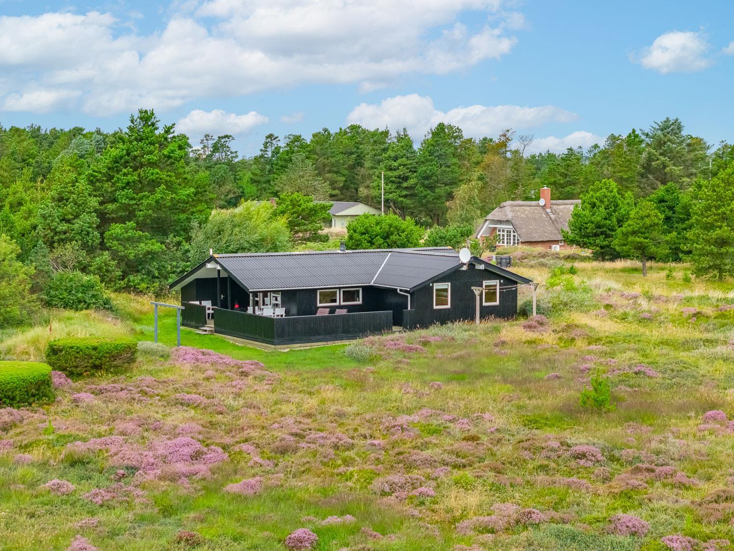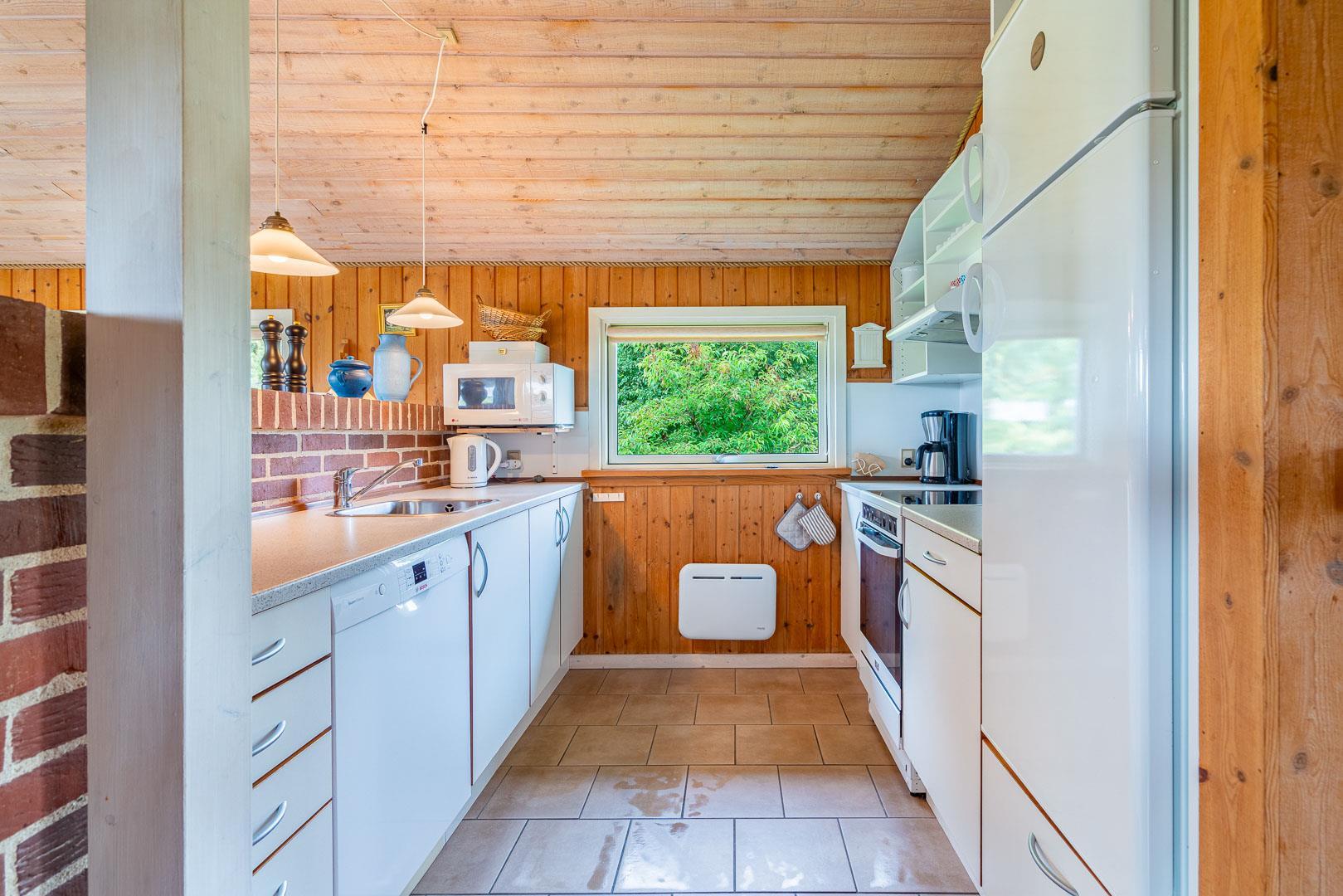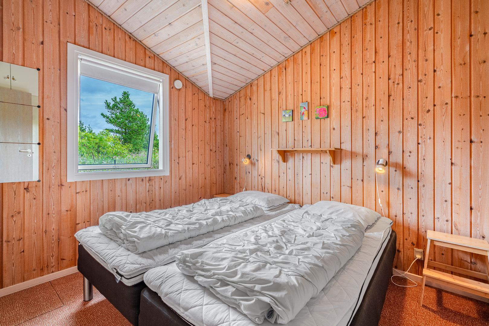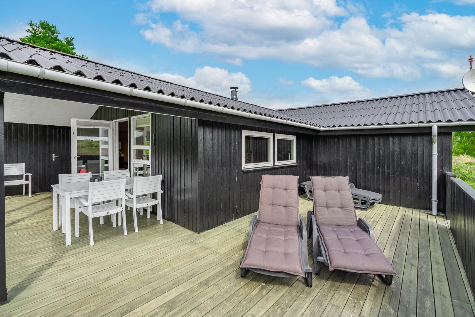Skønt beliggende feriehus, som ligger helt ugenert ud til større fredet naturområde ud mod Lyngbos Hede areal. Feriehuset fremstår meget privat og hyggeligt og der er både en delvis overdækket og åben terrasse. Huset er indrettet med et personligt præg og med flotte, komfortable møbler. Køkkenet, som ligger i åbent område forbindelse til stuen med brændeovn, har direkte udgang til feriehusets terrasser. Sengestørrelser: dobbeltseng 180x200 cm. (2 madrasser), dobbeltseng 180x200 cm. (2 madrasser), køjesenge 70x200 cm.