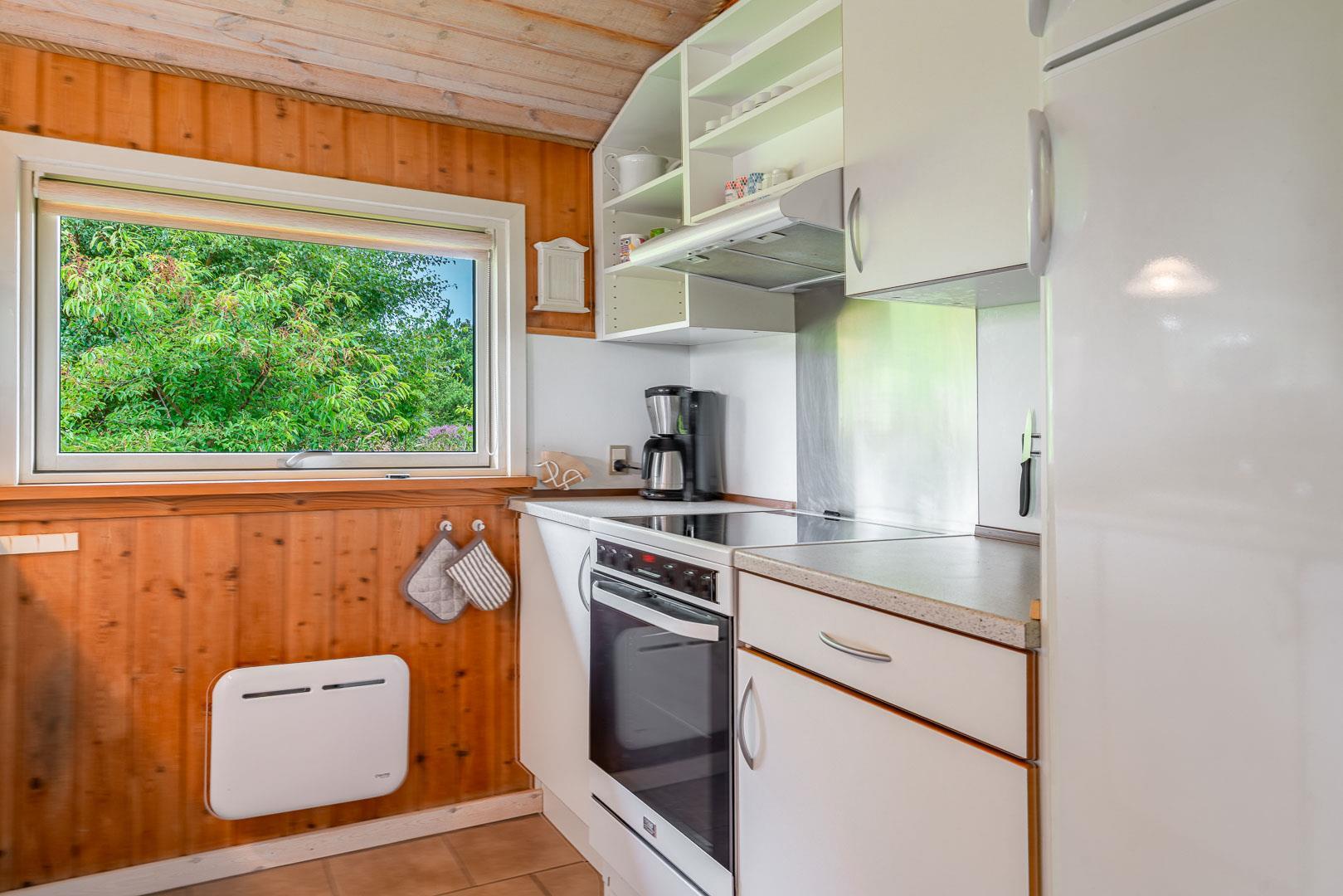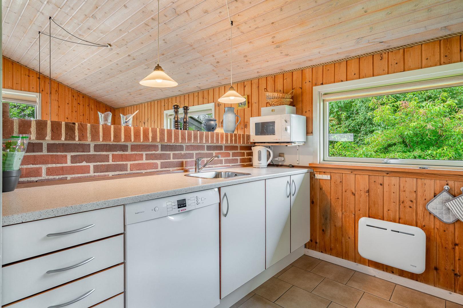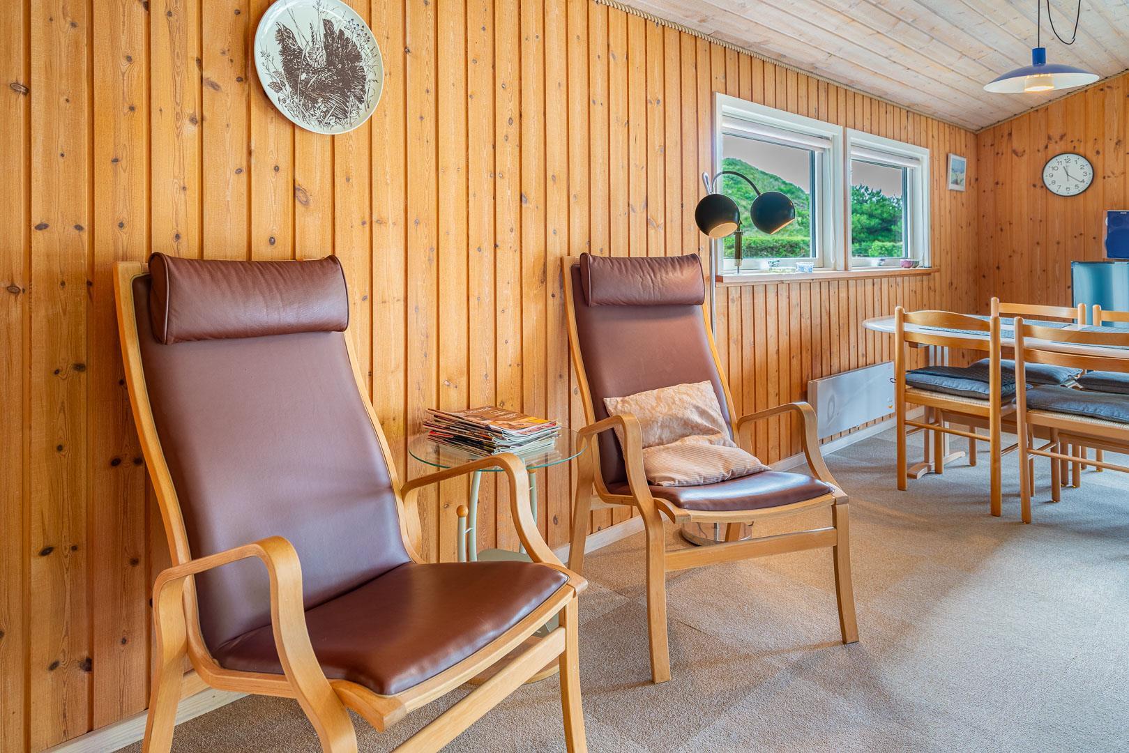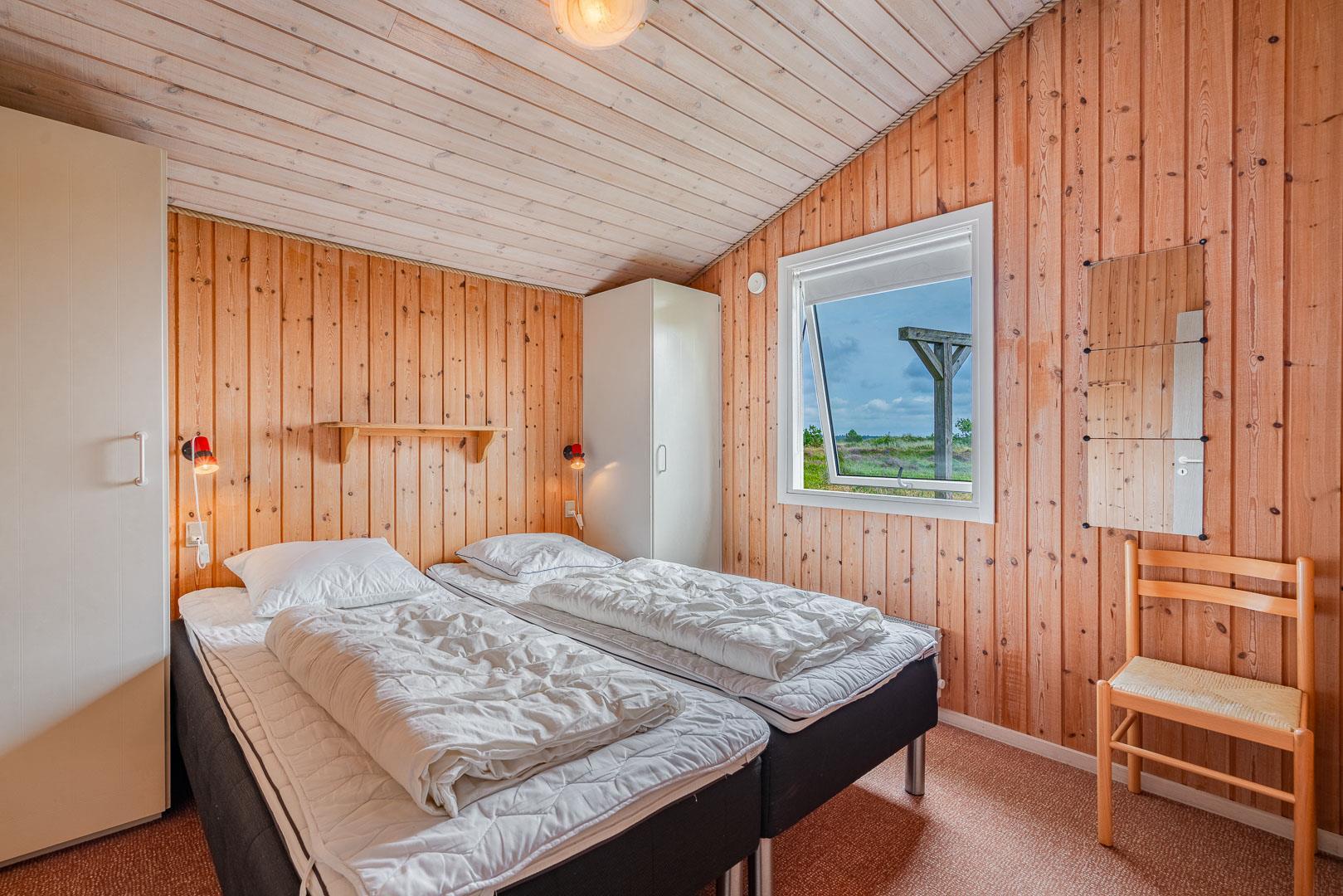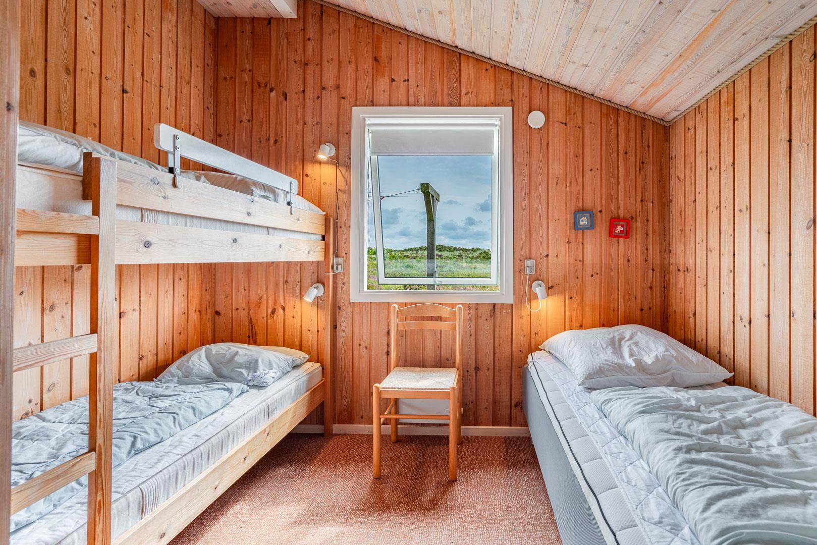 Skønt beliggende feriehus, som ligger helt ugenert ud til større fredet naturområde ud mod Lyngbos Hede areal. Feriehuset fremstår meget privat og hyggeligt og der er både en delvis overdækket og åben terrasse. Huset er indrettet med et personligt præg og med flotte, komfortable møbler. Køkkenet, som ligger i åbent område forbindelse til stuen med brændeovn, har direkte udgang til feriehusets terrasser. Sengestørrelser: dobbeltseng 180x200 cm. (2 madrasser), dobbeltseng 180x200 cm. (2 madrasser), køjesenge 70x200 cm.