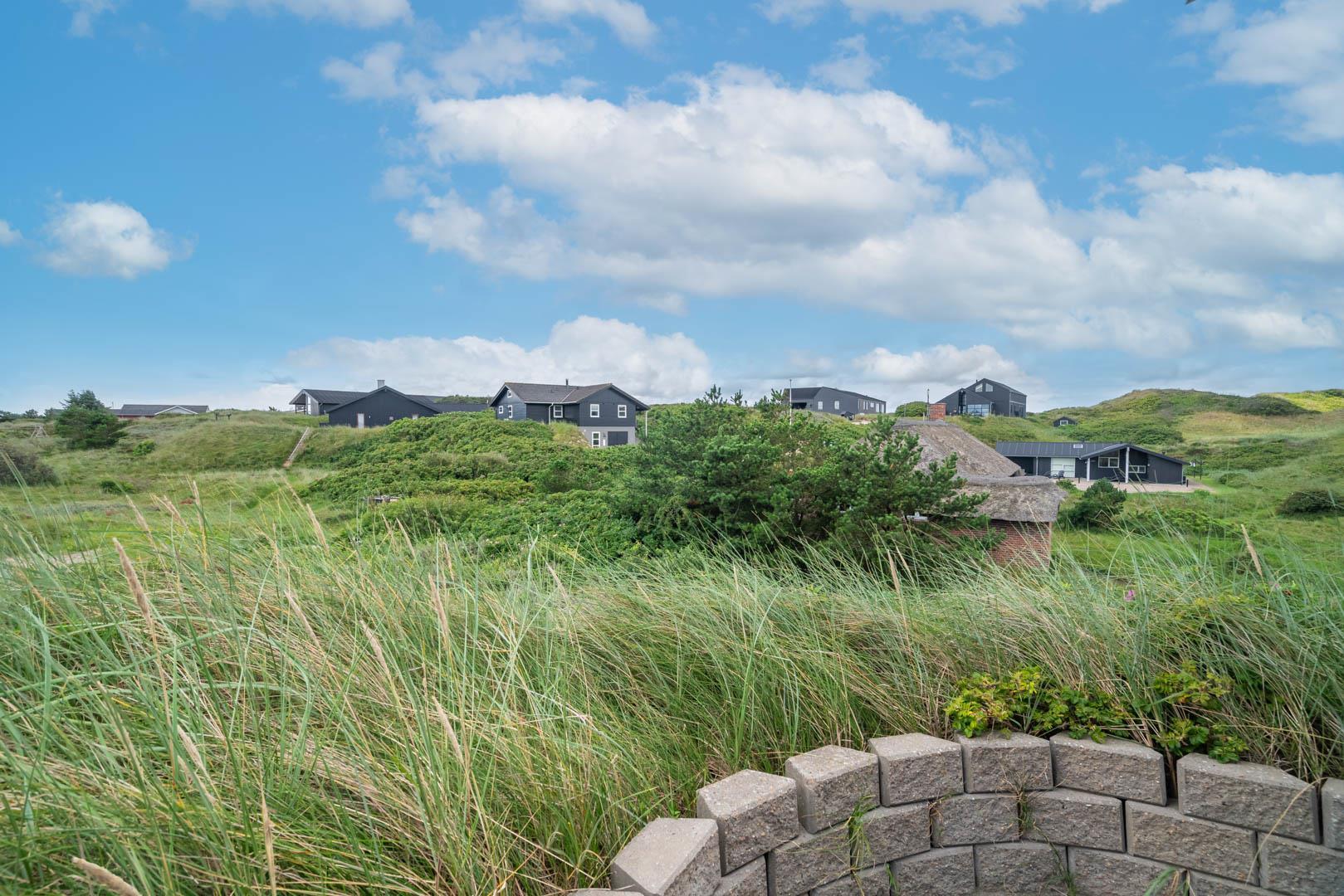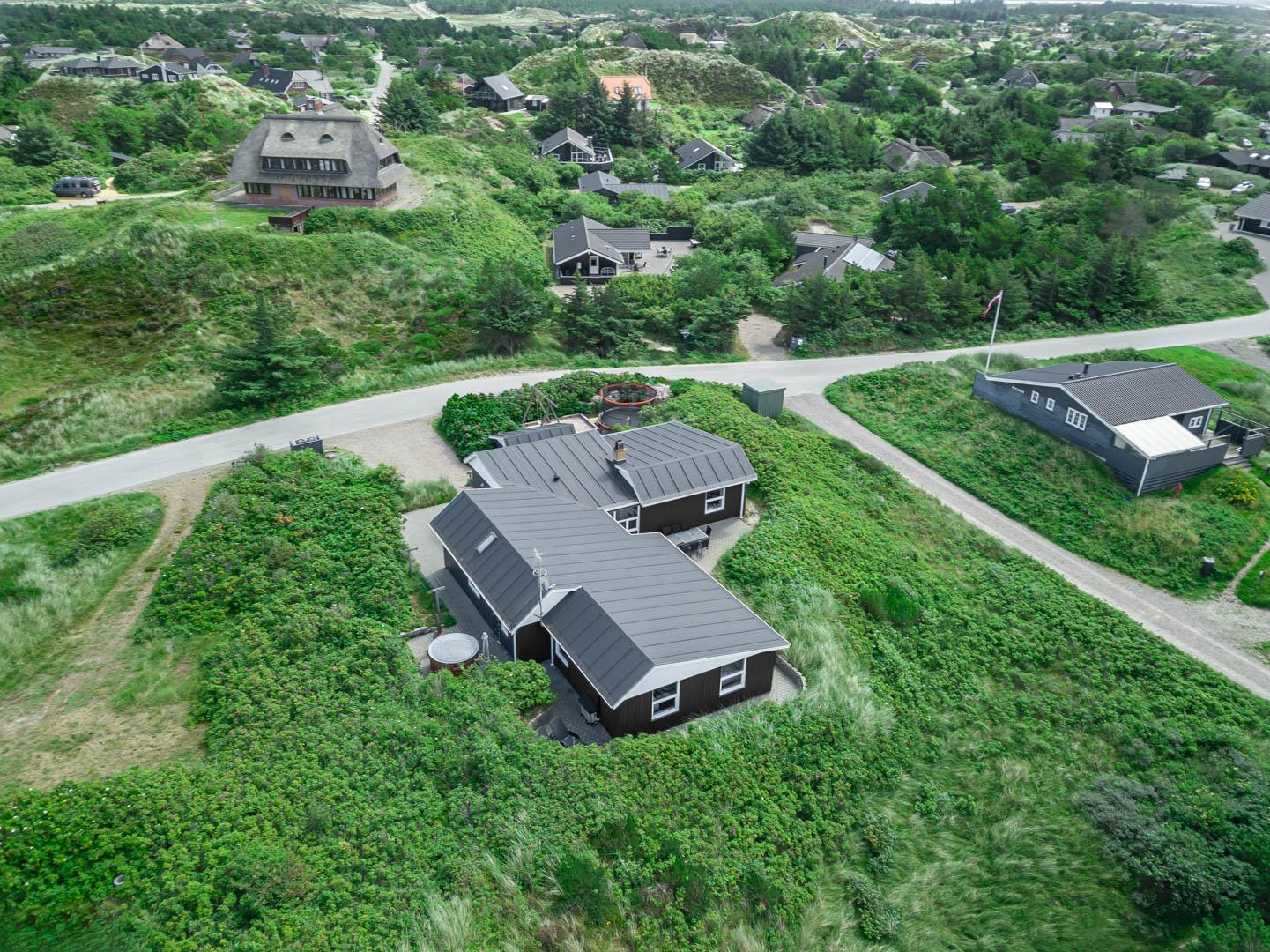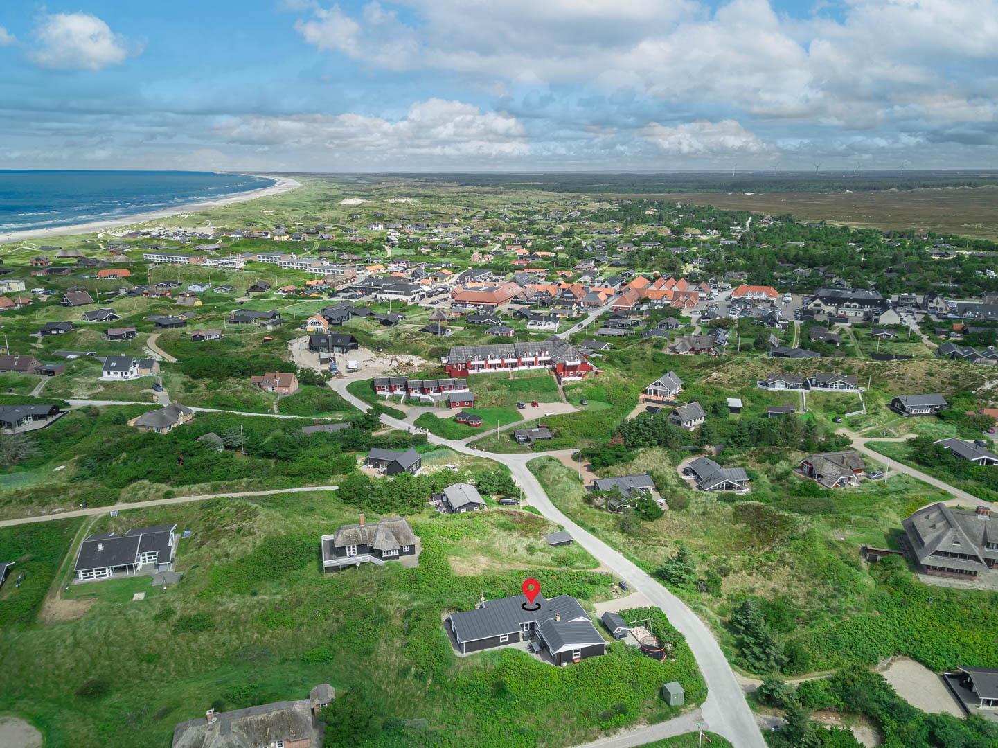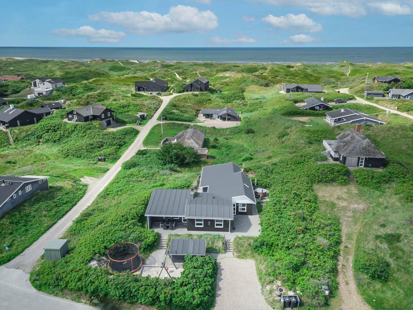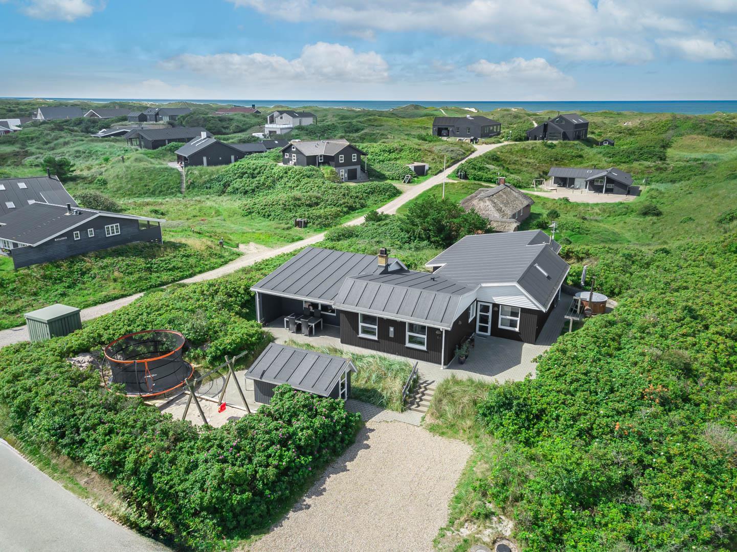 På en stor kuperet klitgrund med panoramaudsigt over områdets klitter samt sommerhusområde, ligger dette meget velholdte og yderst praktisk indrettede sommerhus med større aktivitetsrum samt vildmarksbad. Huset har i alt to komplette badeværelser - det ene med spabad samt adgang til sauna. Rummeligt køkken/alrum, stor stue med brændeovn samt varmepumpe. 5 gode soverum alle med dobbeltsenge. Fra aktivitetsrummet er der adgang til sommerhusets 1 hems, hvor børnene har alle muligheder for at hygge sig. Fra stue samt køkken er der direkte udgang til flere af sommerhusets mange terrasser. Der er opsat trampolin på grunden. Gåafstand til den dejlige, hvide badestrand ved Vesterhavet samt til den hyggelige badeby Henne Strand by med bl.a. flere gode indkøbsmuligheder samt restauranter.