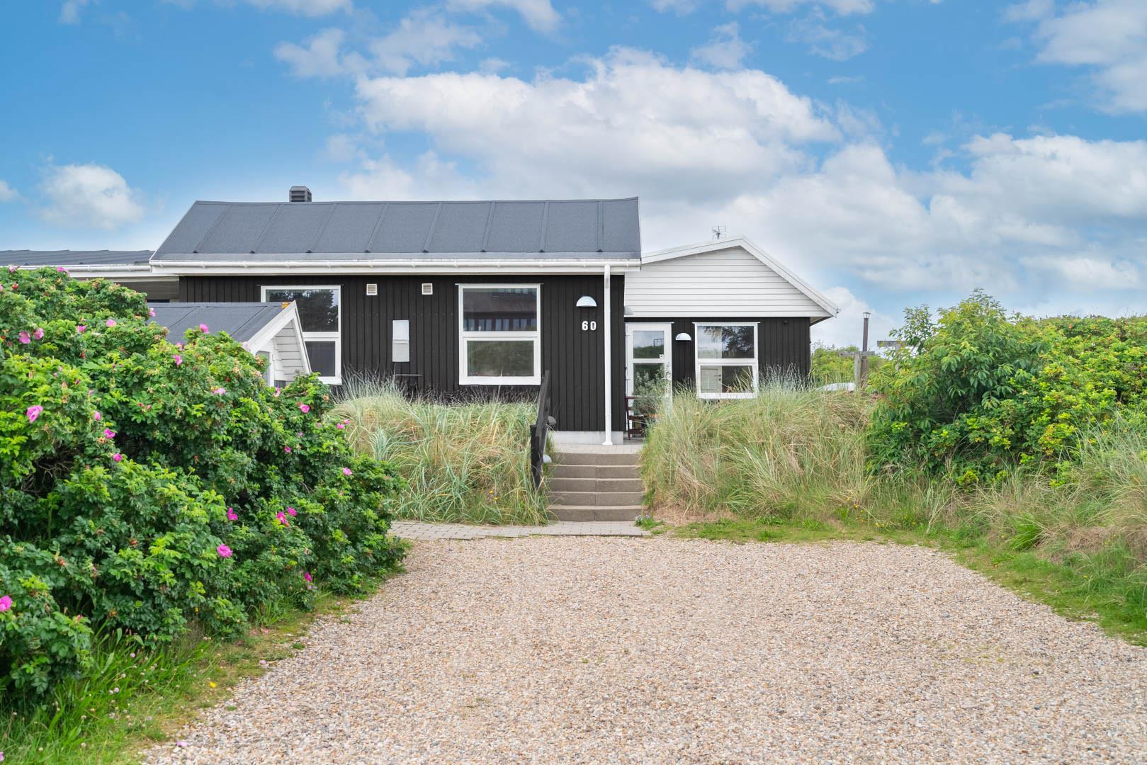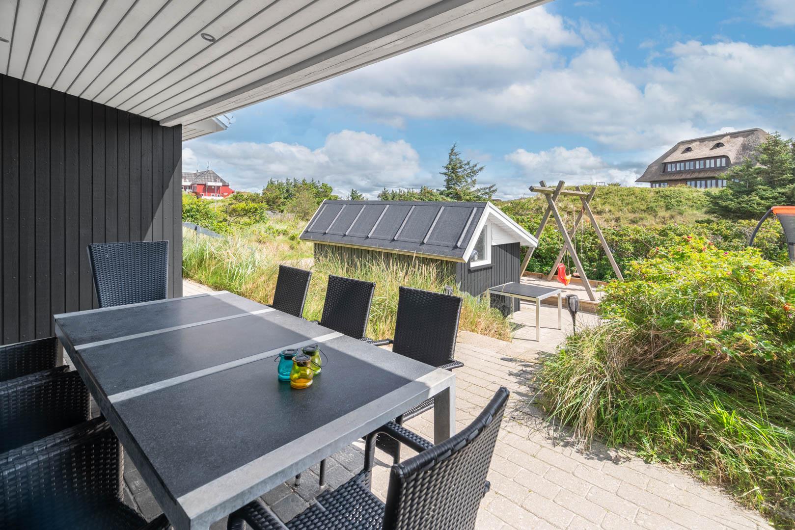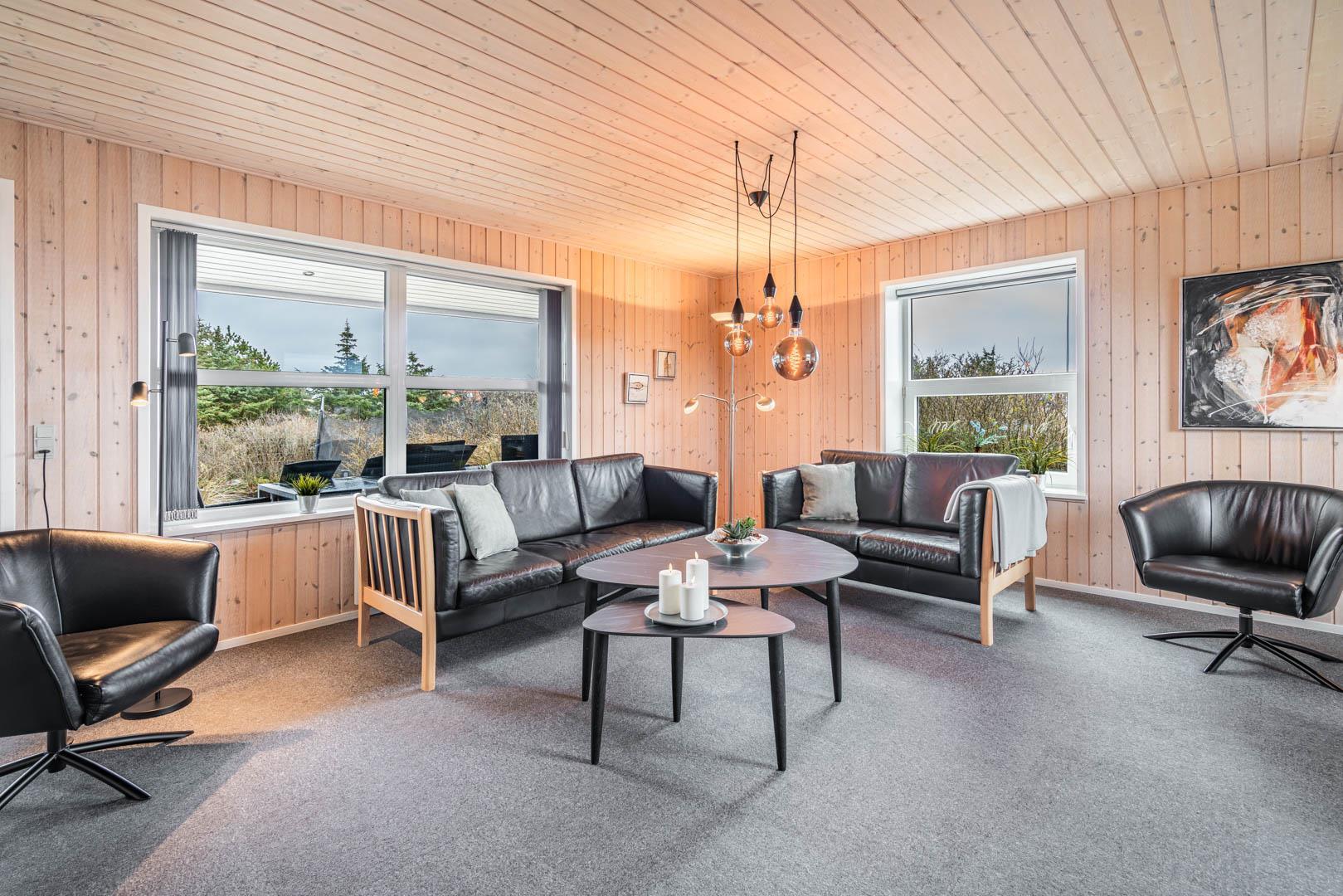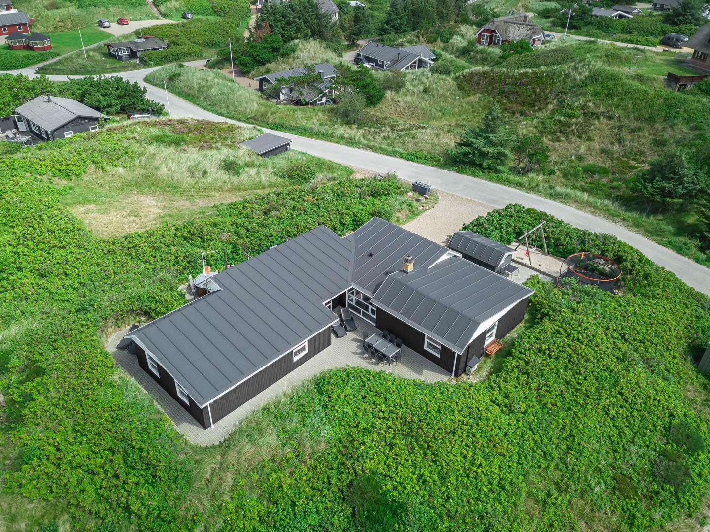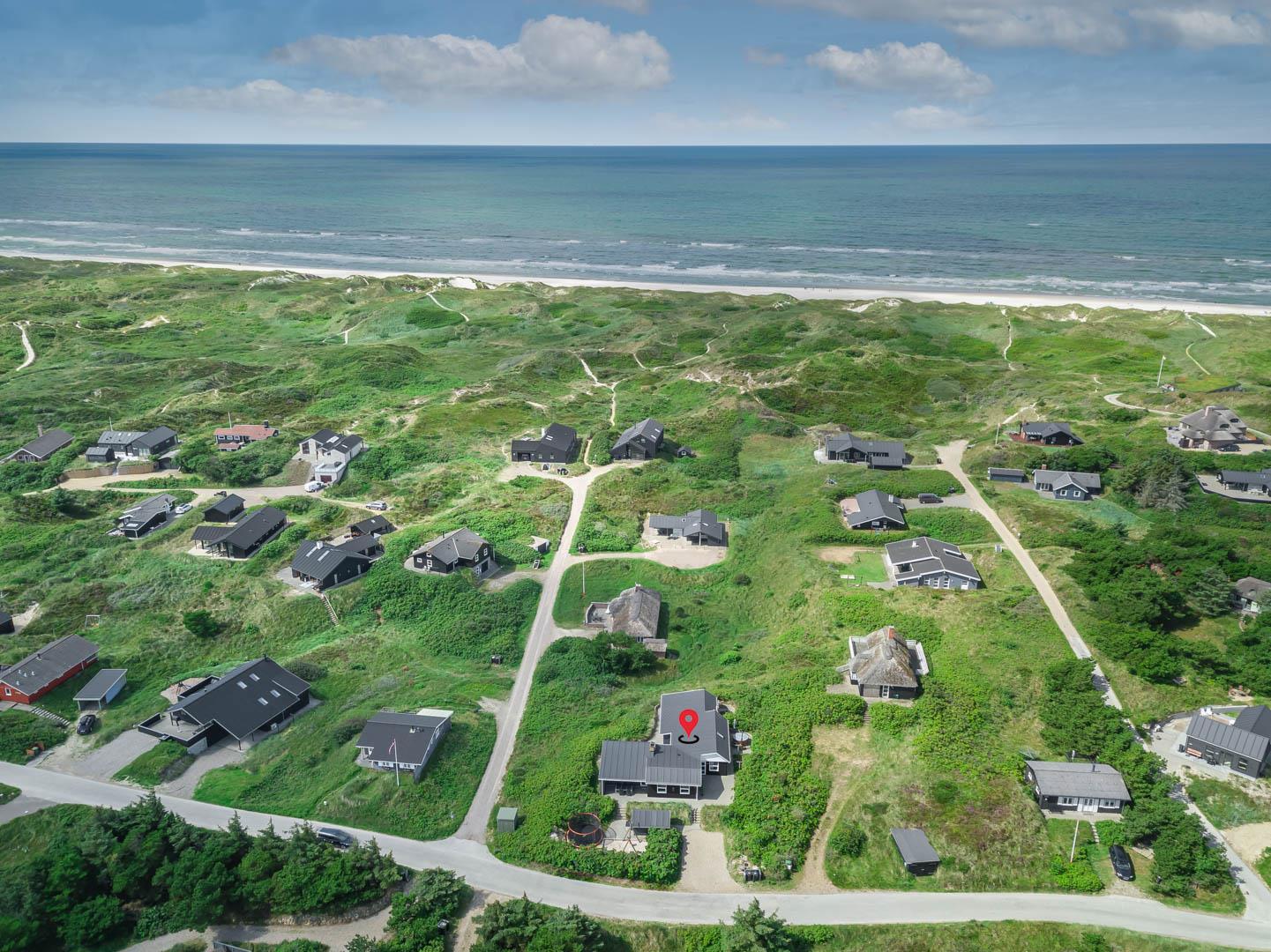 På en stor kuperet klitgrund med panoramaudsigt over områdets klitter samt sommerhusområde, ligger dette meget velholdte og yderst praktisk indrettede sommerhus med større aktivitetsrum samt vildmarksbad. Huset har i alt to komplette badeværelser - det ene med spabad samt adgang til sauna. Rummeligt køkken/alrum, stor stue med brændeovn samt varmepumpe. 5 gode soverum alle med dobbeltsenge. Fra aktivitetsrummet er der adgang til sommerhusets 1 hems, hvor børnene har alle muligheder for at hygge sig. Fra stue samt køkken er der direkte udgang til flere af sommerhusets mange terrasser. Der er opsat trampolin på grunden. Gåafstand til den dejlige, hvide badestrand ved Vesterhavet samt til den hyggelige badeby Henne Strand by med bl.a. flere gode indkøbsmuligheder samt restauranter.