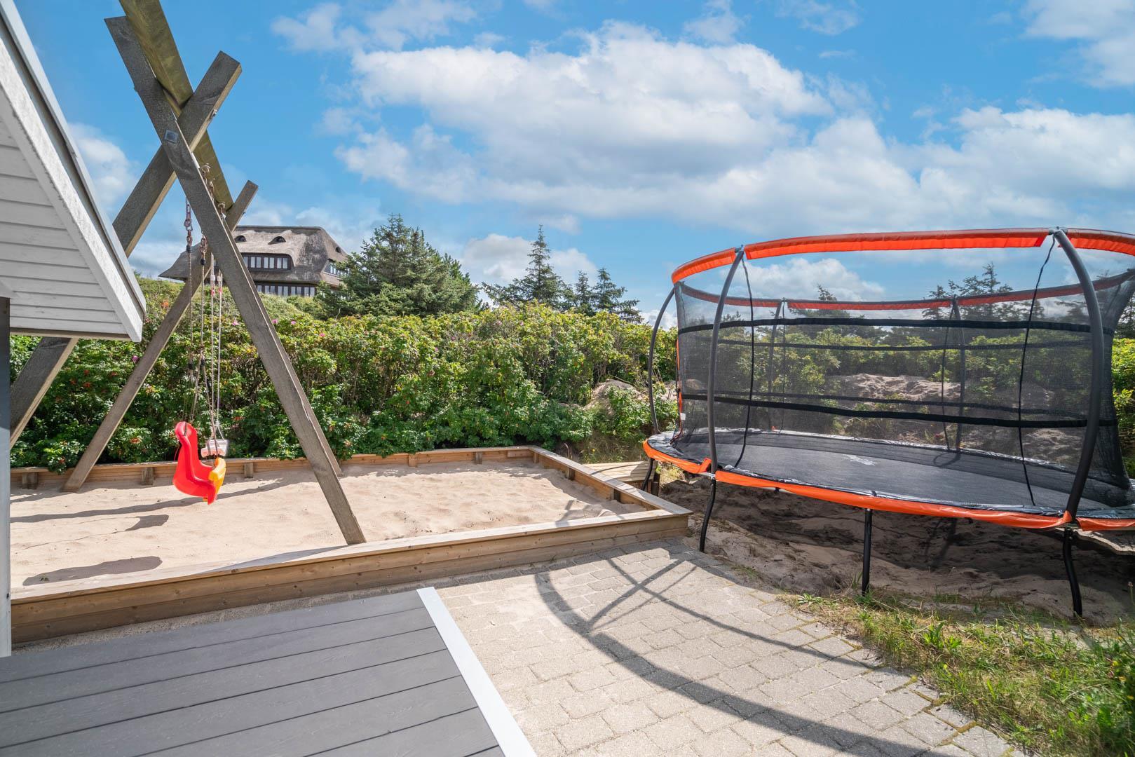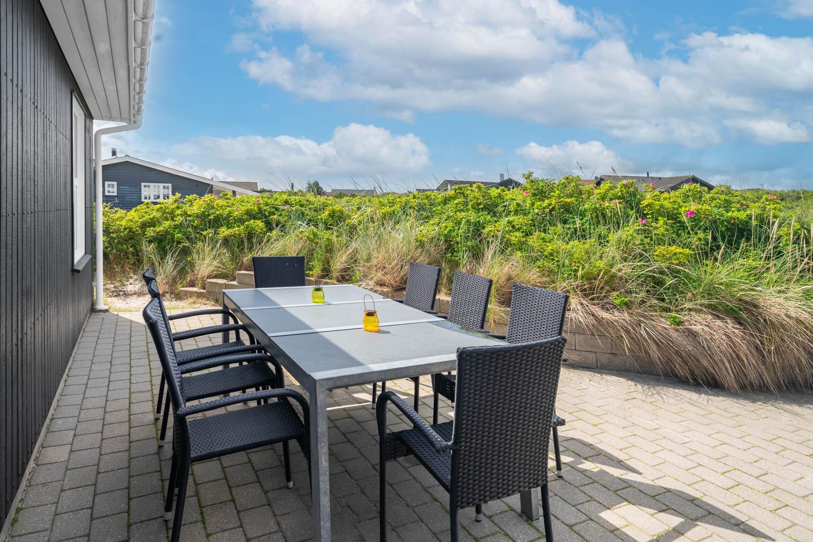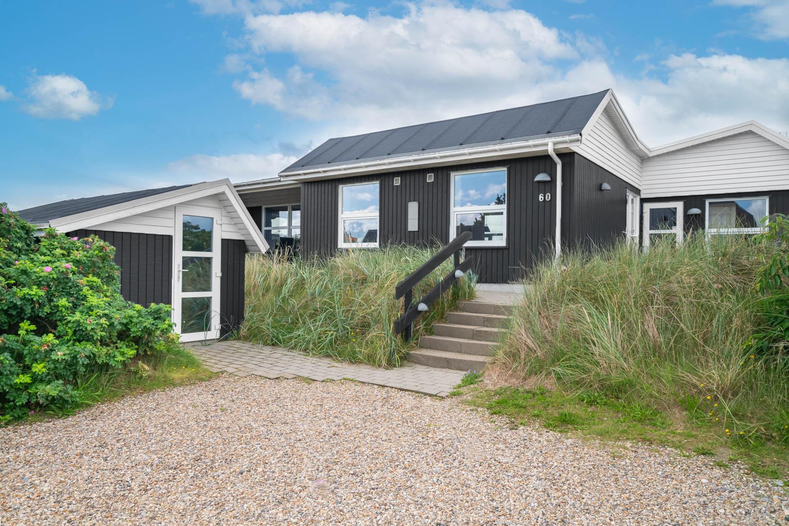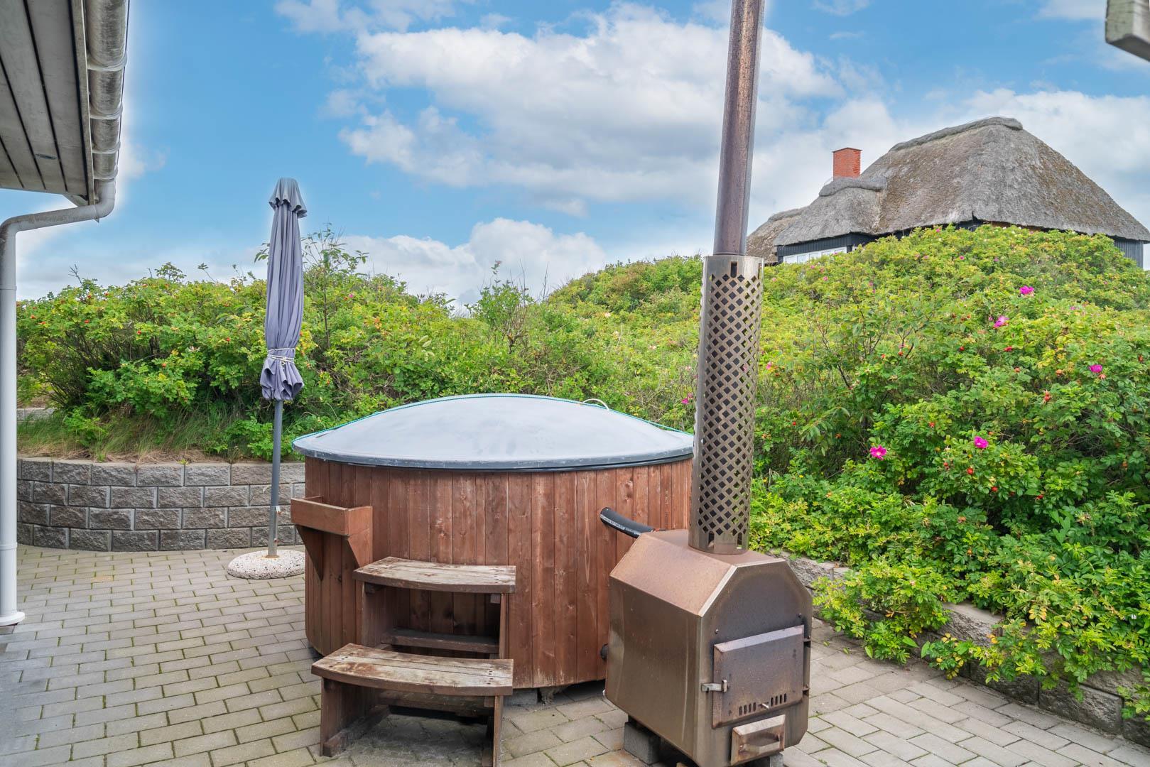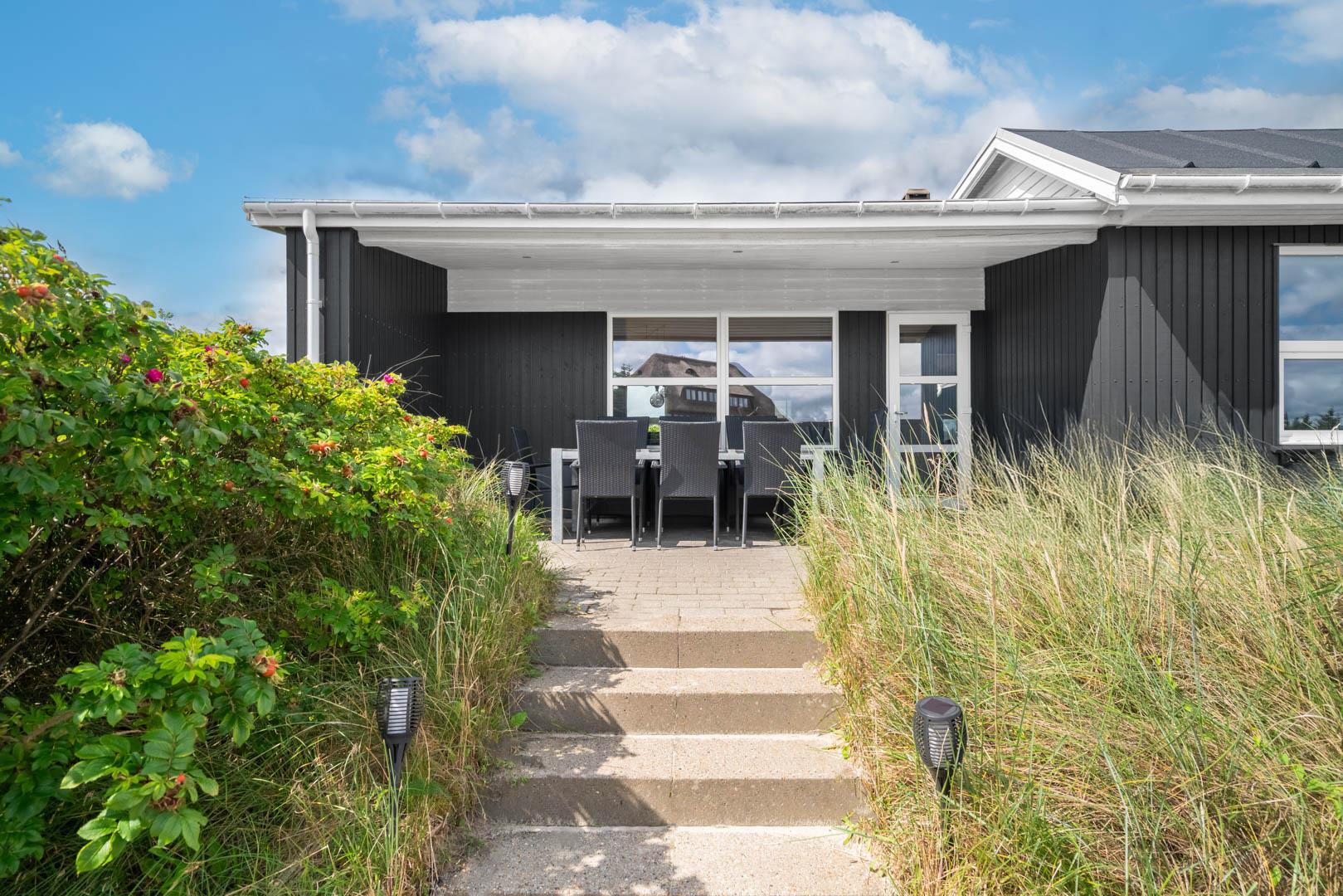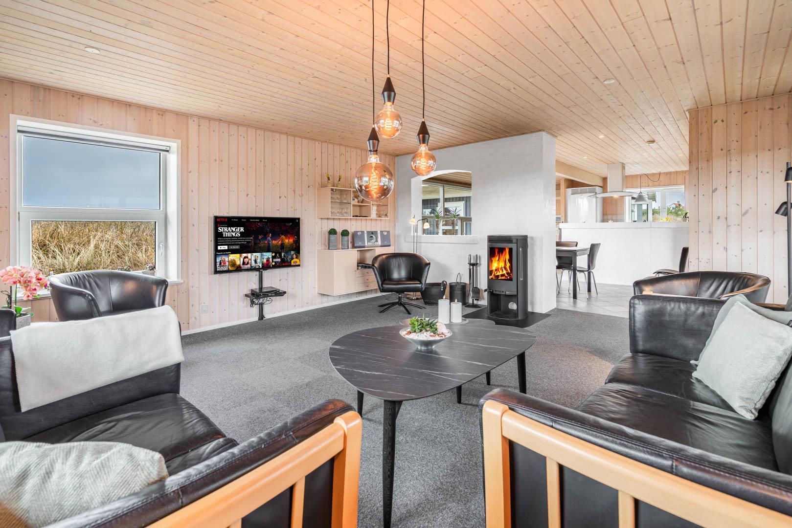 På en stor kuperet klitgrund med panoramaudsigt over områdets klitter samt sommerhusområde, ligger dette meget velholdte og yderst praktisk indrettede sommerhus med større aktivitetsrum samt vildmarksbad. Huset har i alt to komplette badeværelser - det ene med spabad samt adgang til sauna. Rummeligt køkken/alrum, stor stue med brændeovn samt varmepumpe. 5 gode soverum alle med dobbeltsenge. Fra aktivitetsrummet er der adgang til sommerhusets 1 hems, hvor børnene har alle muligheder for at hygge sig. Fra stue samt køkken er der direkte udgang til flere af sommerhusets mange terrasser. Der er opsat trampolin på grunden. Gåafstand til den dejlige, hvide badestrand ved Vesterhavet samt til den hyggelige badeby Henne Strand by med bl.a. flere gode indkøbsmuligheder samt restauranter.