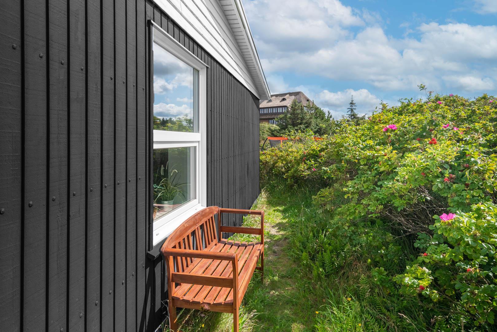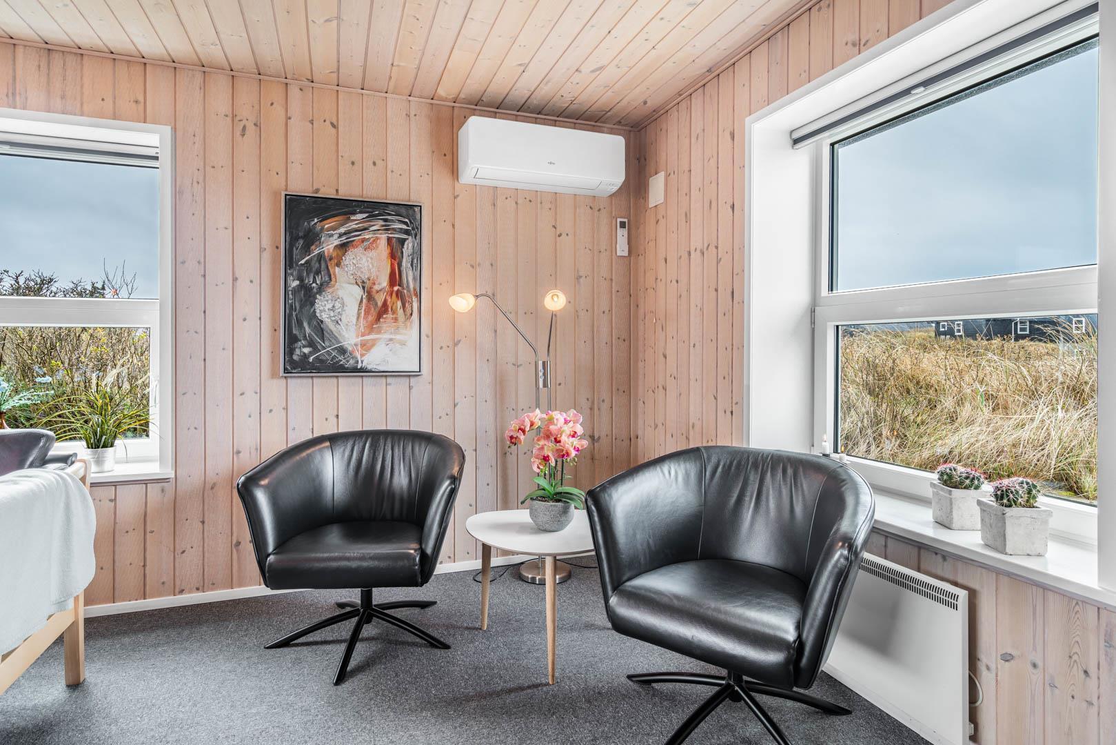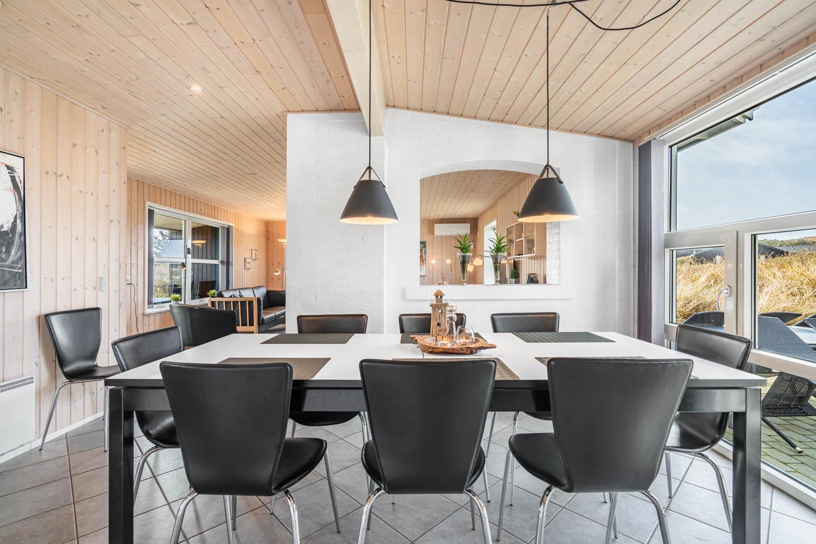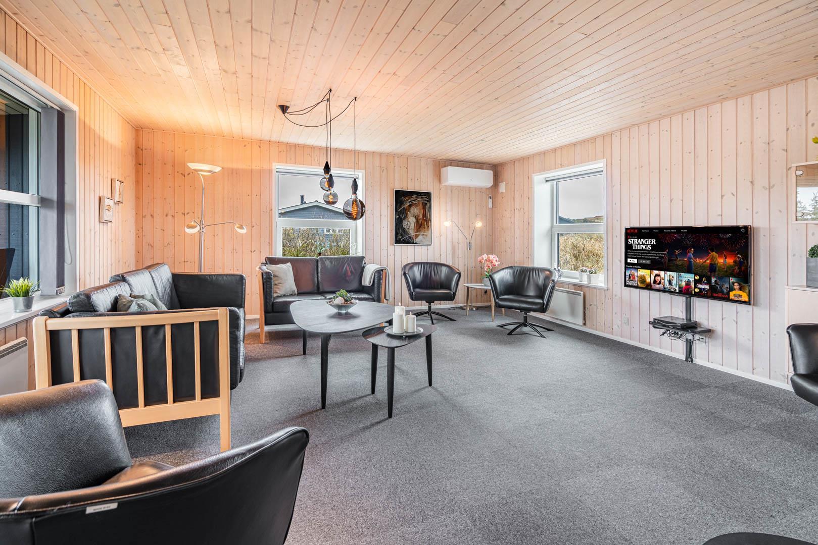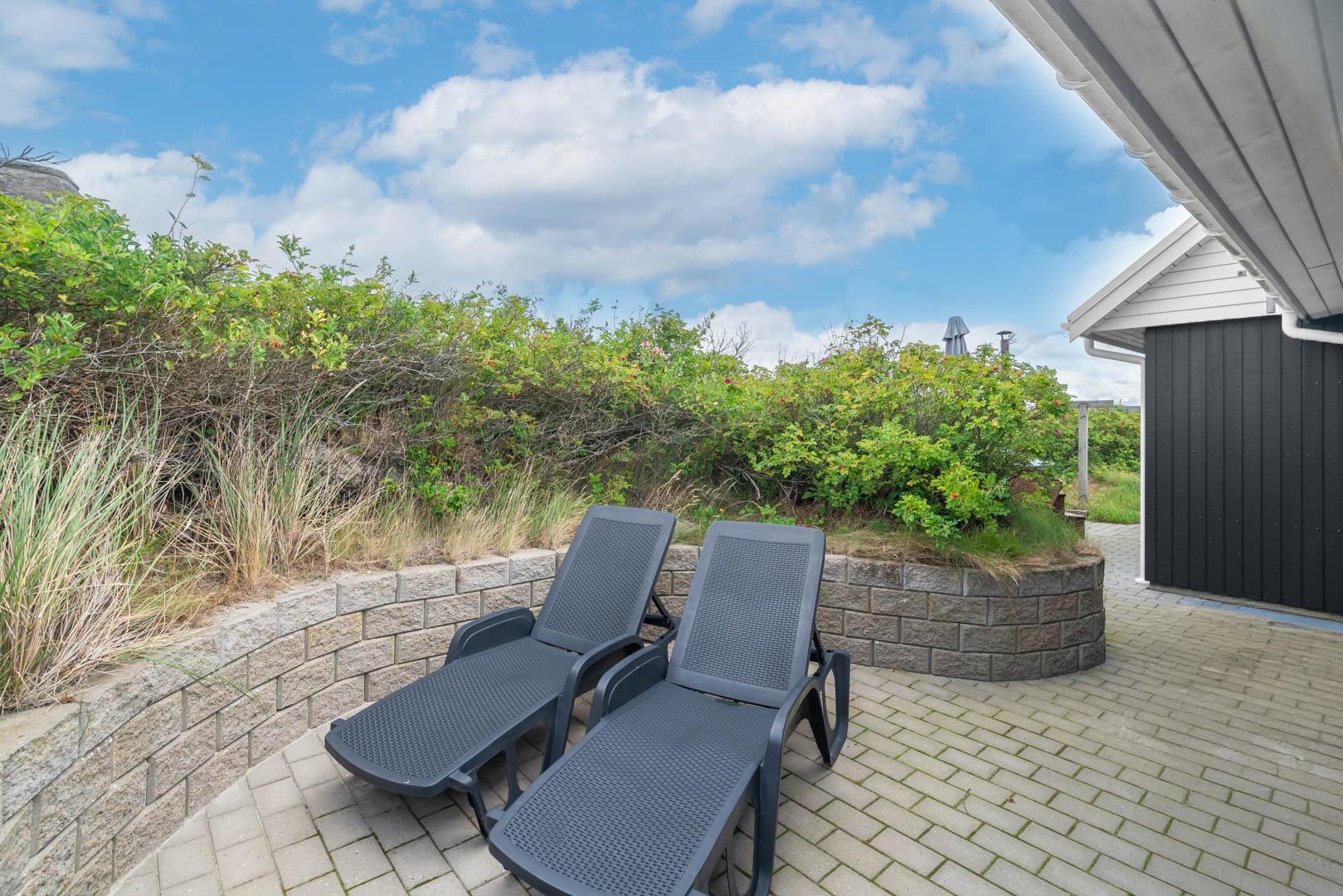 På en stor kuperet klitgrund med panoramaudsigt over områdets klitter samt sommerhusområde, ligger dette meget velholdte og yderst praktisk indrettede sommerhus med større aktivitetsrum samt vildmarksbad. Huset har i alt to komplette badeværelser - det ene med spabad samt adgang til sauna. Rummeligt køkken/alrum, stor stue med brændeovn samt varmepumpe. 5 gode soverum alle med dobbeltsenge. Fra aktivitetsrummet er der adgang til sommerhusets 1 hems, hvor børnene har alle muligheder for at hygge sig. Fra stue samt køkken er der direkte udgang til flere af sommerhusets mange terrasser. Der er opsat trampolin på grunden. Gåafstand til den dejlige, hvide badestrand ved Vesterhavet samt til den hyggelige badeby Henne Strand by med bl.a. flere gode indkøbsmuligheder samt restauranter.