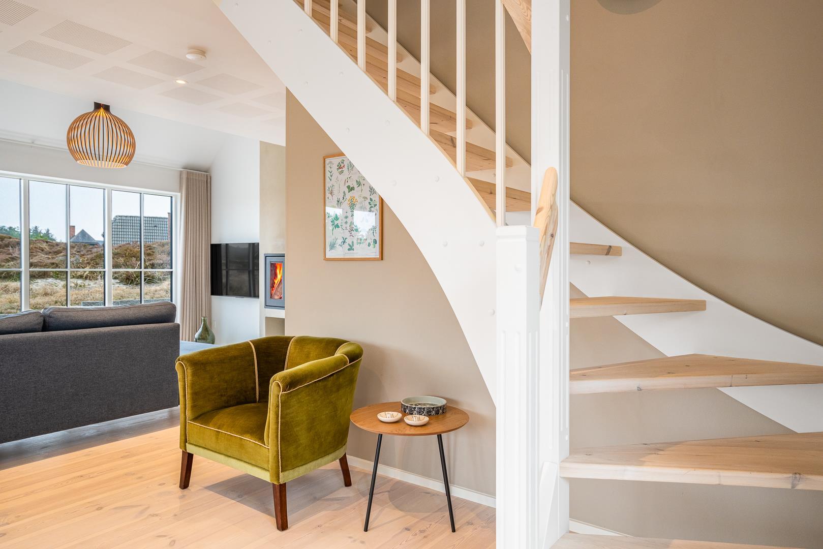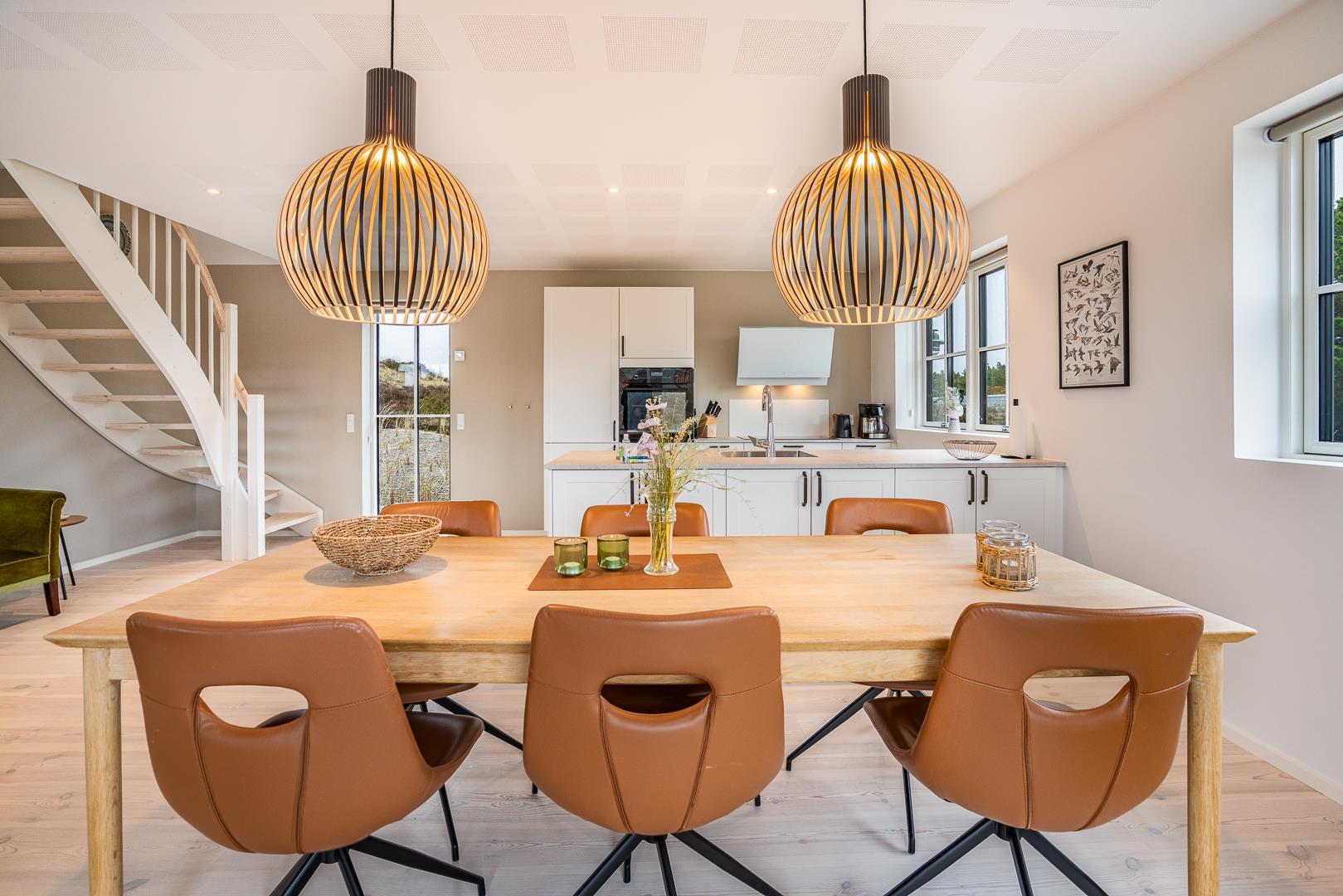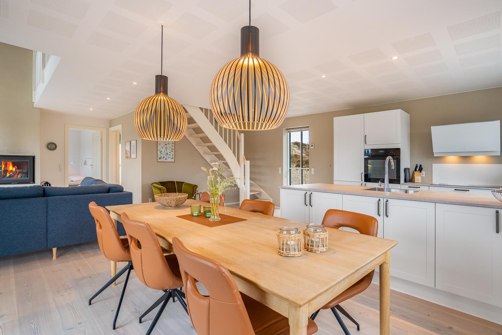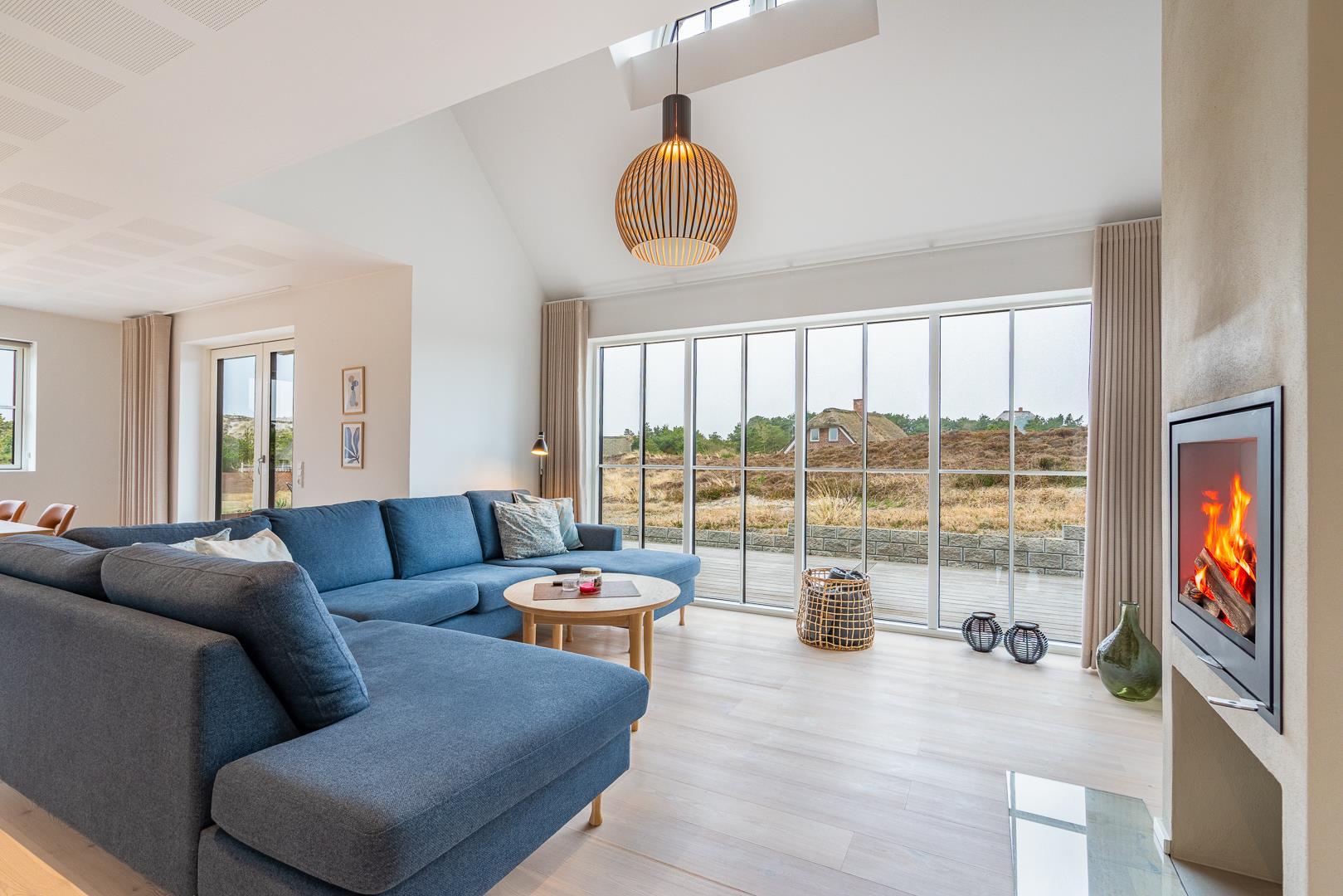 De store vinduespartier giver stuen et lyst og indbydende udtryk. Her kan du slappe af med familien – og når vejret er køligt, spreder brændeovnen en dejlig varme og hyggelig stemning.