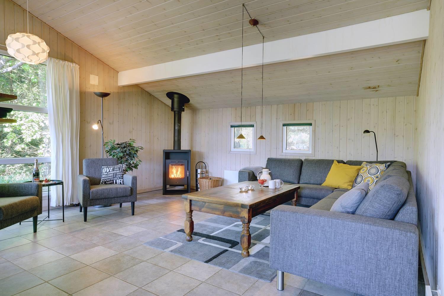 Opholdsrummet er åbent indrettet og indbyder til samvær. På køligere dage sørger brændeovn for varme og en ekstra hyggelig atmosfære, mens store vinduer fylder rummet med dagslys. Uanset om det er en rolig aften med en bog, brætspil eller afslapning efter en dag på stranden, finder alle deres favoritplads her.