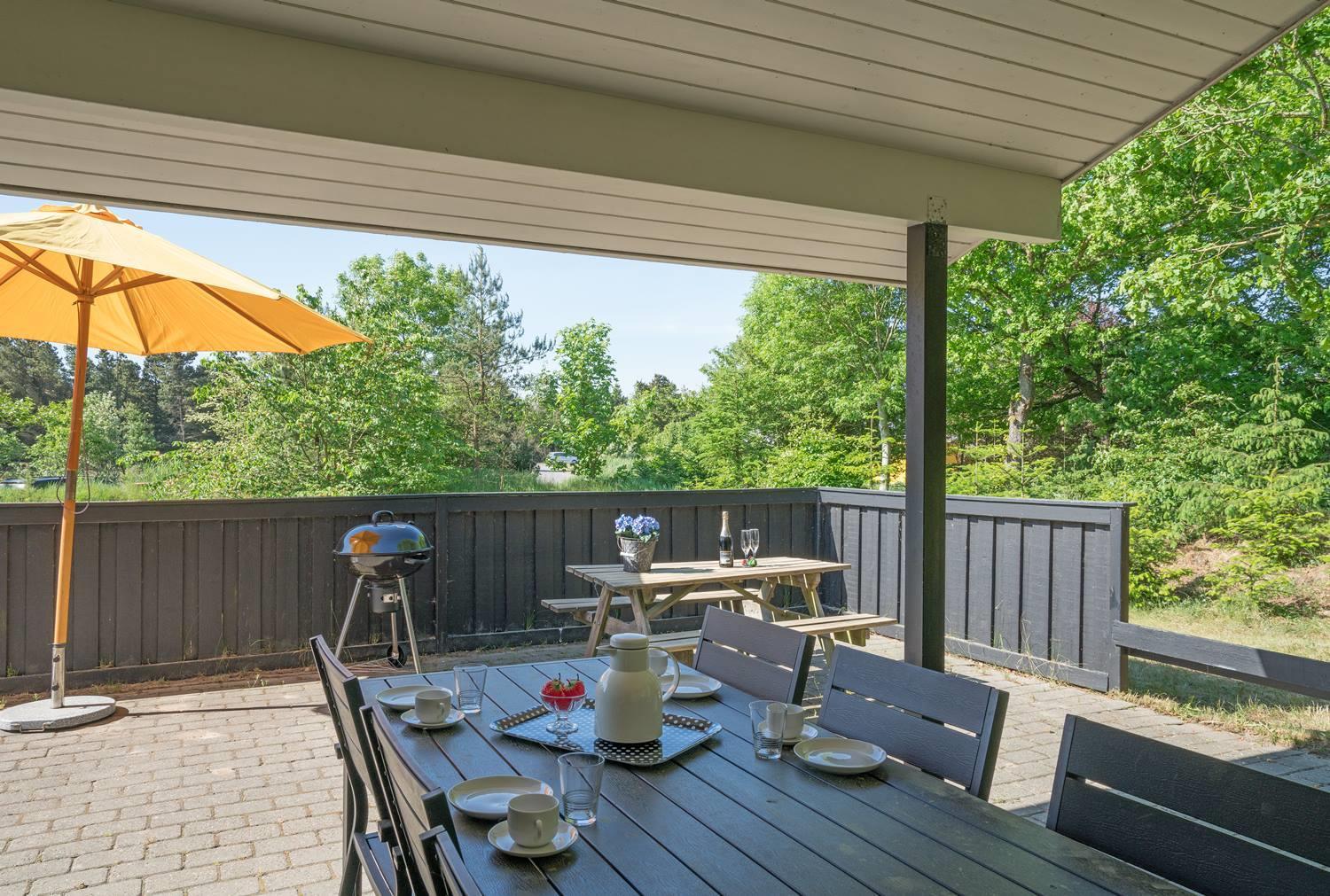 Udendørs venter en overdækket terrasse, og børnene kan glæde sig over gyngen og sandkassen, mens skuret giver plads til cykler, grill eller strandudstyr.