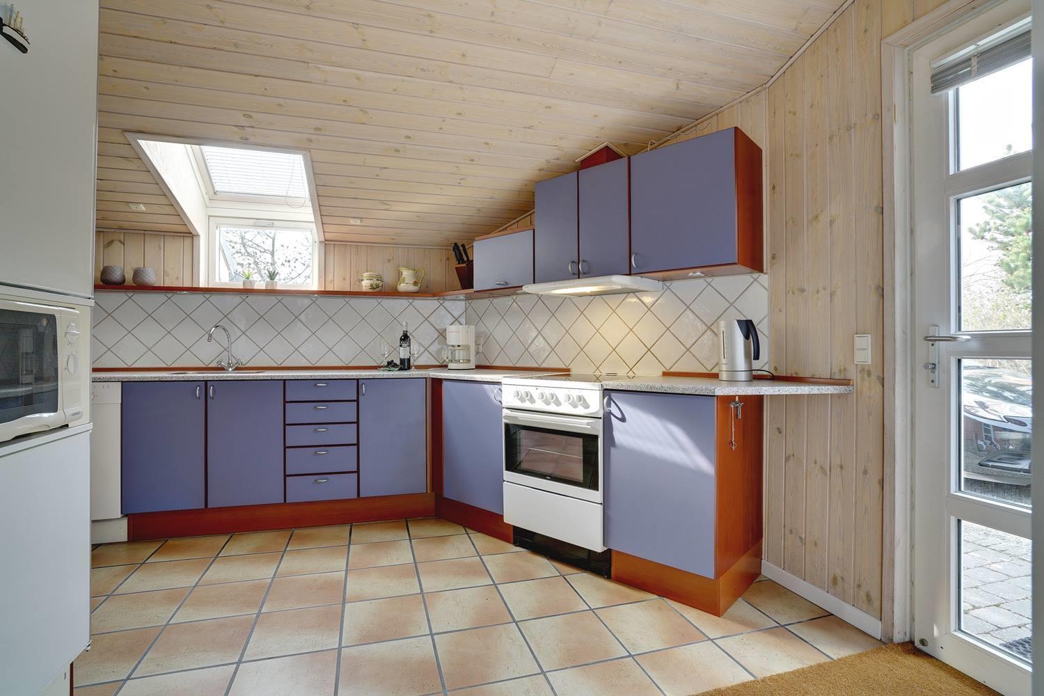 Dejligt feriehus som er blevet moderniseret, er beliggende på en sydvendt grund på en blind stikvej tæt på havet og centrum. Stort, lækkert køkken/alrum med klinkegulv. Fra stuen er der udgang til terrassen, som er delvis overdækket, og hvor også sandkassen er placeret. Gyngen befinder sig bag huset. Badeværelse med god, stor sauna og spabad. Toilet er lavet i separat rum. 3 soverum med nye senge.