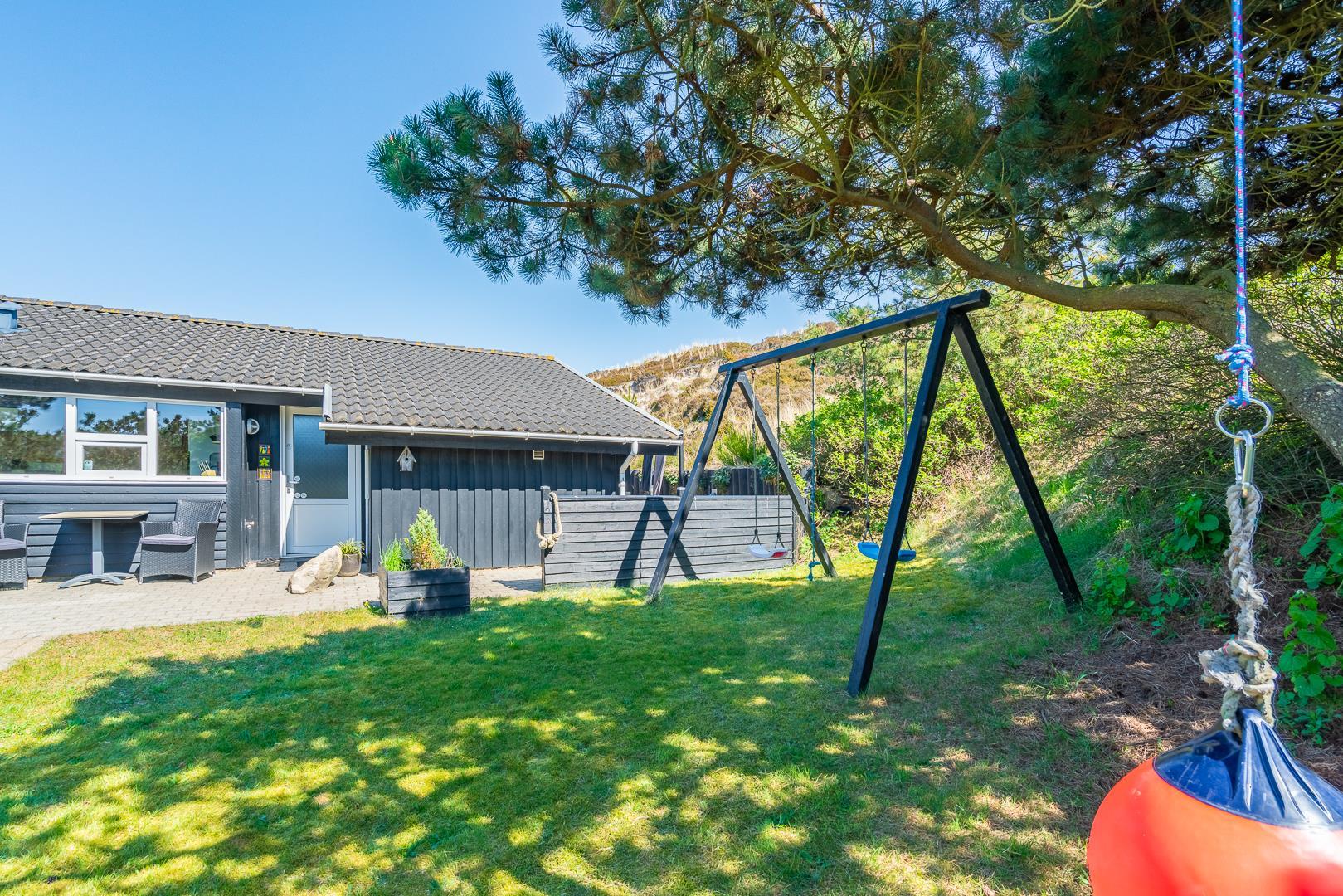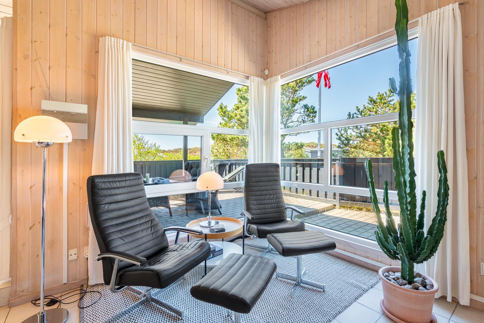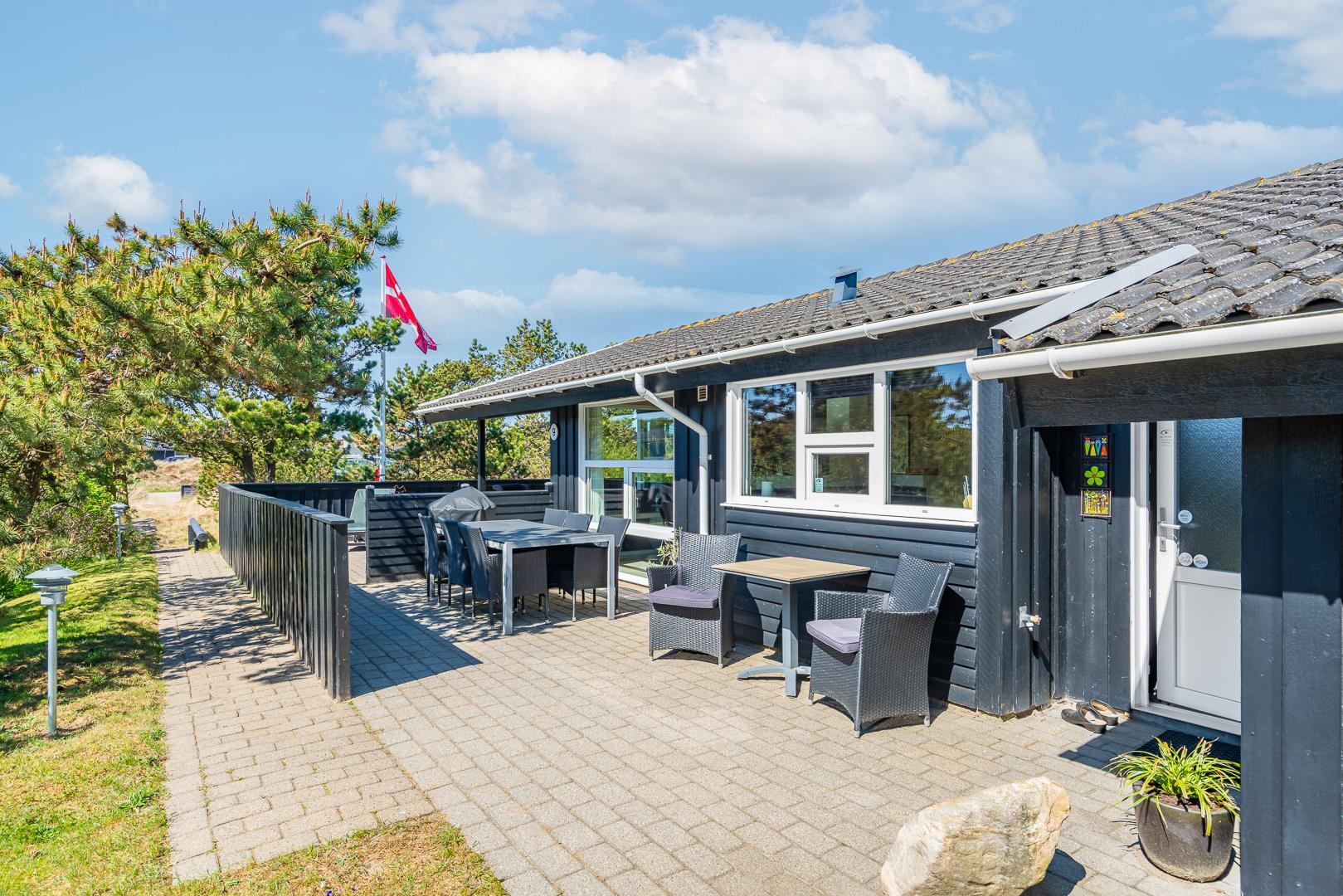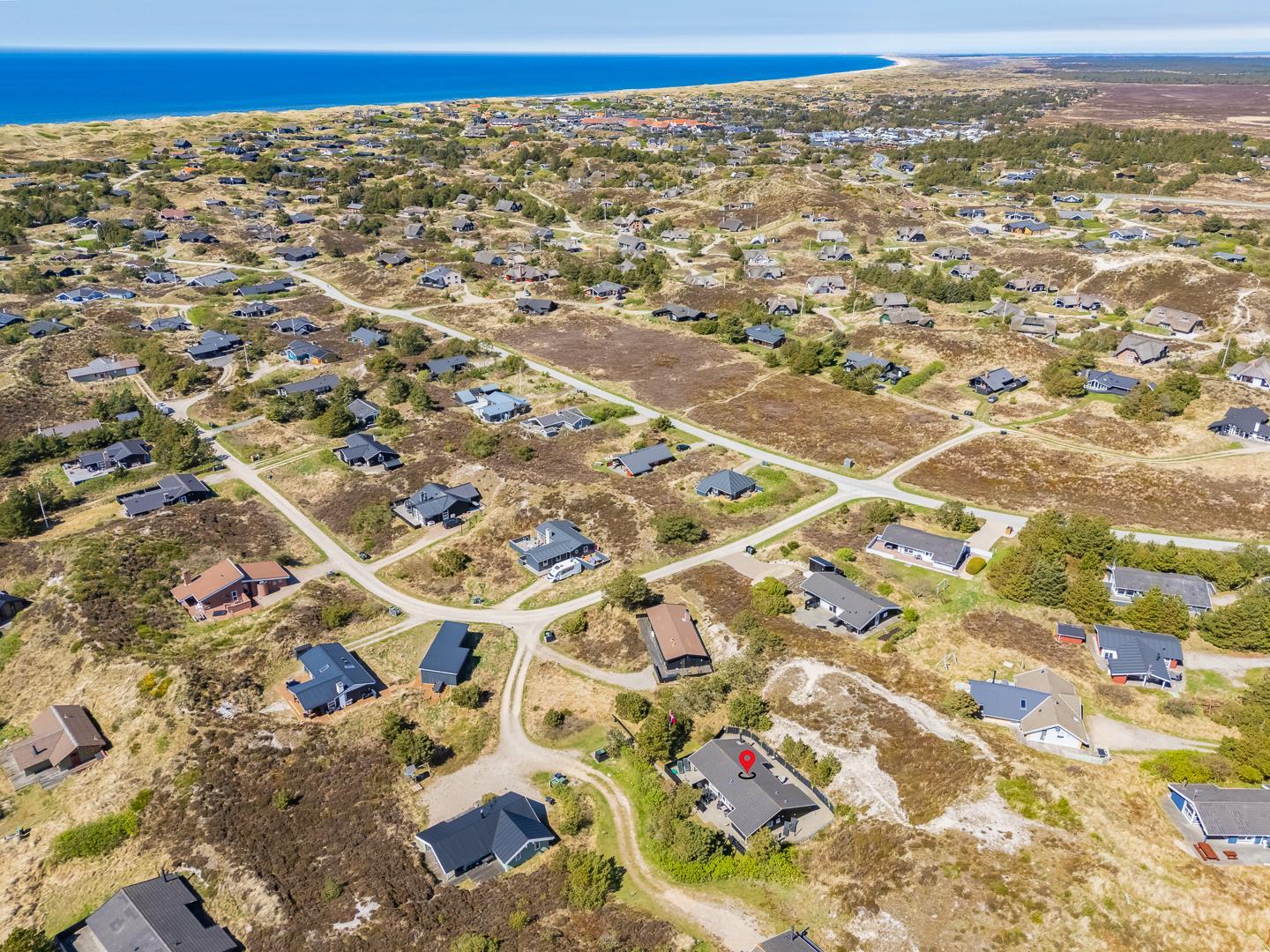Lækkert feriehus beliggende på en pragtfuld og rolig klitgrund for enden af blind vej. Huset er meget smagfuldt indrettet med gode kvalitets møbler. Fra det lyse køkken/alrum er der direkte udgang til stor dejlig ugeneret terrasse, hvor der er altid er mulighed for at finde en god lækrog. Der er 3 gode soverum i to er der ligeledes TV. Der er stort vinduesparti som giver i godt lysindfald ind i huset. IKKE RYGERHUS