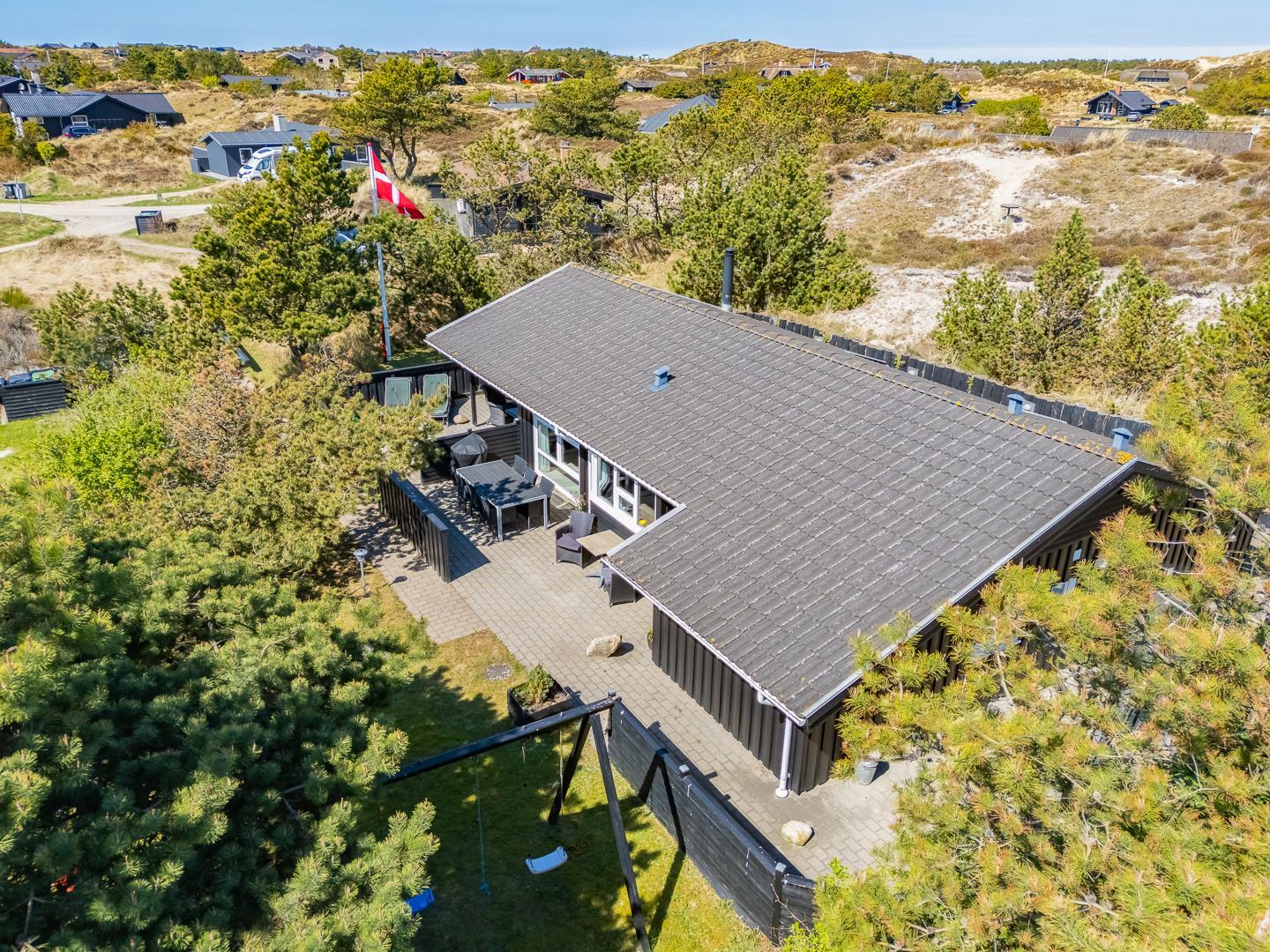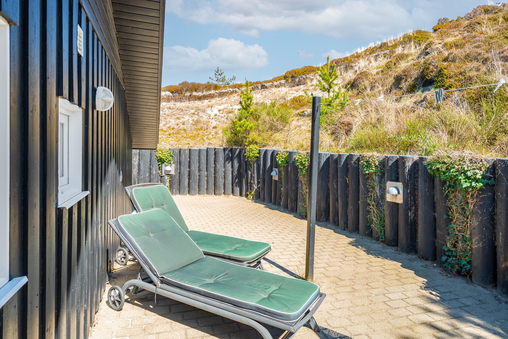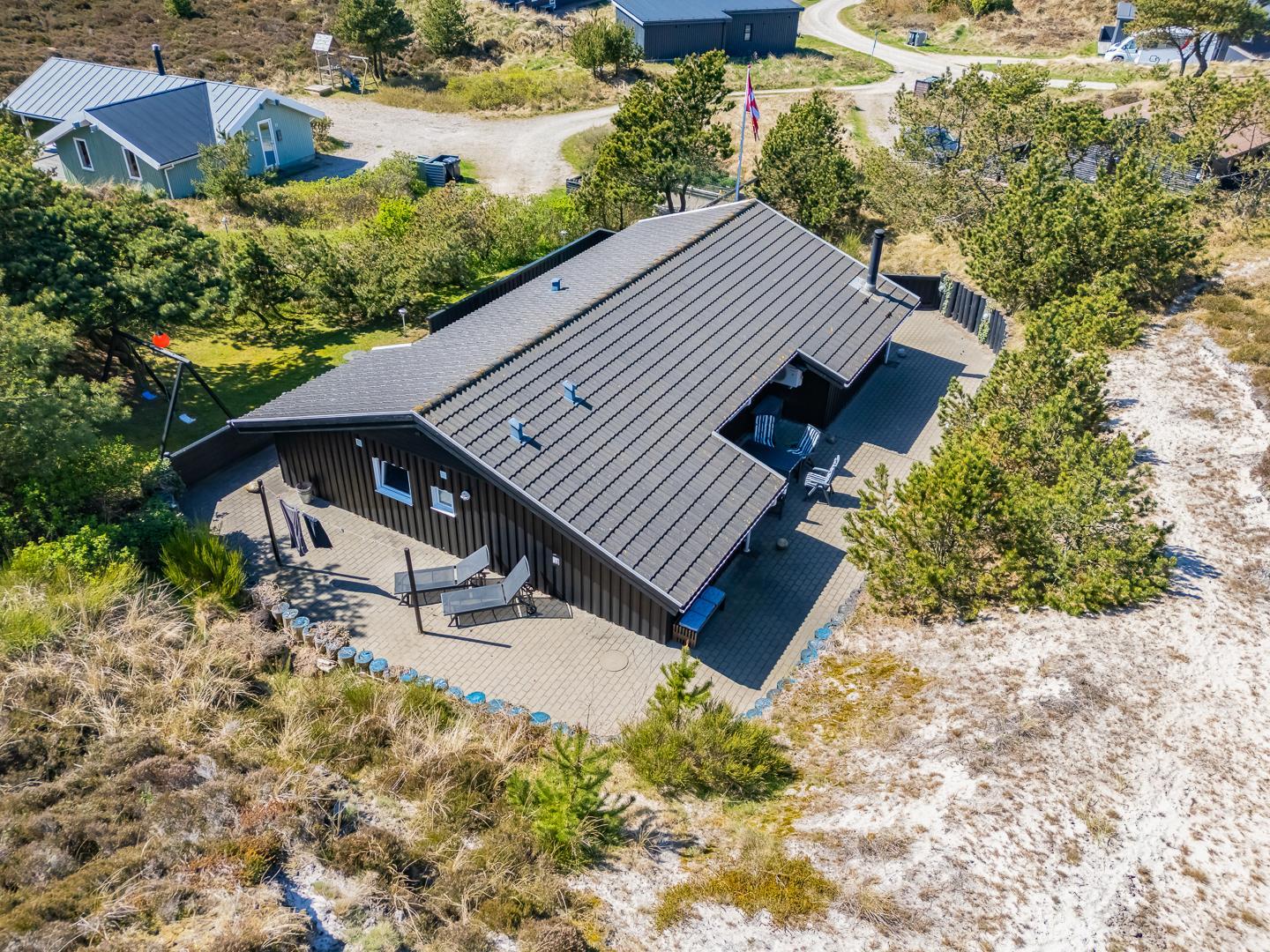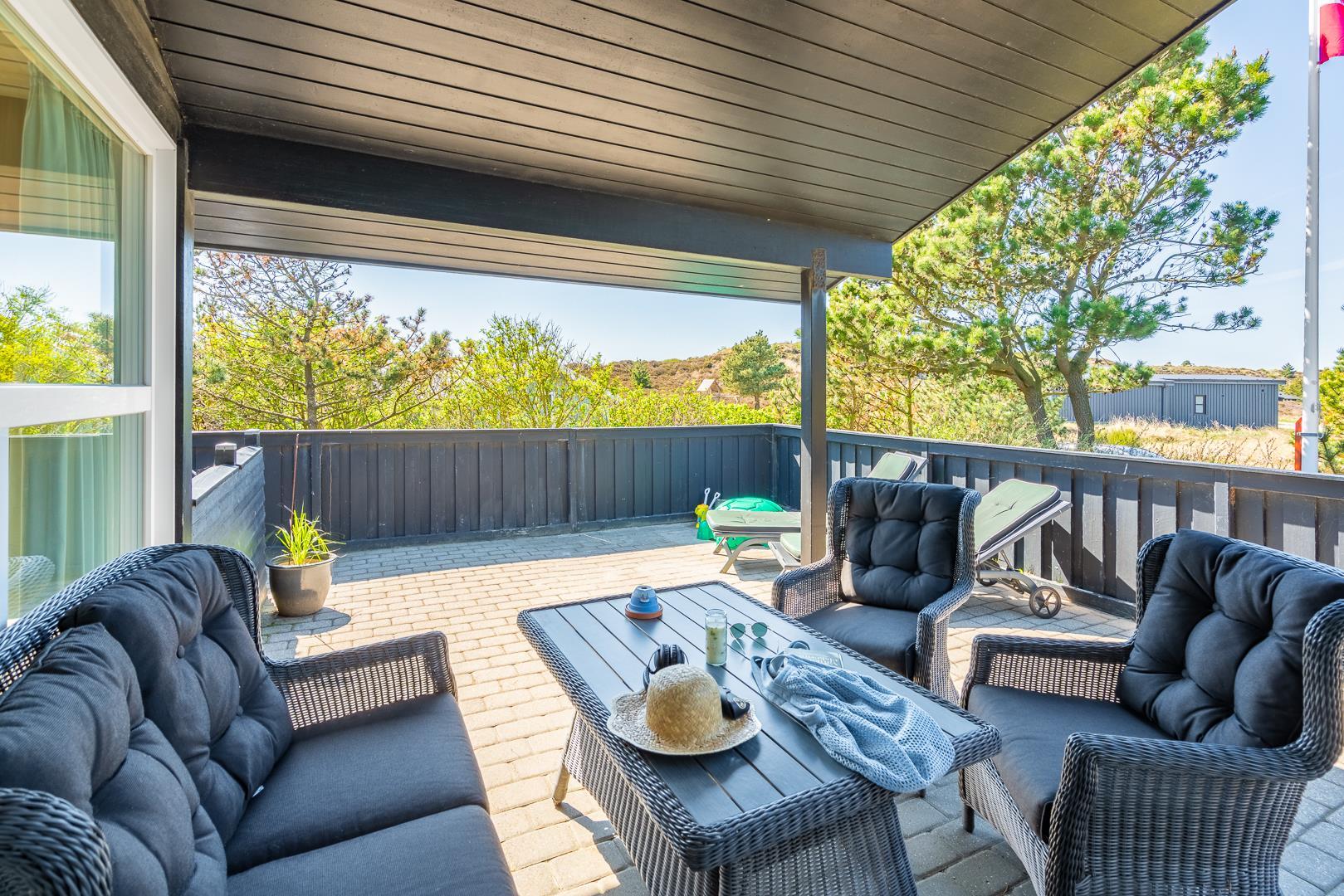 Lækkert feriehus i roligt klitområde med stor terrasse og sauna, perfekt til afslapning nær Henne Strand.
