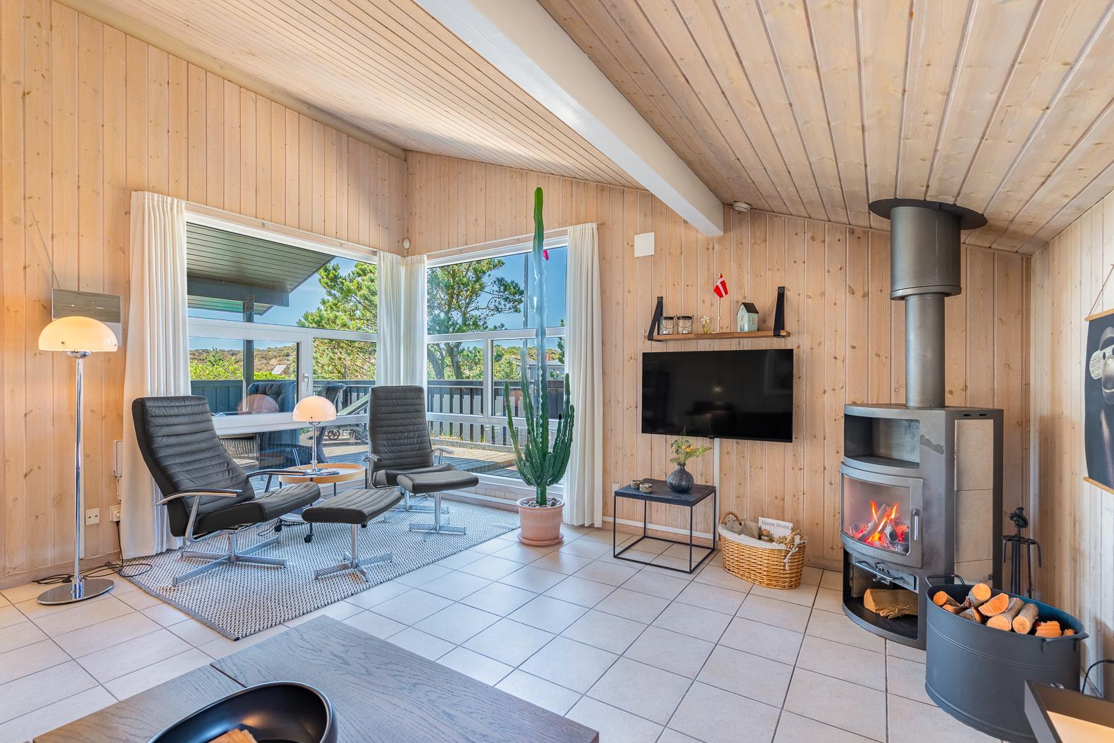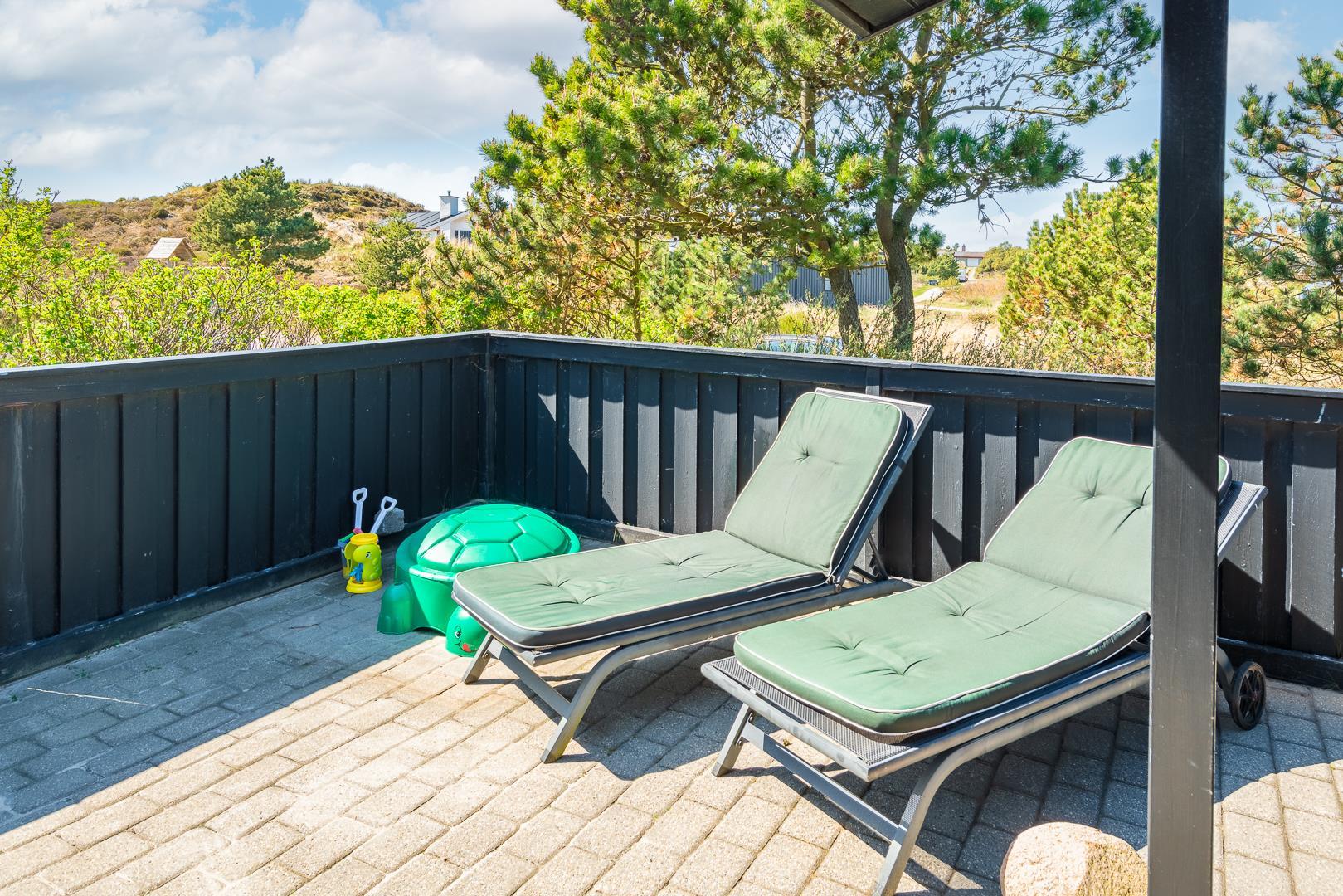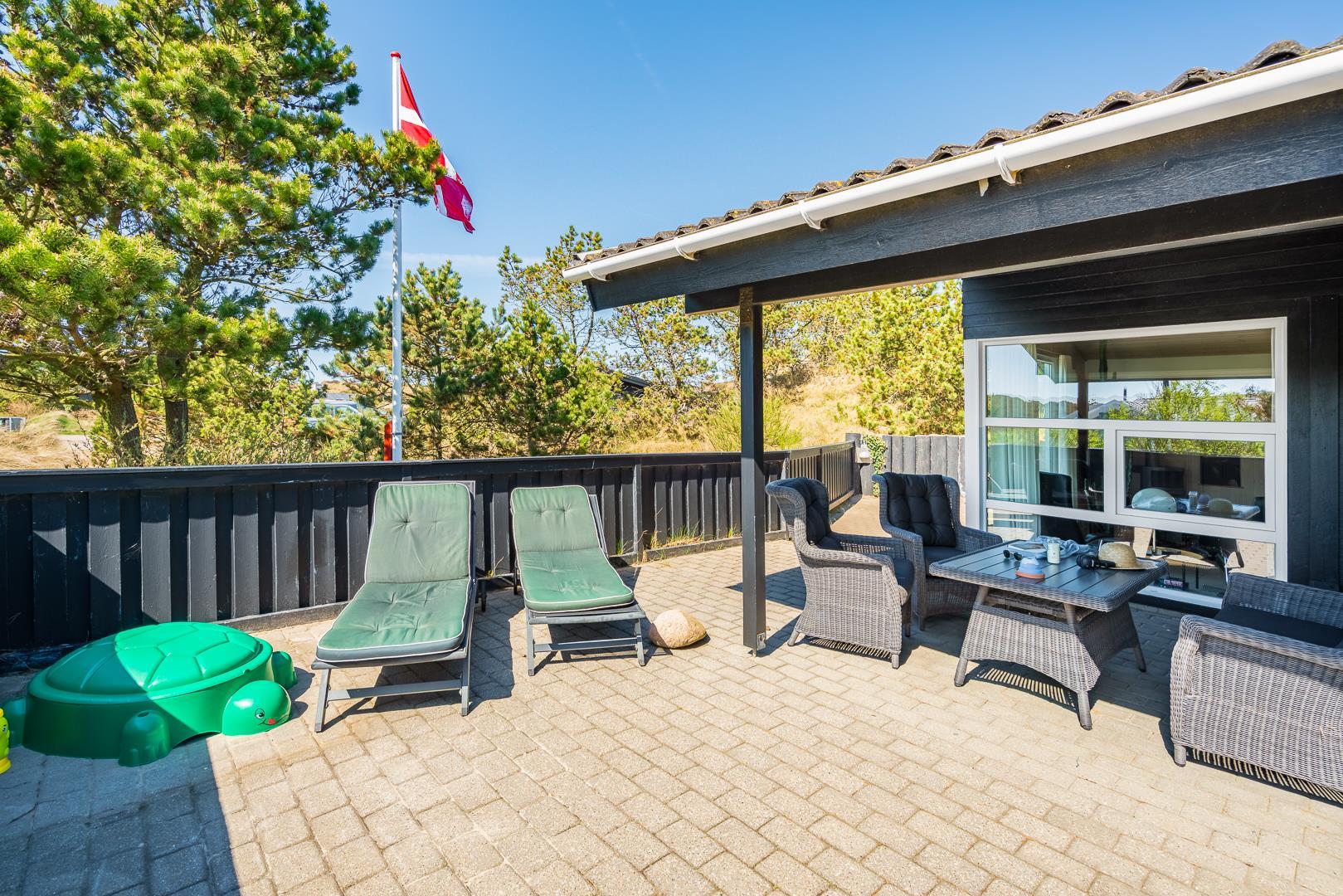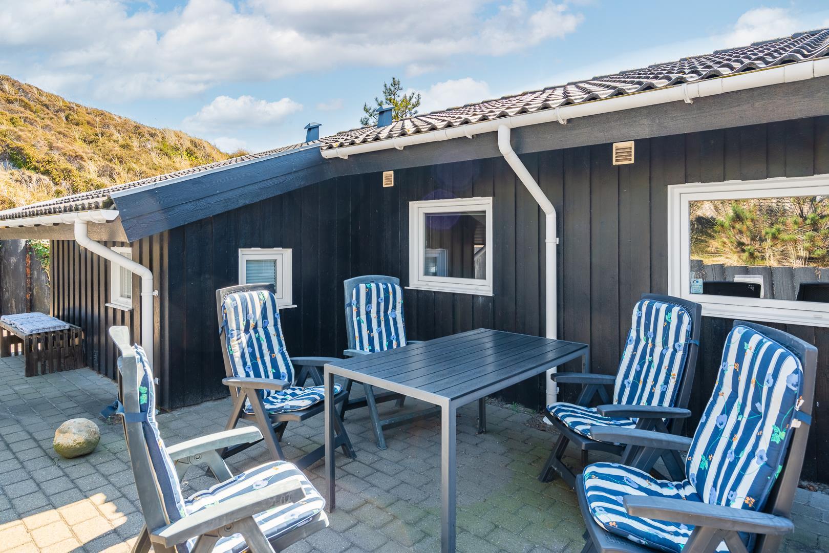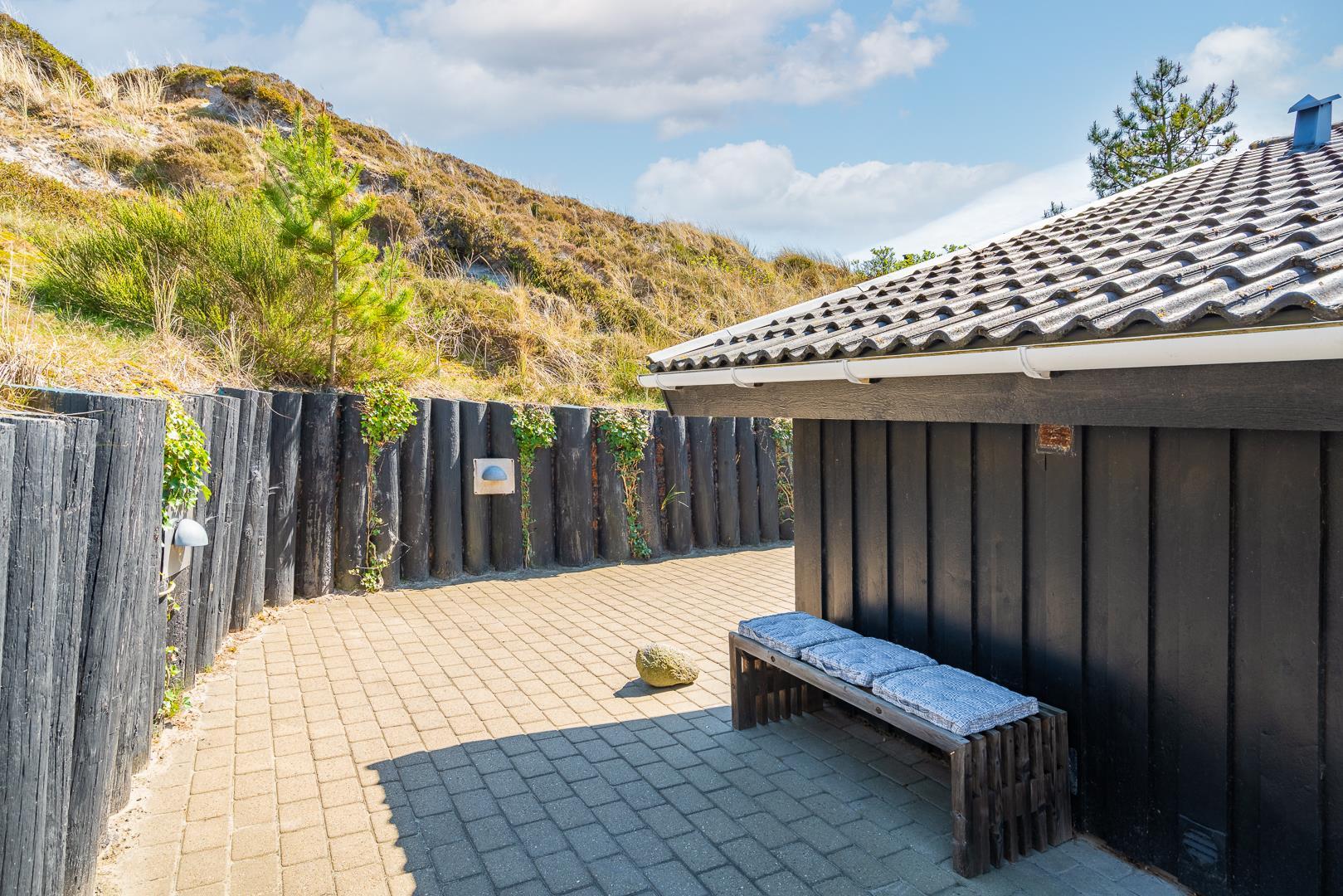 Lækkert feriehus i roligt klitområde med stor terrasse og sauna, perfekt til afslapning nær Henne Strand.