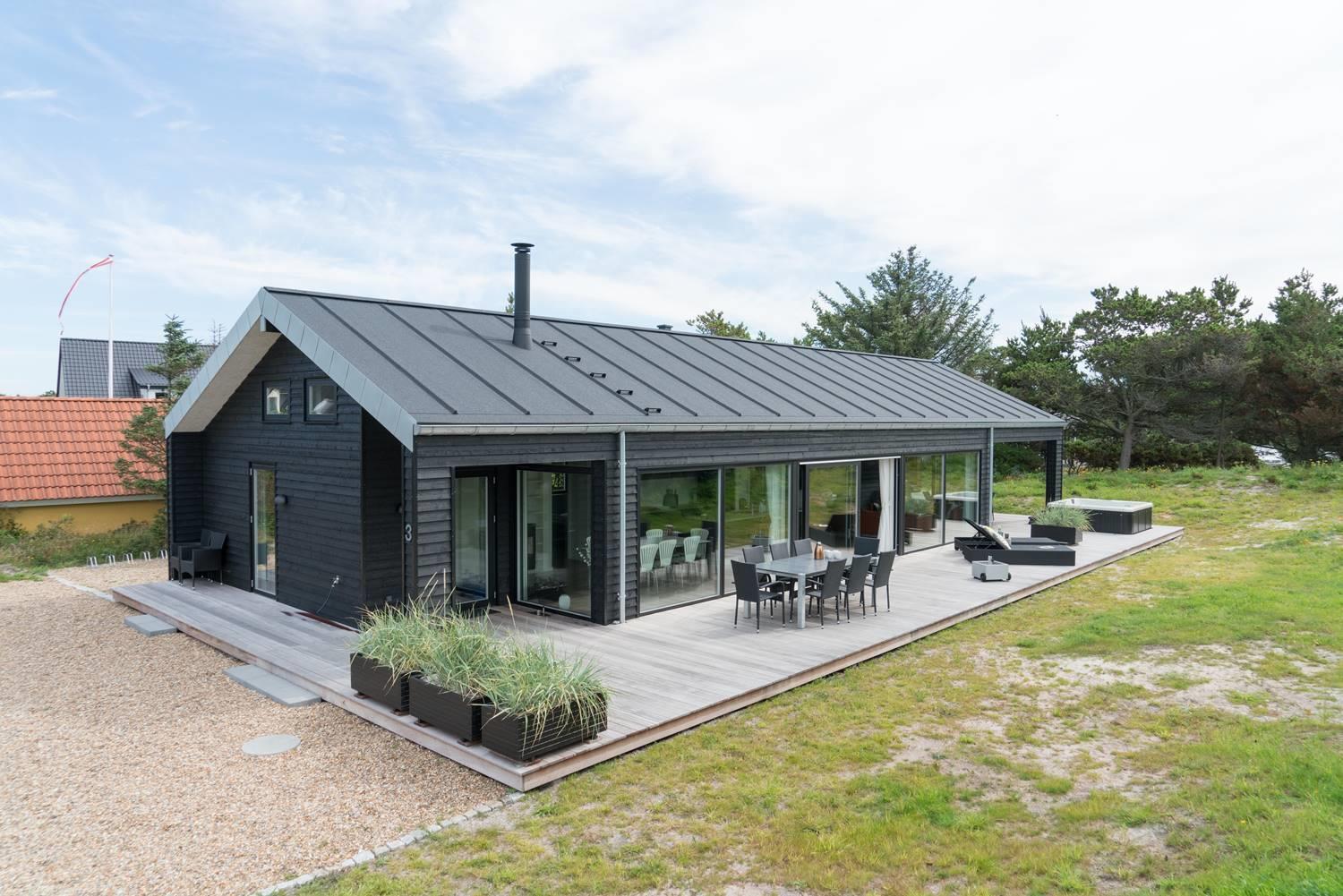 Dette pragtfulde nybyggede feriehus på Gyvelvej 3 - Henne Strand har både udendørs spa og sauna. Der er energibesparende varmepumpe i huset.