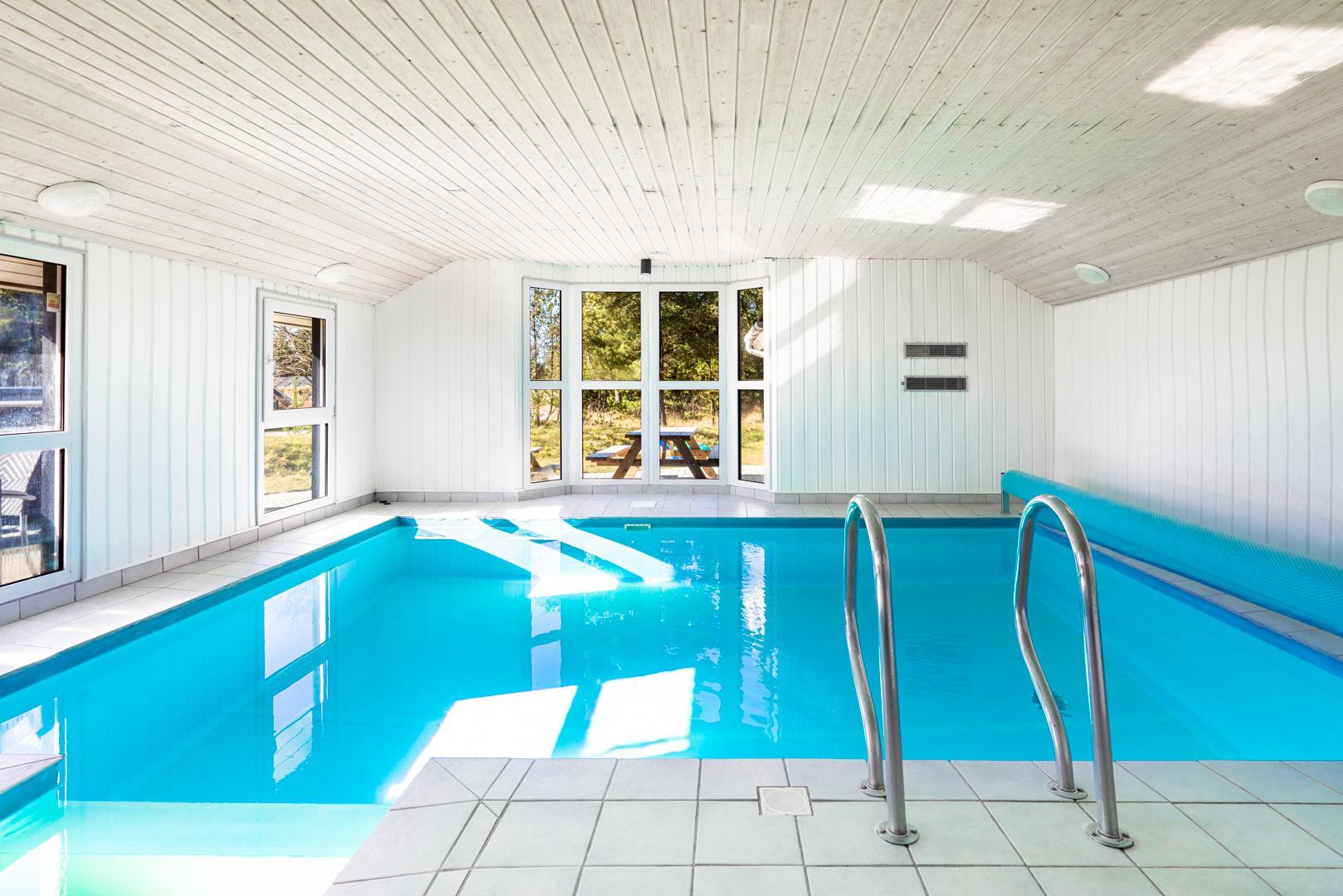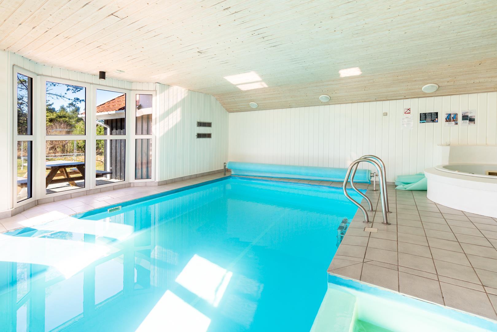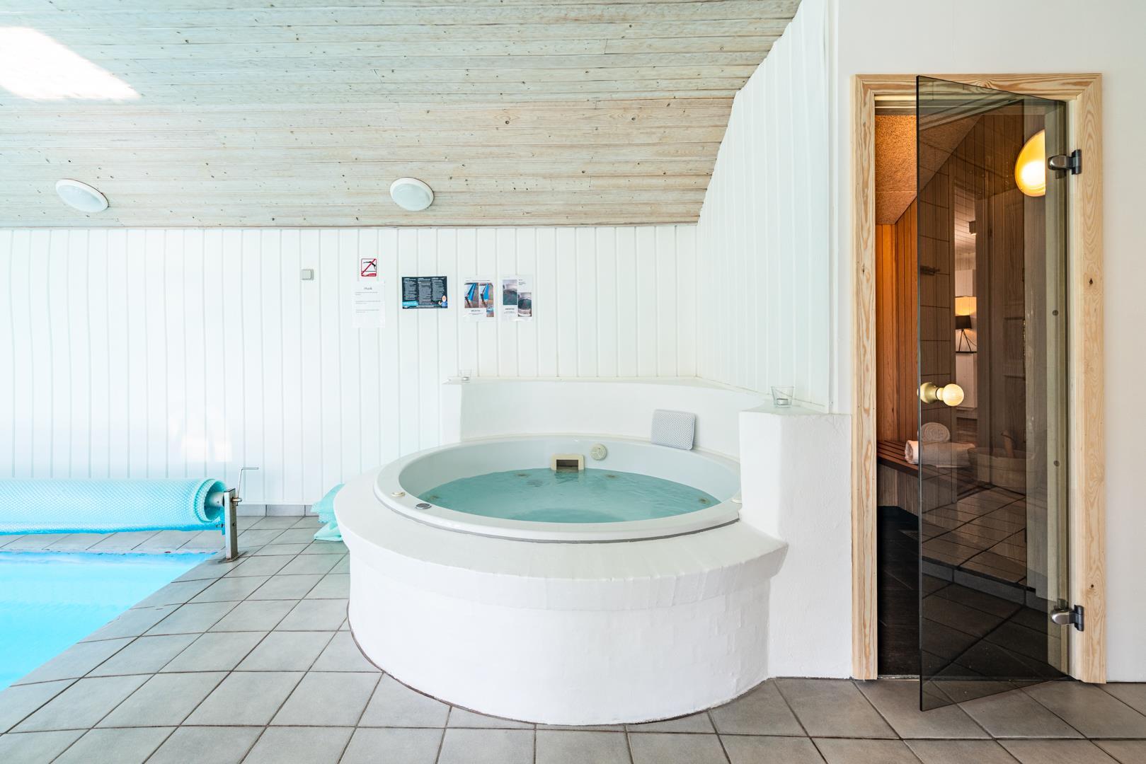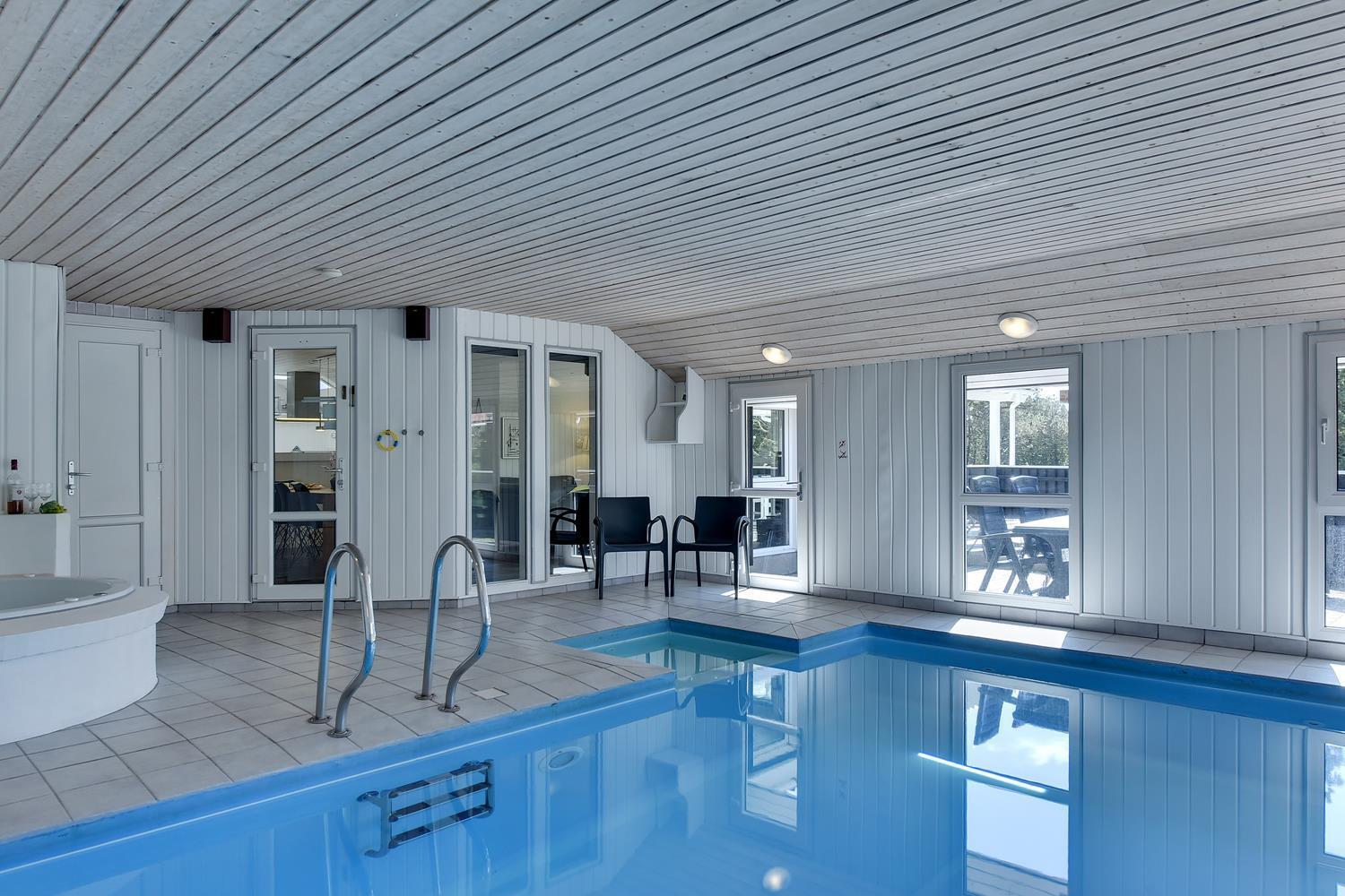 I det store swimmingpoolrum er den stor swimmingpool (4,0 x 6,0 m) Desuden er der en lille børnepool til de mindste, 6-pers. spa og direkte adgang til et af husets badeværelser, som er udstyret med bruser og sauna. Udenfor er der tænkt på husets små gæster, så her er der gynge og sandkasse.