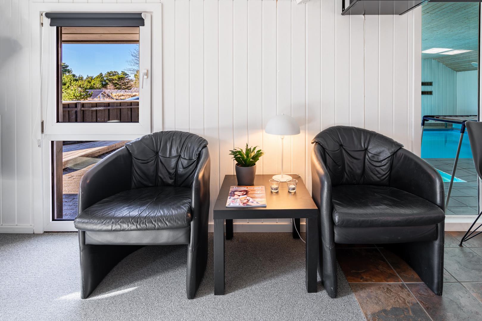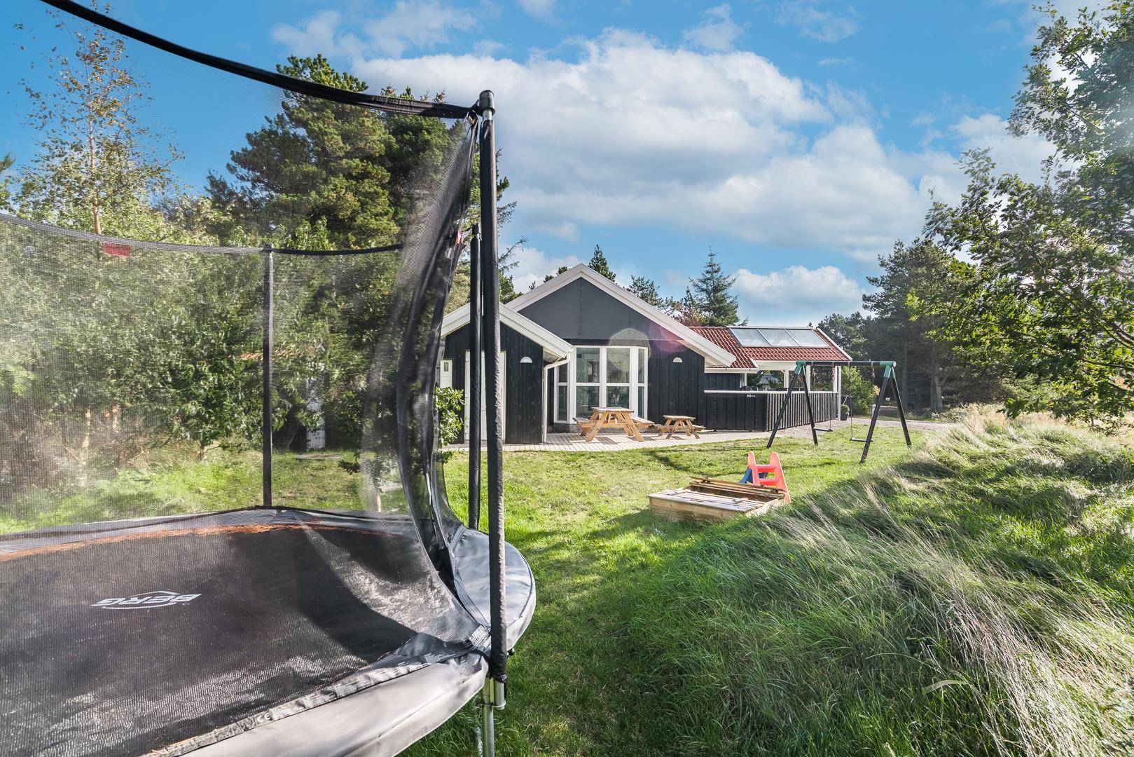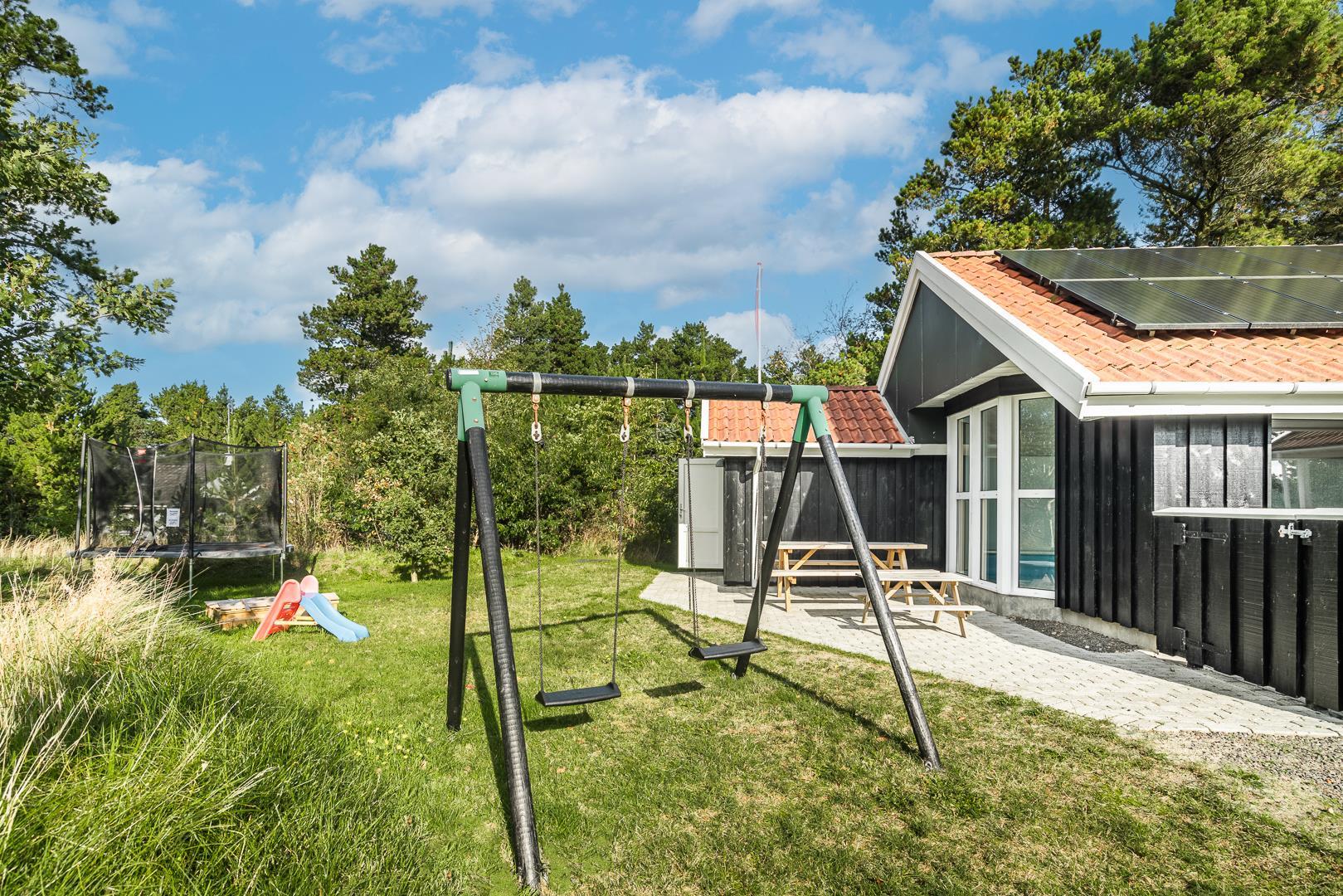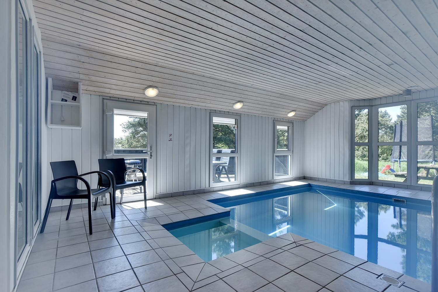 I det store swimmingpoolrum er den stor swimmingpool (4,0 x 6,0 m) Desuden er der en lille børnepool til de mindste, 6-pers. spa og direkte adgang til et af husets badeværelser, som er udstyret med bruser og sauna. Udenfor er der tænkt på husets små gæster, så her er der gynge og sandkasse.